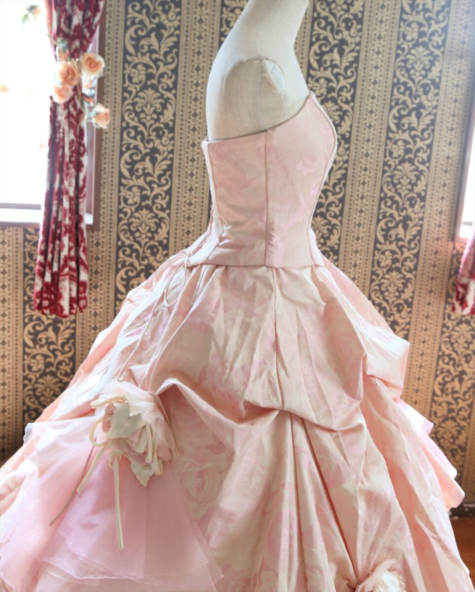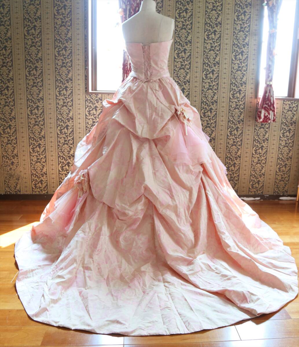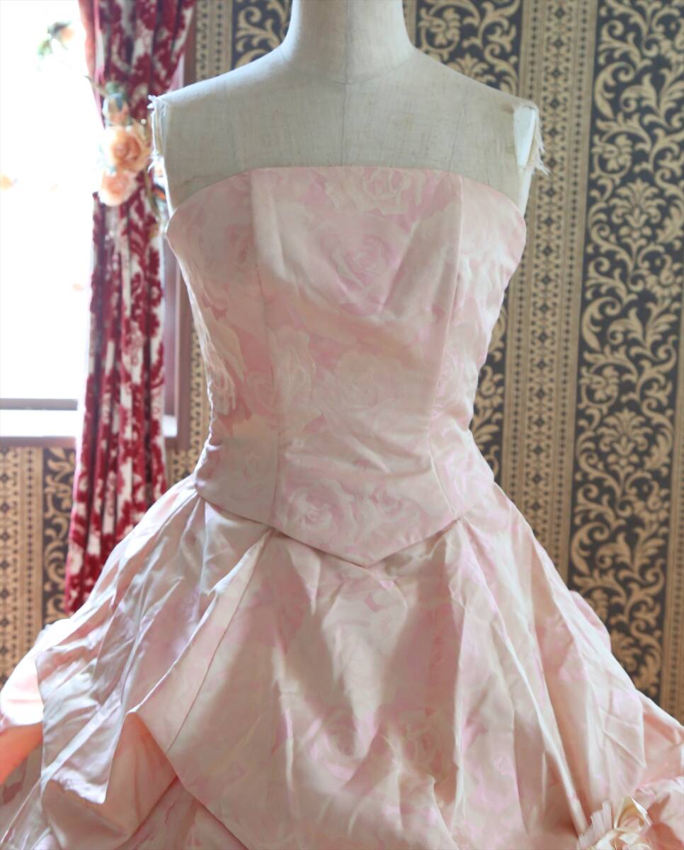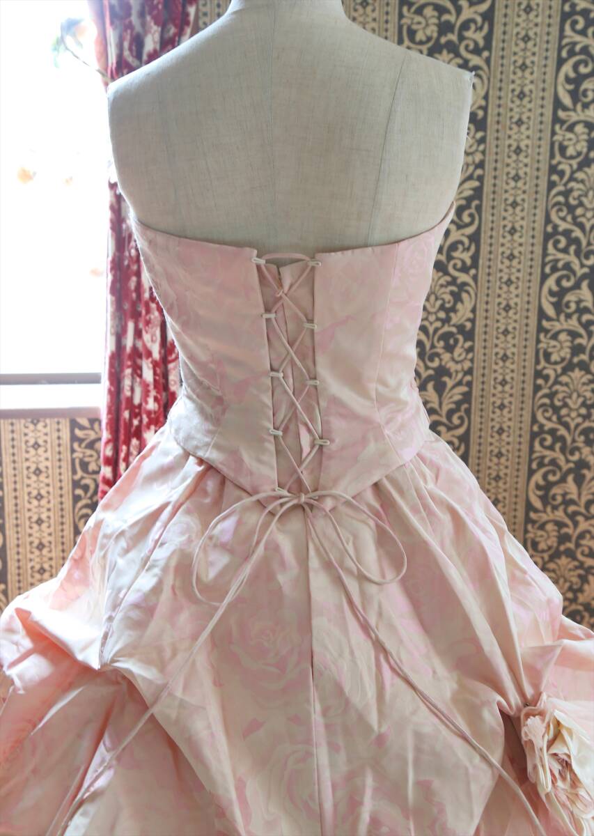キナリピンク薔薇柄織り高級ウエディングドレス7号9号S~Mサイズカラードレス編み上げ調節可能