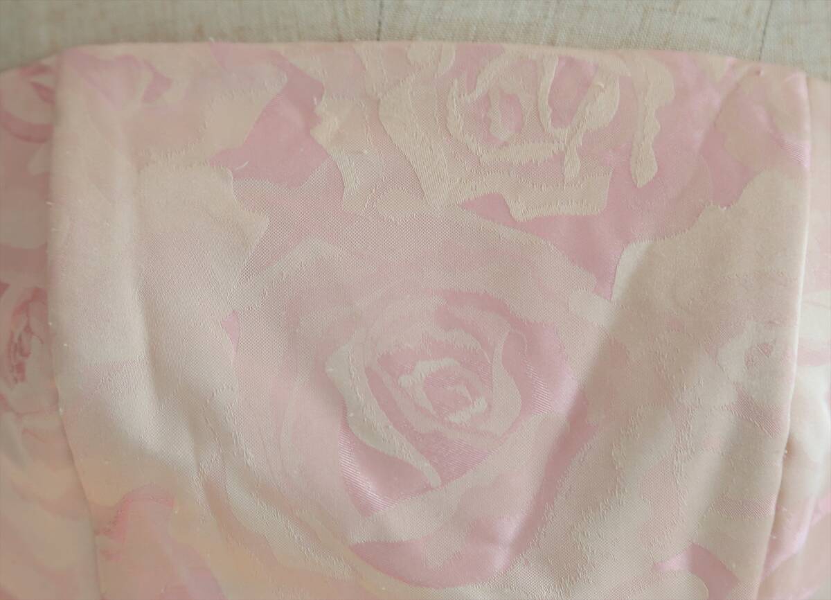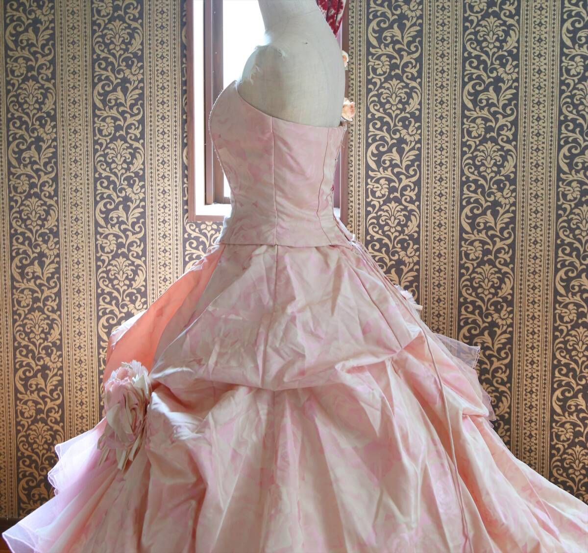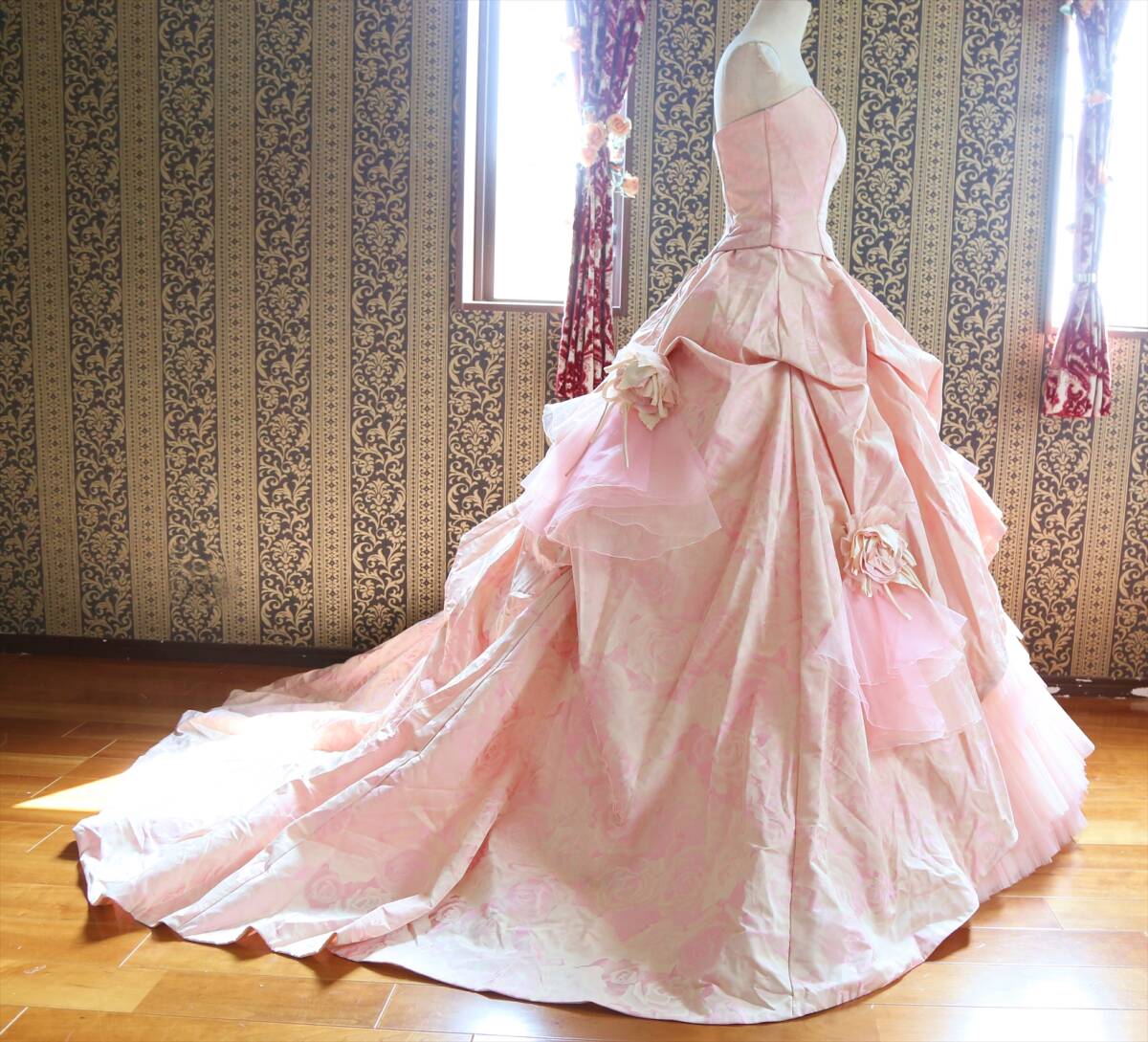 キナリピンク薔薇柄織り高級ウエディングドレス7号9号S~Mサイズカラードレス編み上げ調節可能