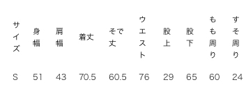 着丈74 肩幅45,身幅55,袖丈64.5 ウエスト最大98cm,股上30,もも周り63,股下69,裾周り27