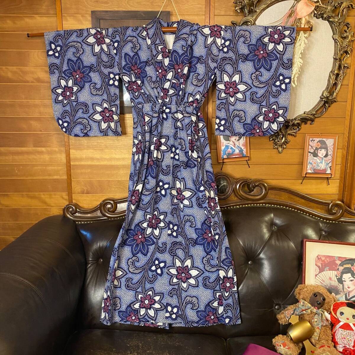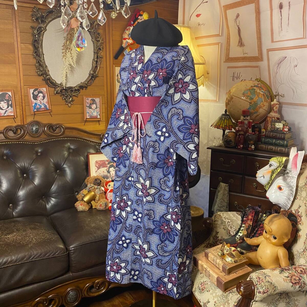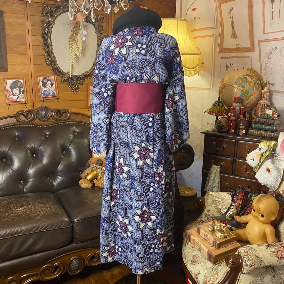 【リップル絞り浴衣リメイク ロング ワンピース/ドレス/帯サッシュベルト 和洋折衷 レトロ 古着 ハンドメイド 大輪の花唐草模様 W-642】