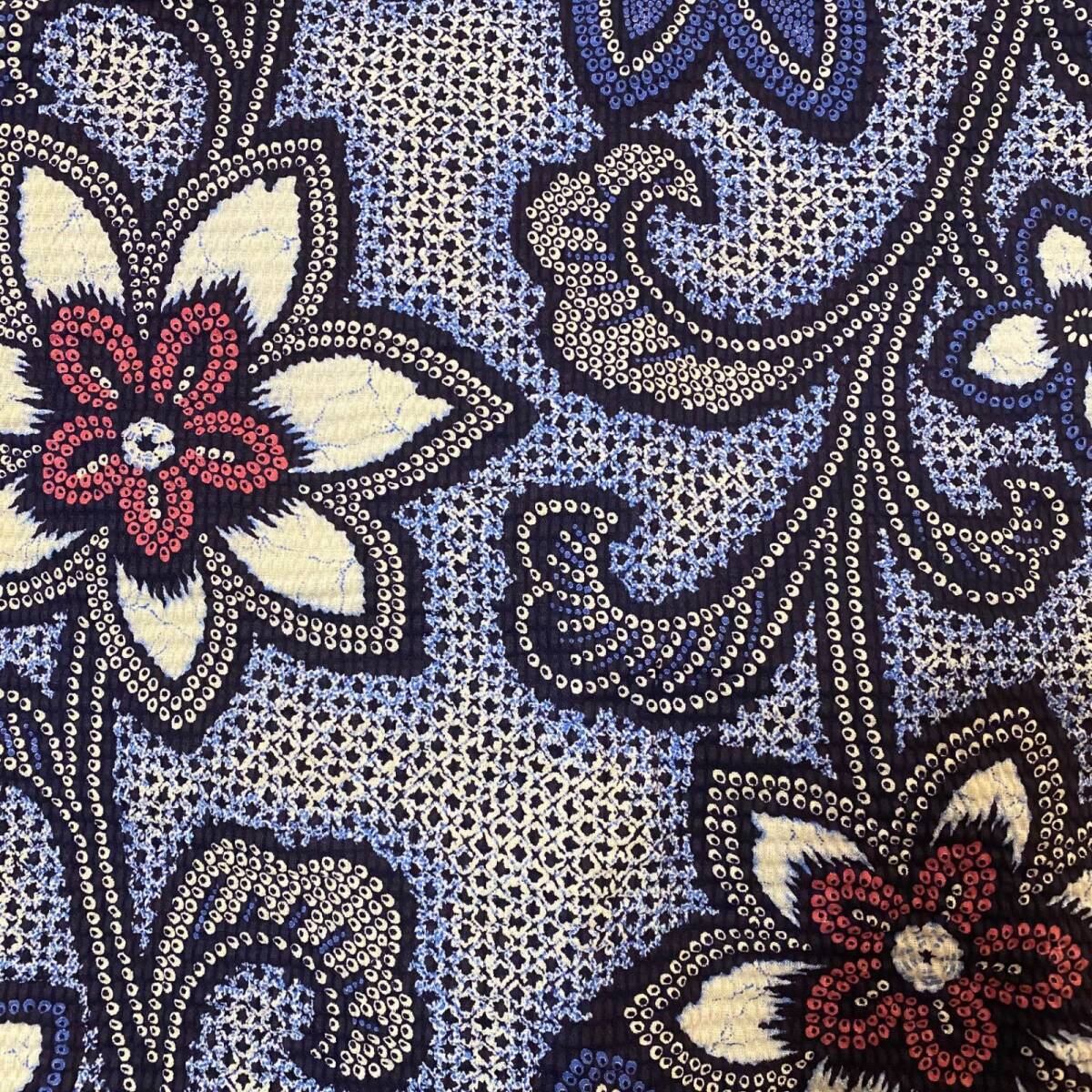 深いインディゴをベースに、リップル絞りの細かなドットで描かれた大輪の花唐草模様。花弁は白〜クリームの暈しに赤紫を重ねて立体感を出し、蔓や葉は藍と群青でくっきりとしたコントラスト。全体をドットが覆うことでシボ感と奥行きが生まれ、遠目にはレースのような繊細さが漂う華やぎ柄です。