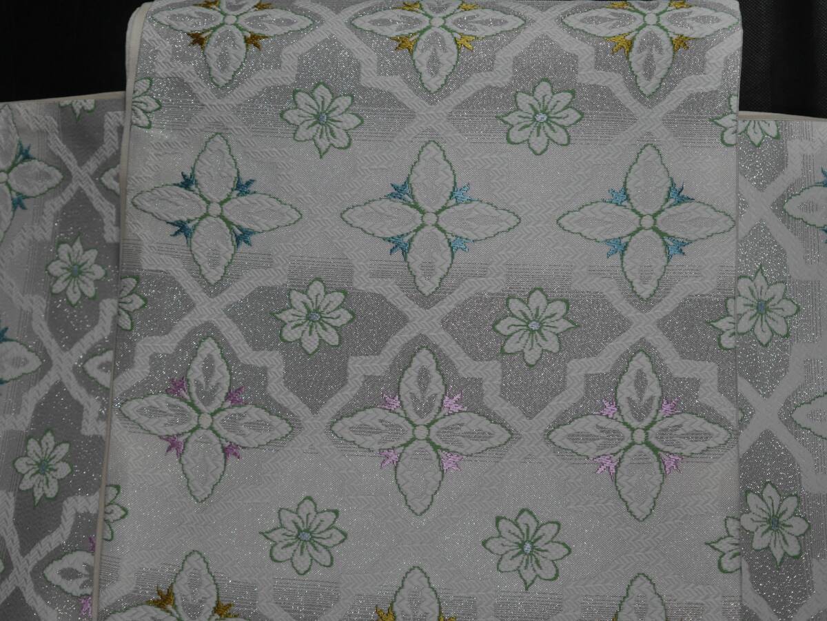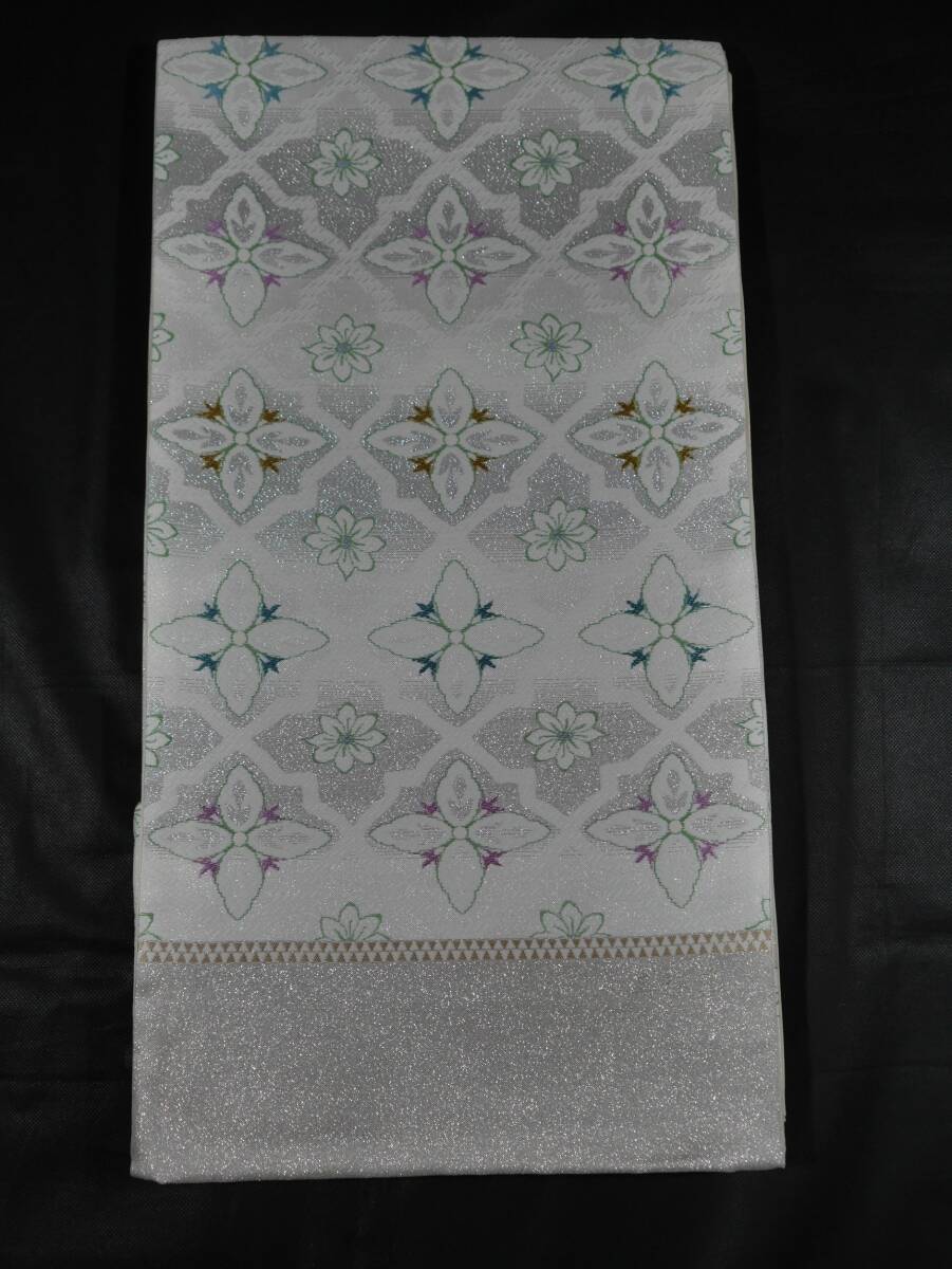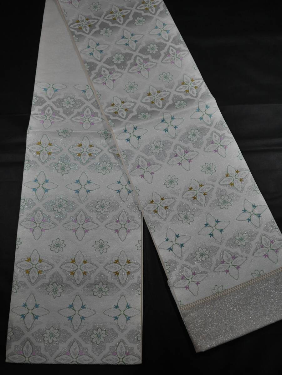 西陣織の老舗浅山織物の真珠箔モダン花並びをご紹介いたします。白地と銀地の段文にキラキラと光り輝く真珠箔が引き詰められた帯地に綺麗な黄色、ブルー、ワインのモダン花が並ぶ上品なエレガントな袋帯です。粋な着物、おしゃれなお着物の柄合わせに最適です。お仕立てには三河の綿芯を入れ手縫い仕立てを致します。お仕立て上がり寸法は長さ450cmとなります。お仕立て上がりには3~5日のご猶予お願い致します。