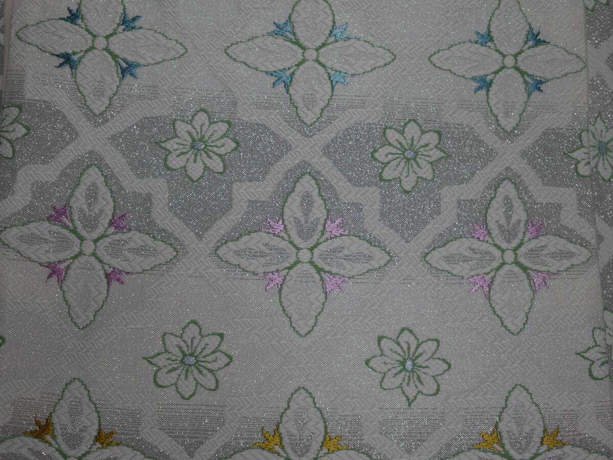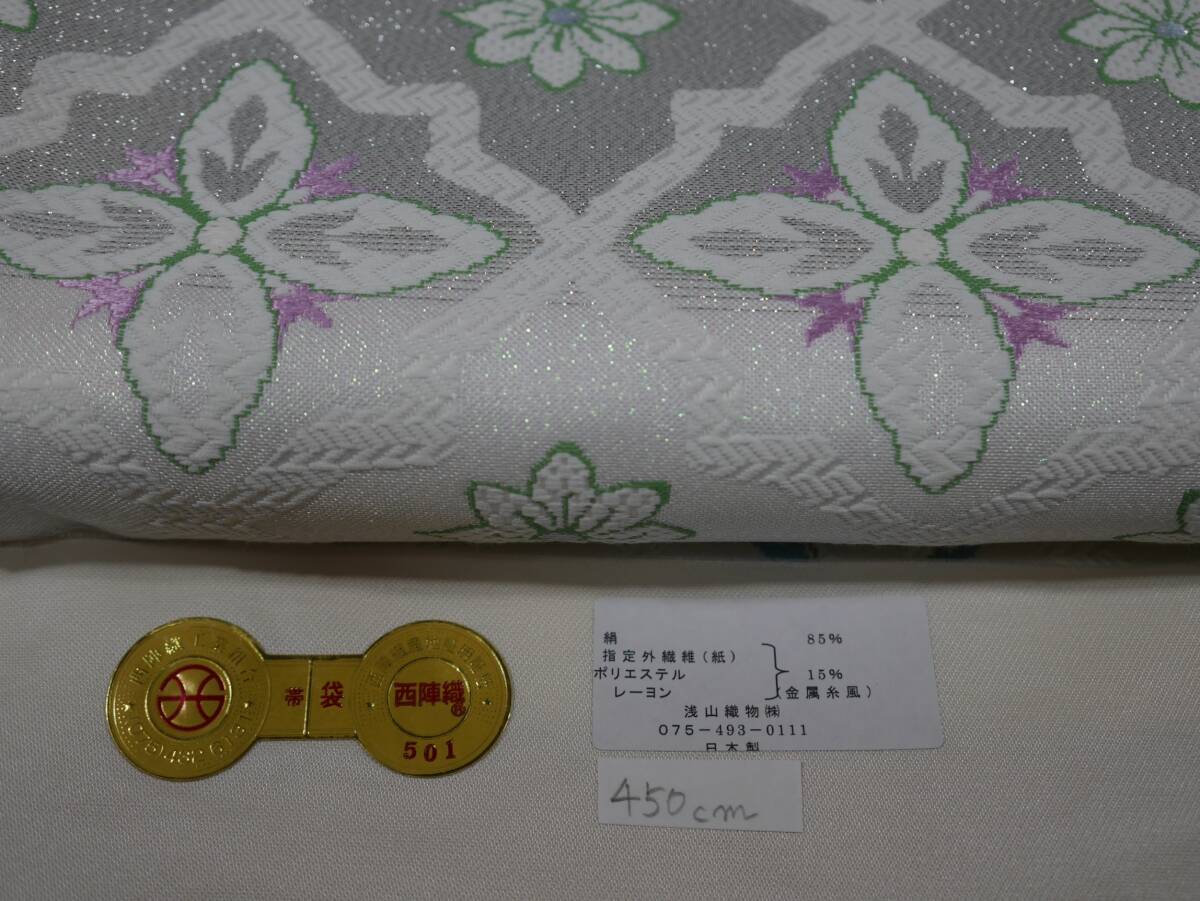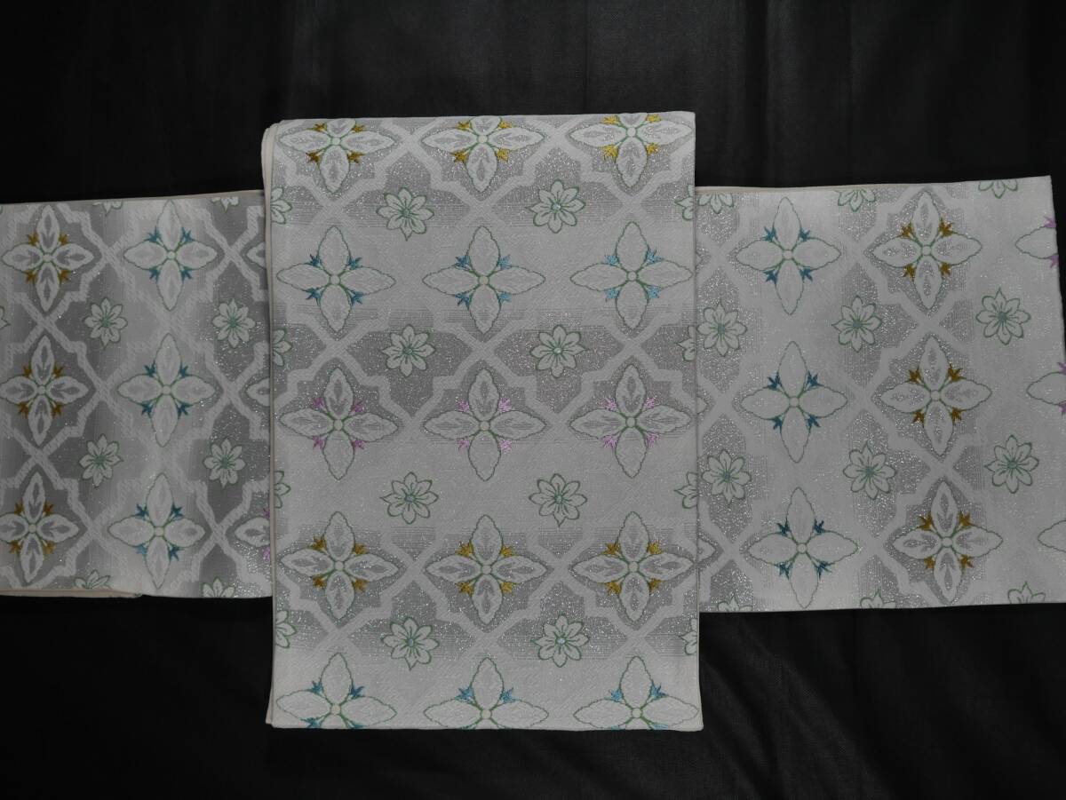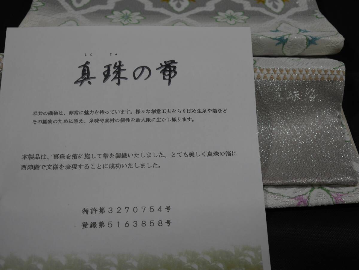 西陣織の老舗浅山織物の真珠箔モダン花並びをご紹介いたします。白地と銀地の段文にキラキラと光り輝く真珠箔が引き詰められた帯地に綺麗な黄色、ブルー、ワインのモダン花が並ぶ上品なエレガントな袋帯です。粋な着物、おしゃれなお着物の柄合わせに最適です。お仕立てには三河の綿芯を入れ手縫い仕立てを致します。お仕立て上がり寸法は長さ450cmとなります。お仕立て上がりには3~5日のご猶予お願い致します。