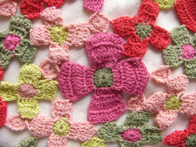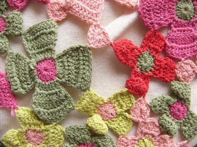 前身頃のみ、淡いオレンジ・赤・ピンク・きみどり・緑のニットのお花のレース編みの 二重仕立てです。