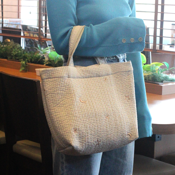 商品説明 | 『ヌビバッグ』とは?! ヌビとは韓国語でキルティングしたものを意味します。 そのキルティングの生地で韓国の布団であるイブルを作ることからイブルバッグとも言います。 ◆特徴◆ やわらかく肌触りが抜群! 軽くて肩コリ知らず! 洗える生地なので清潔! 星と月の刺繍が可愛らしいトートバッグです。 ナチュラルカラーですので、どんなファッションにもマッチします♪ Mサイズは、A4サイズのファイルや500mlペットボトルは余裕で入る大きさいです。 持ち手が36cmで肩がけもできますので、長時間のお出かけもOK!! *柄の出方は掲載画像と相違がございますので予めご承知おきくださいませ。 |