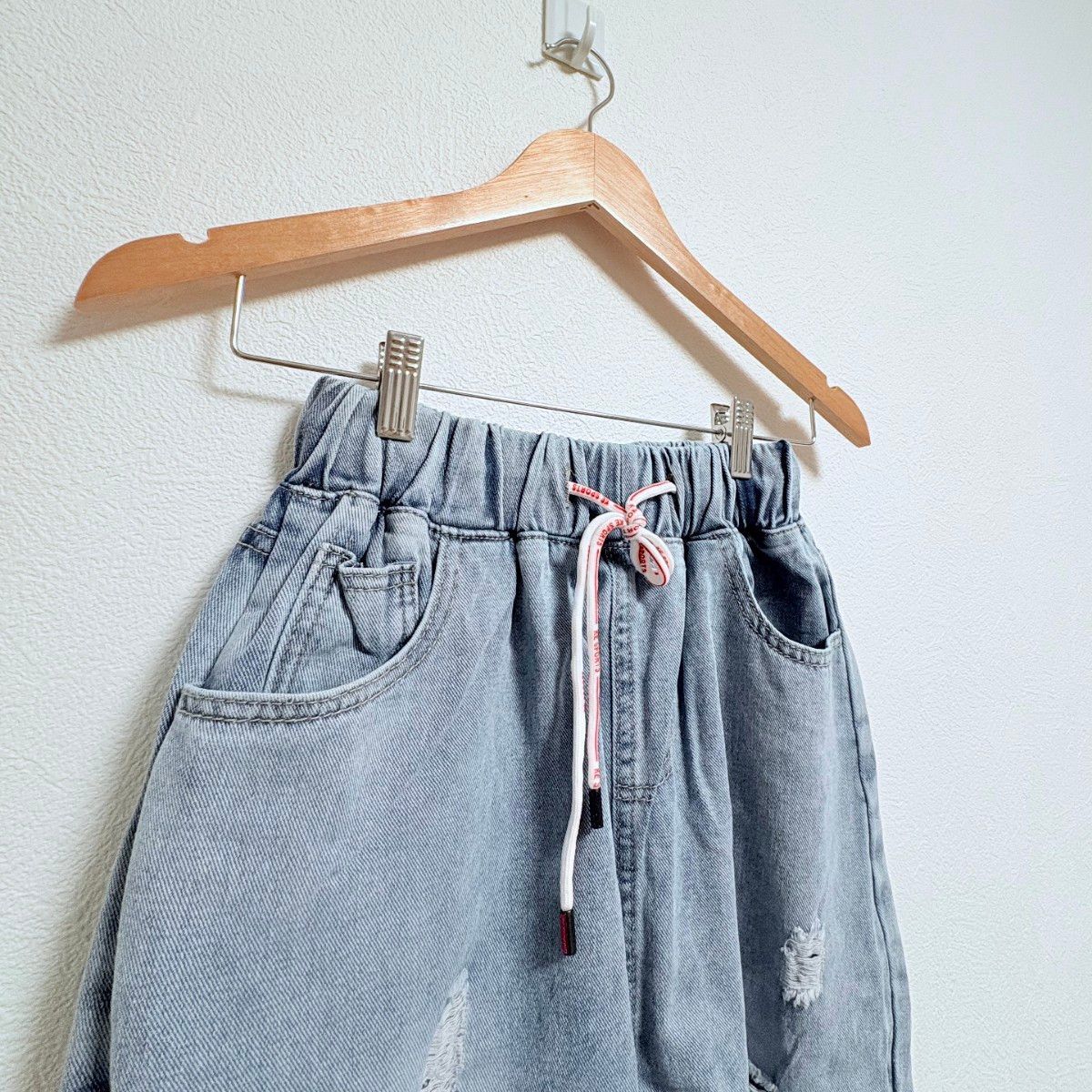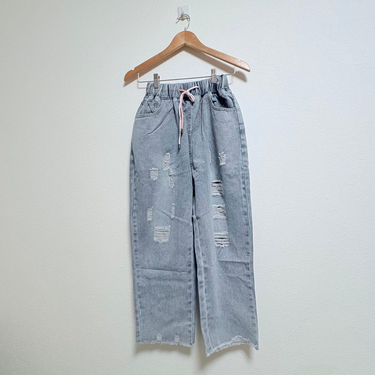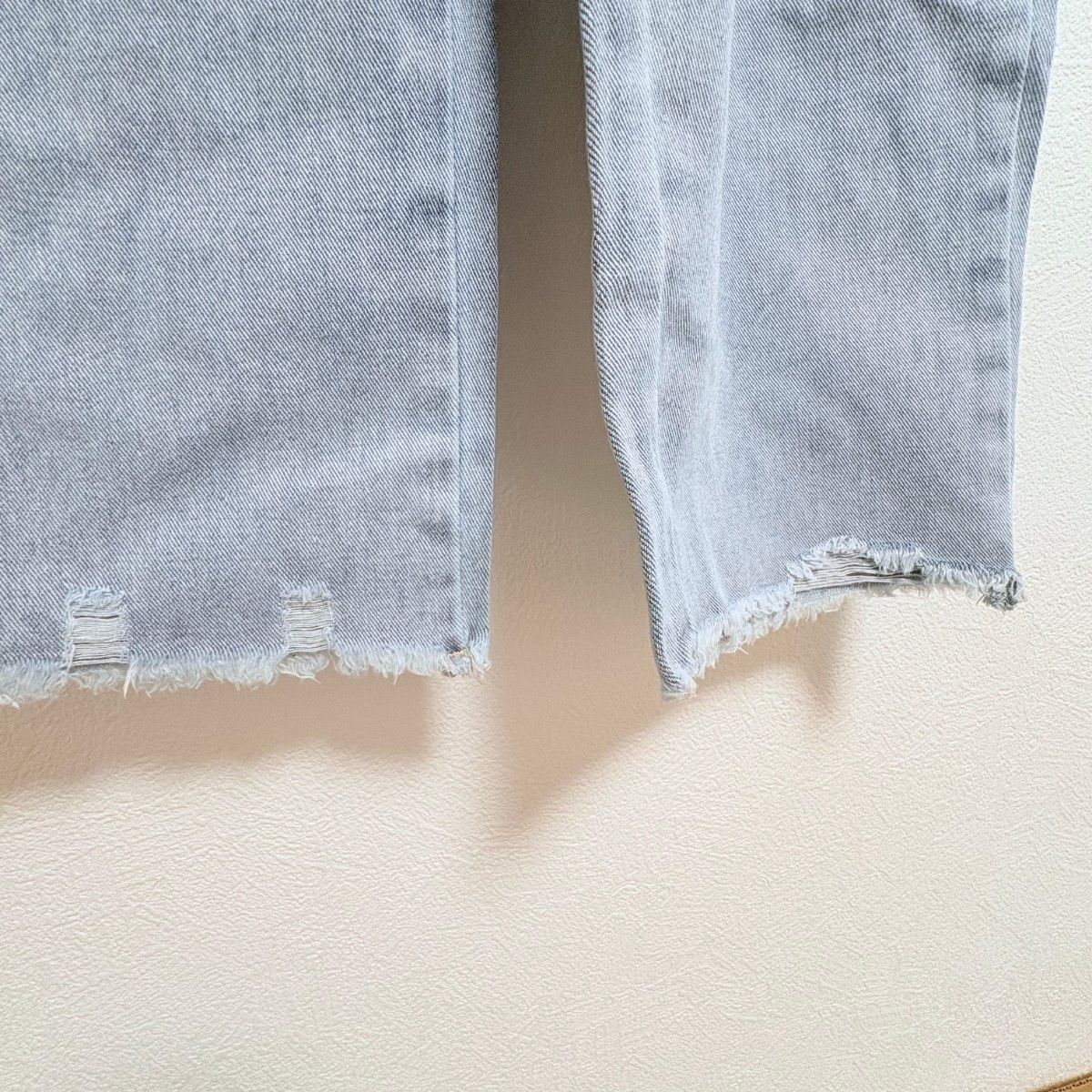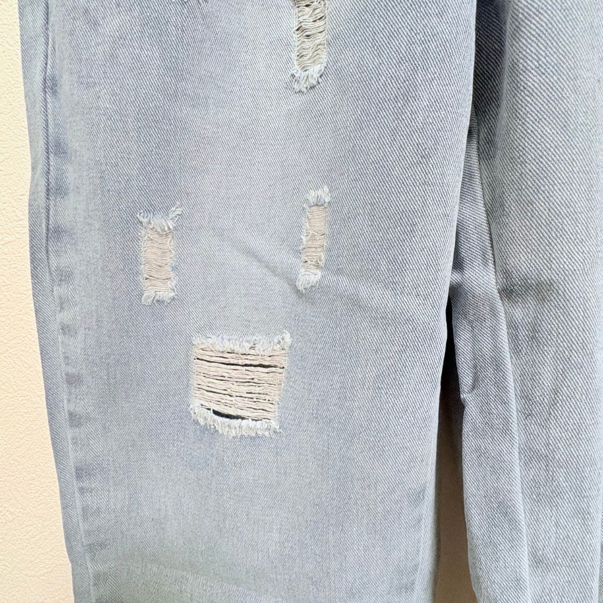 ウォッシュ加工が施されたライトブルーのダメージデニムパンツです。