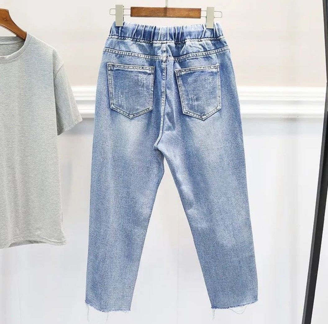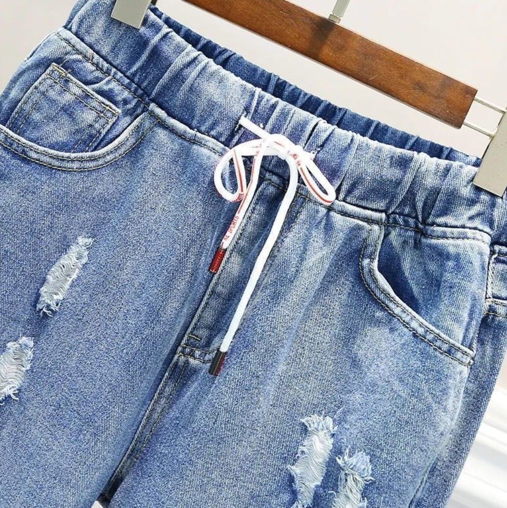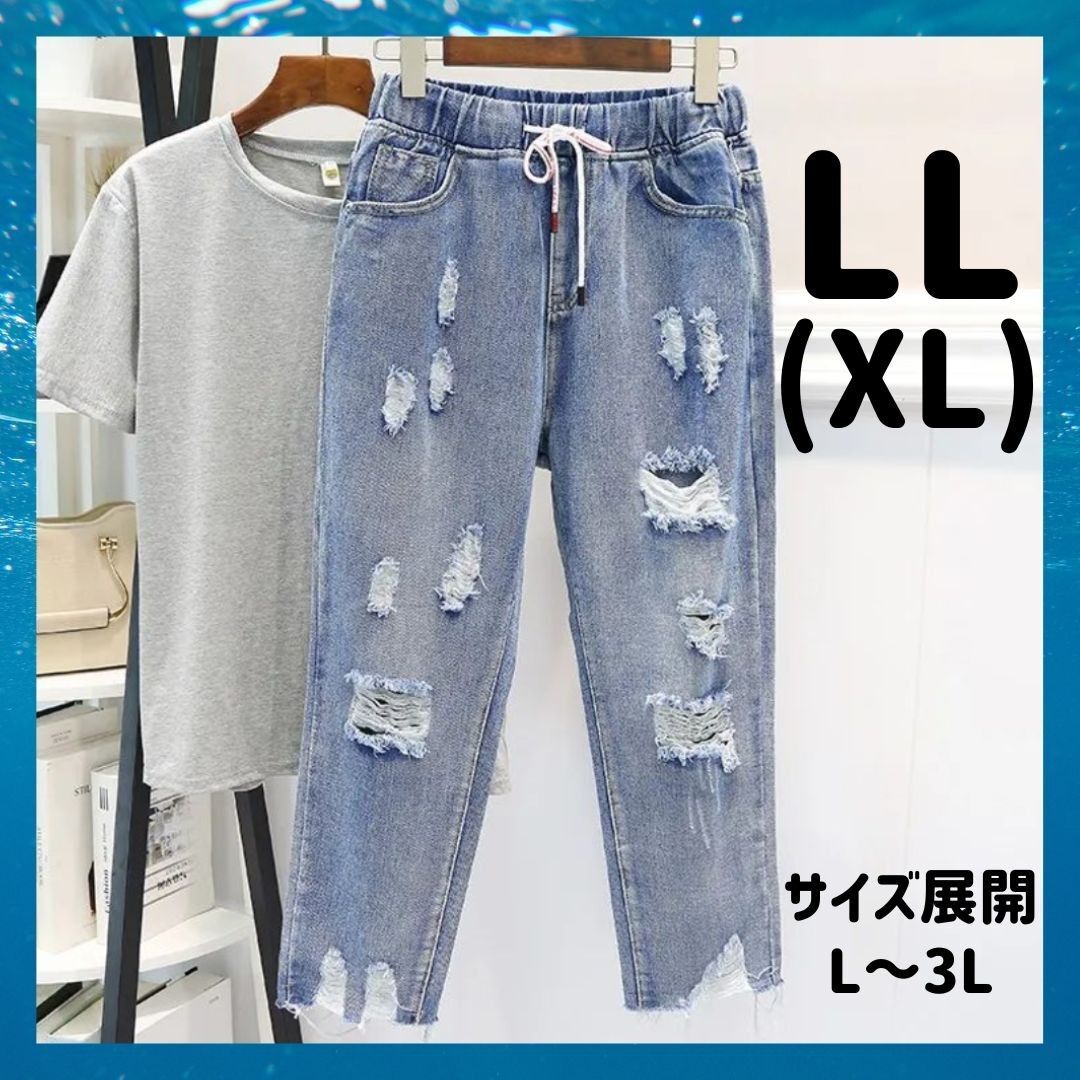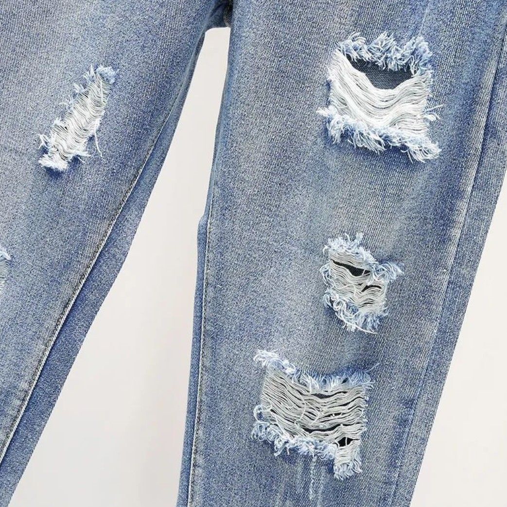 ウォッシュ加工が施されたライトブルーのダメージデニムパンツです。