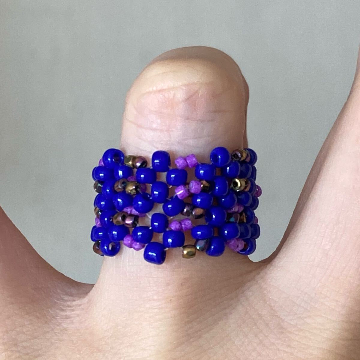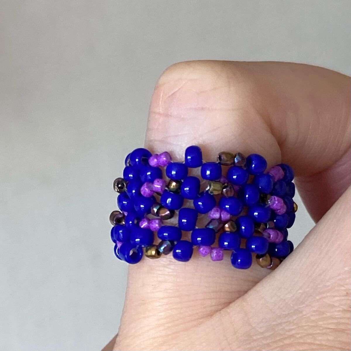 ブルーの丸大ビーズ、パープルのデリカビーズ、ブロンズのスリーカットビーズで作ったリングです。