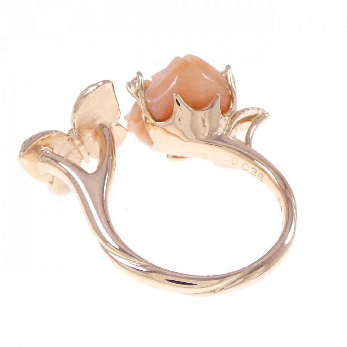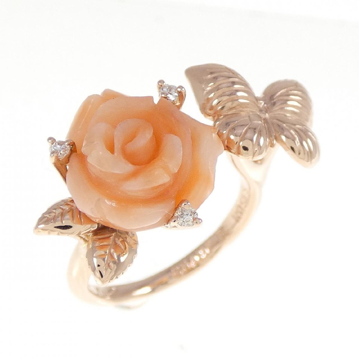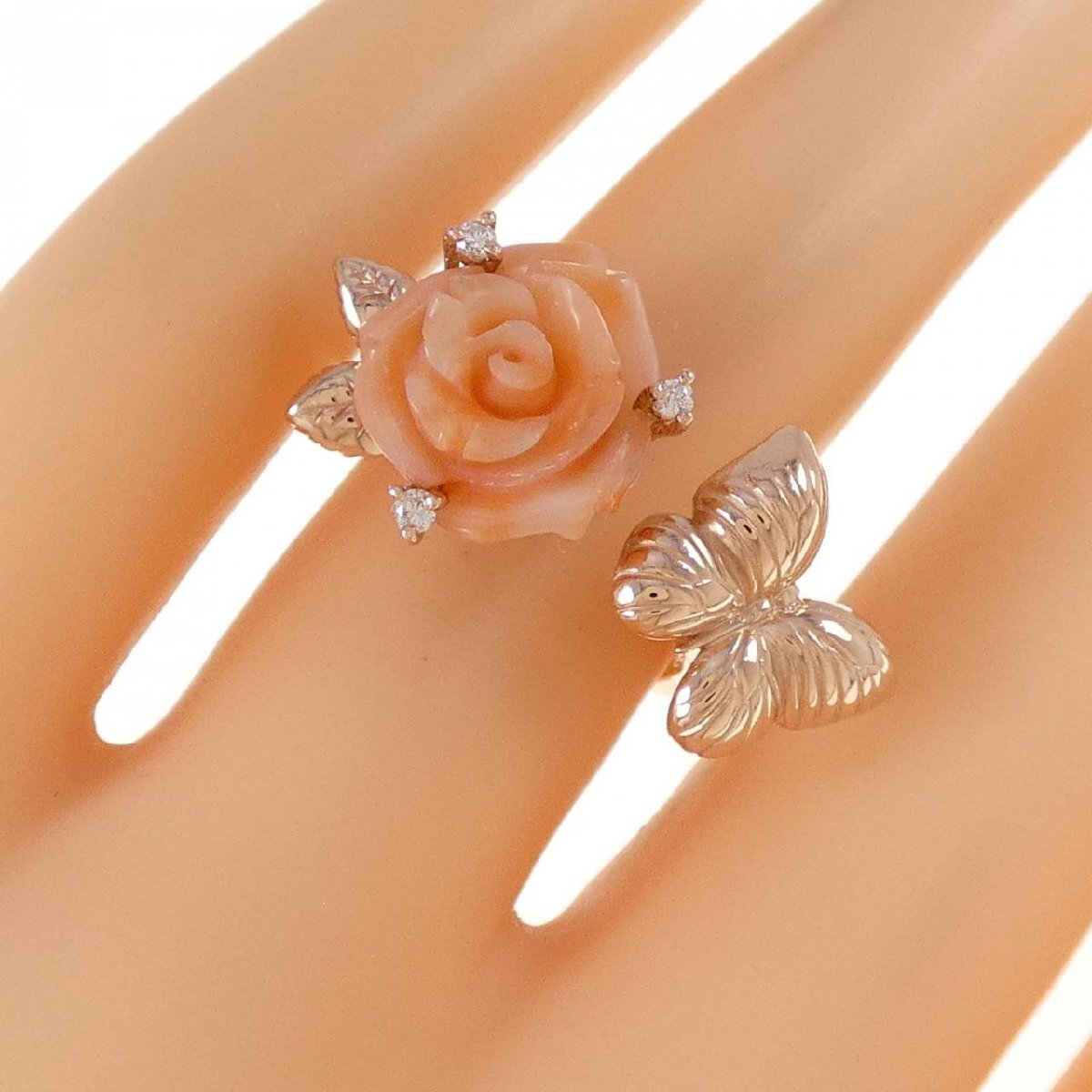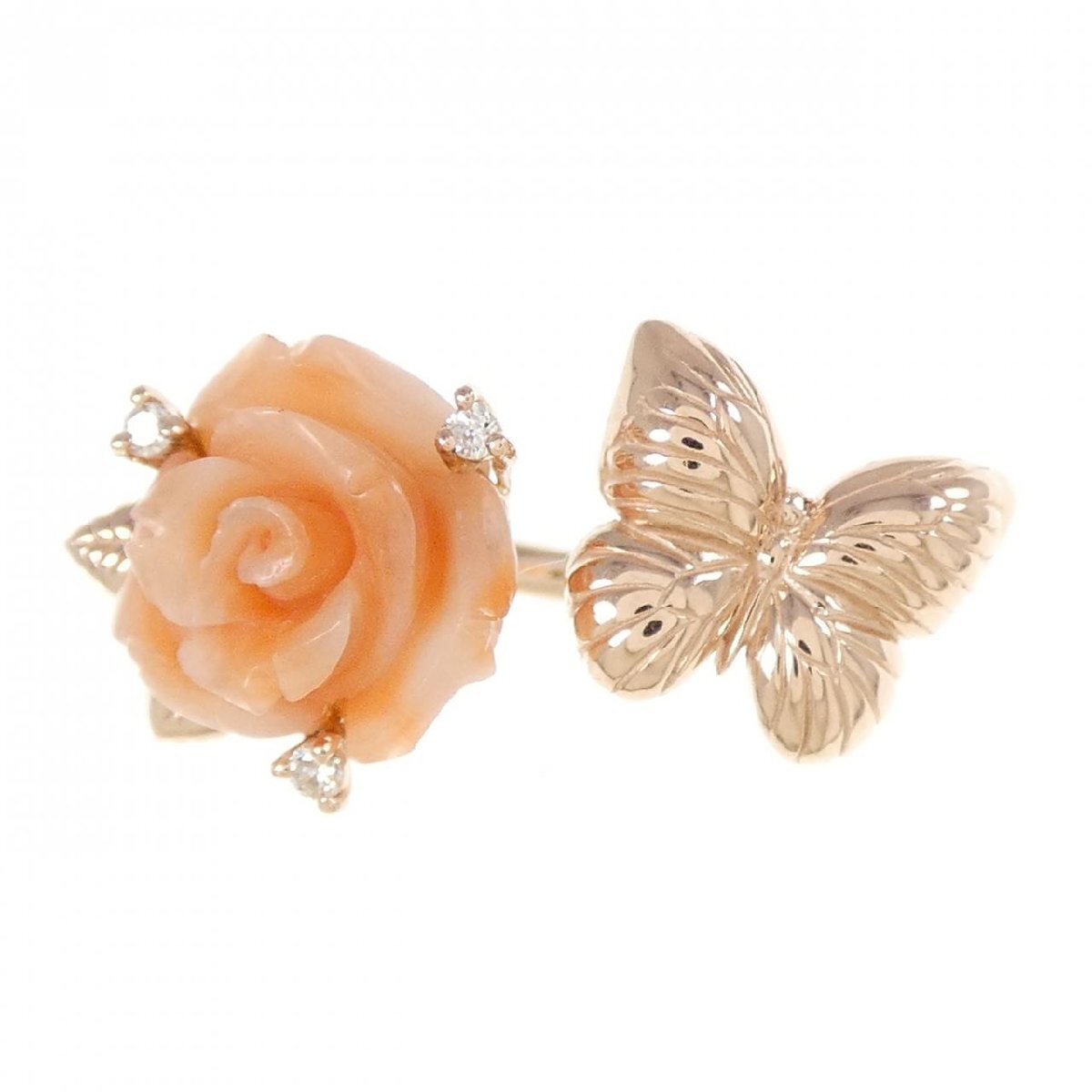 サンゴであしらった繊細な薔薇モチーフに蝶々が飛びます。煌めくダイヤモンドが添えられた華やかなジュエリーです。