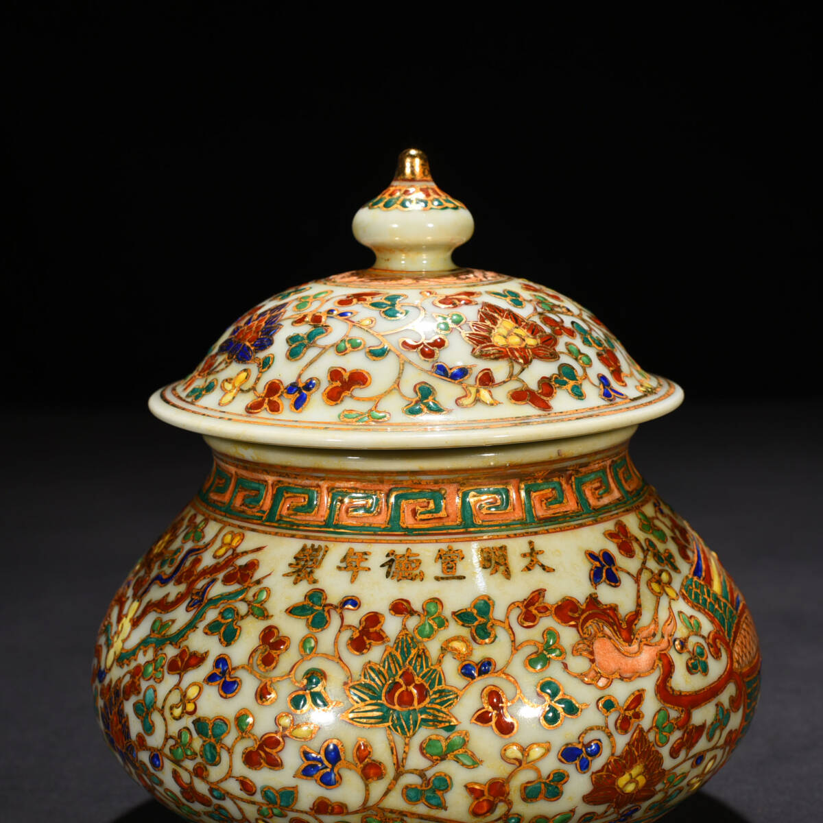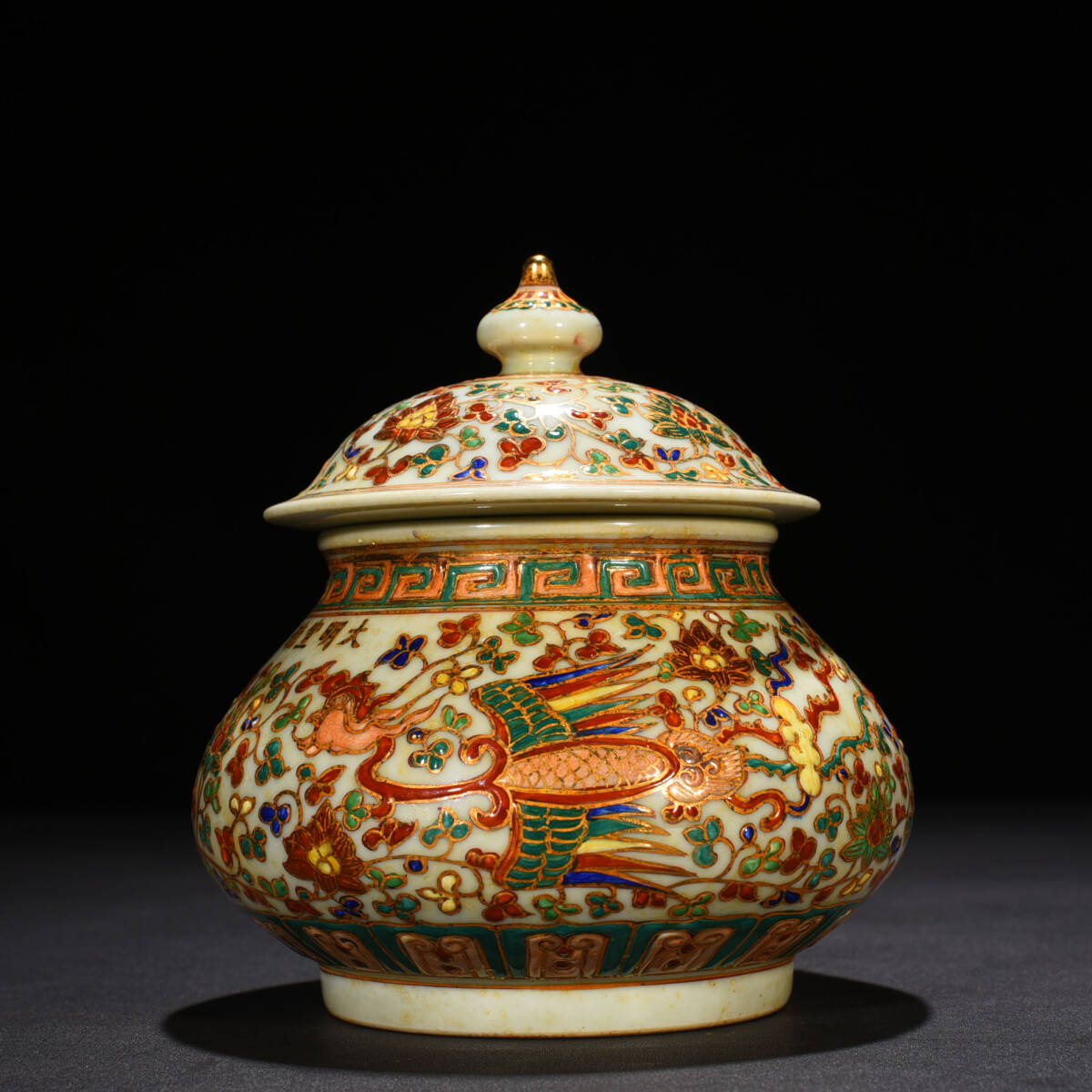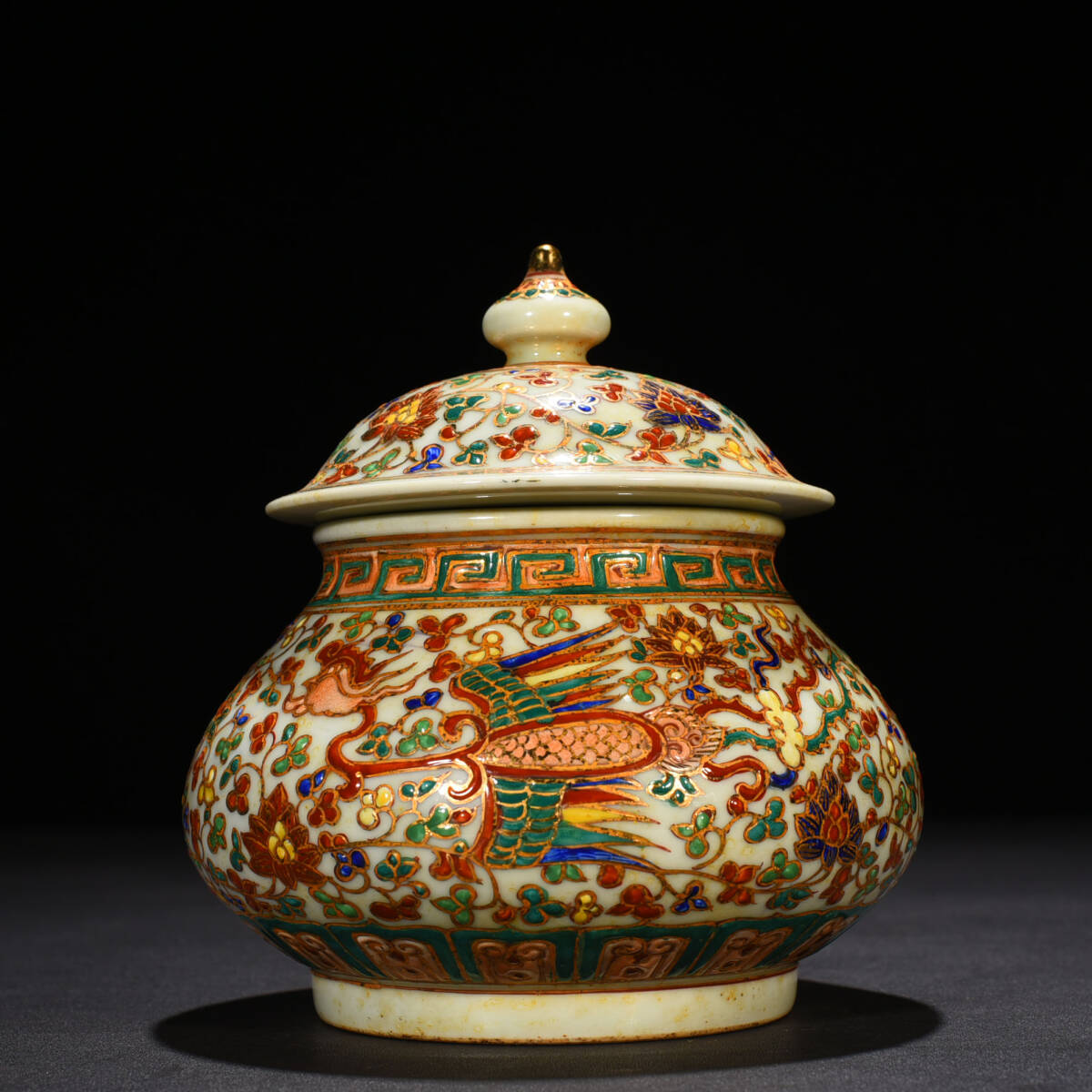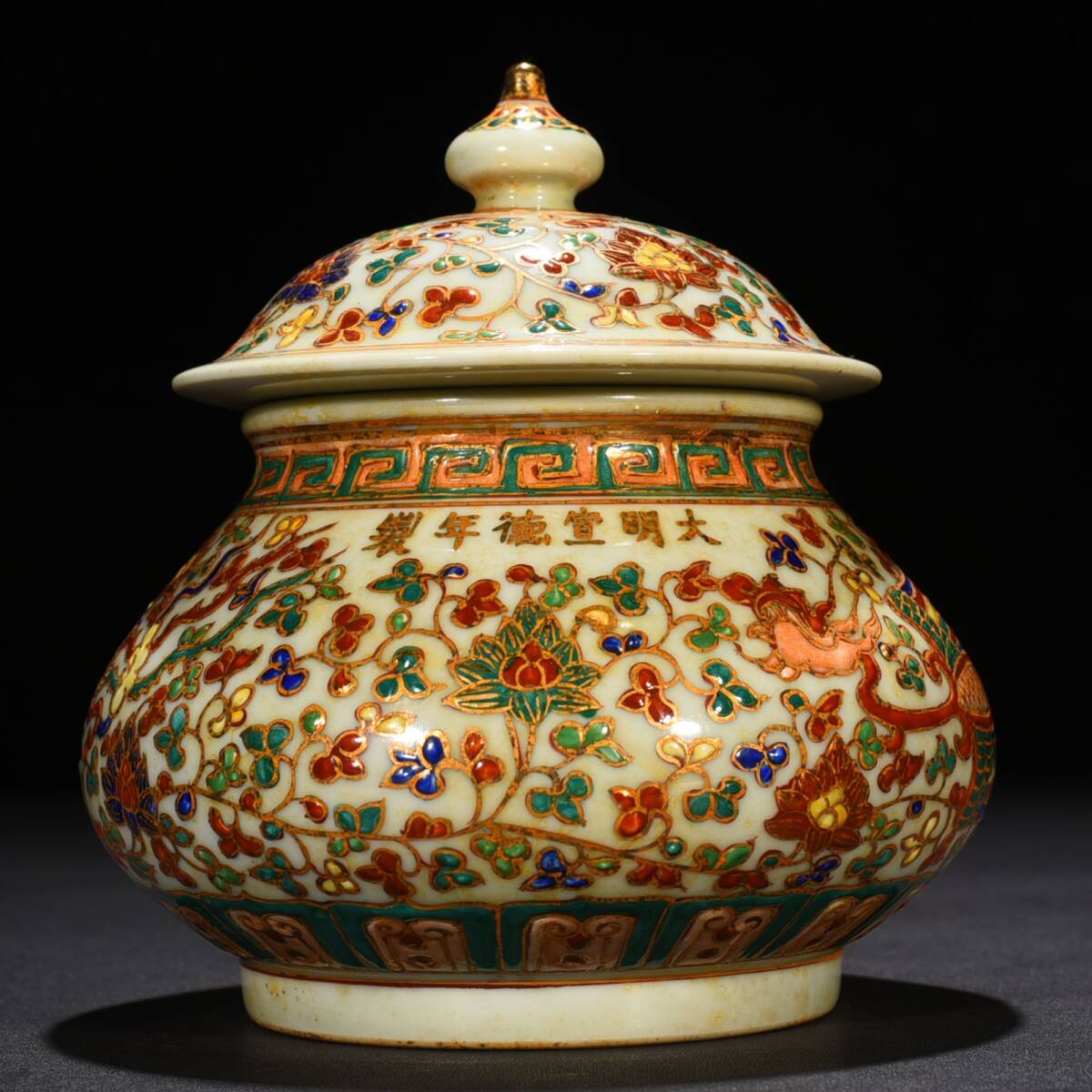 明時代 宣徳年製 五彩蒔絵金 絡枝鳳紋 蓋缶 高さ17 cm 直径16 cm ・中国骨董 ・珍品旧蔵・古賞物・時代物 725