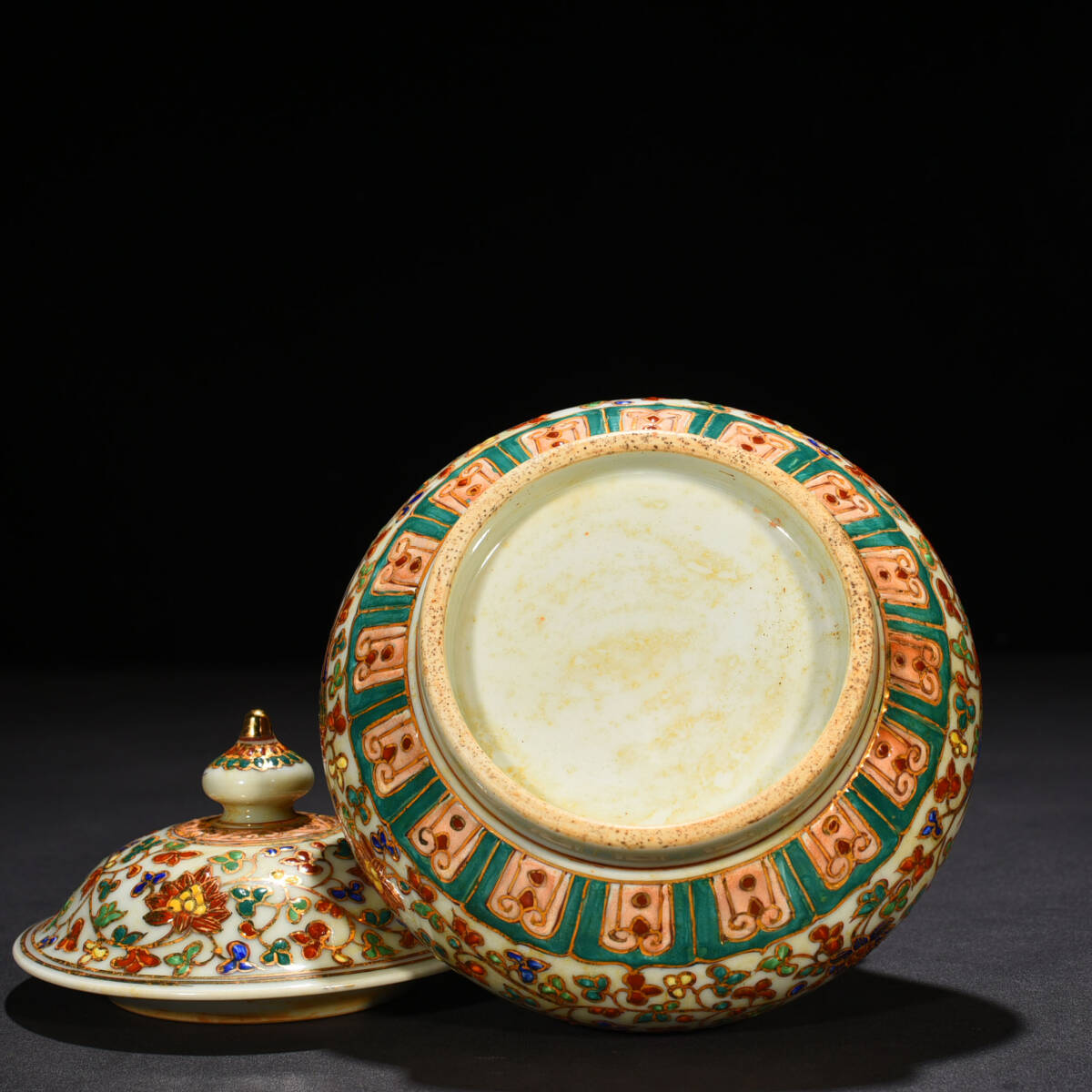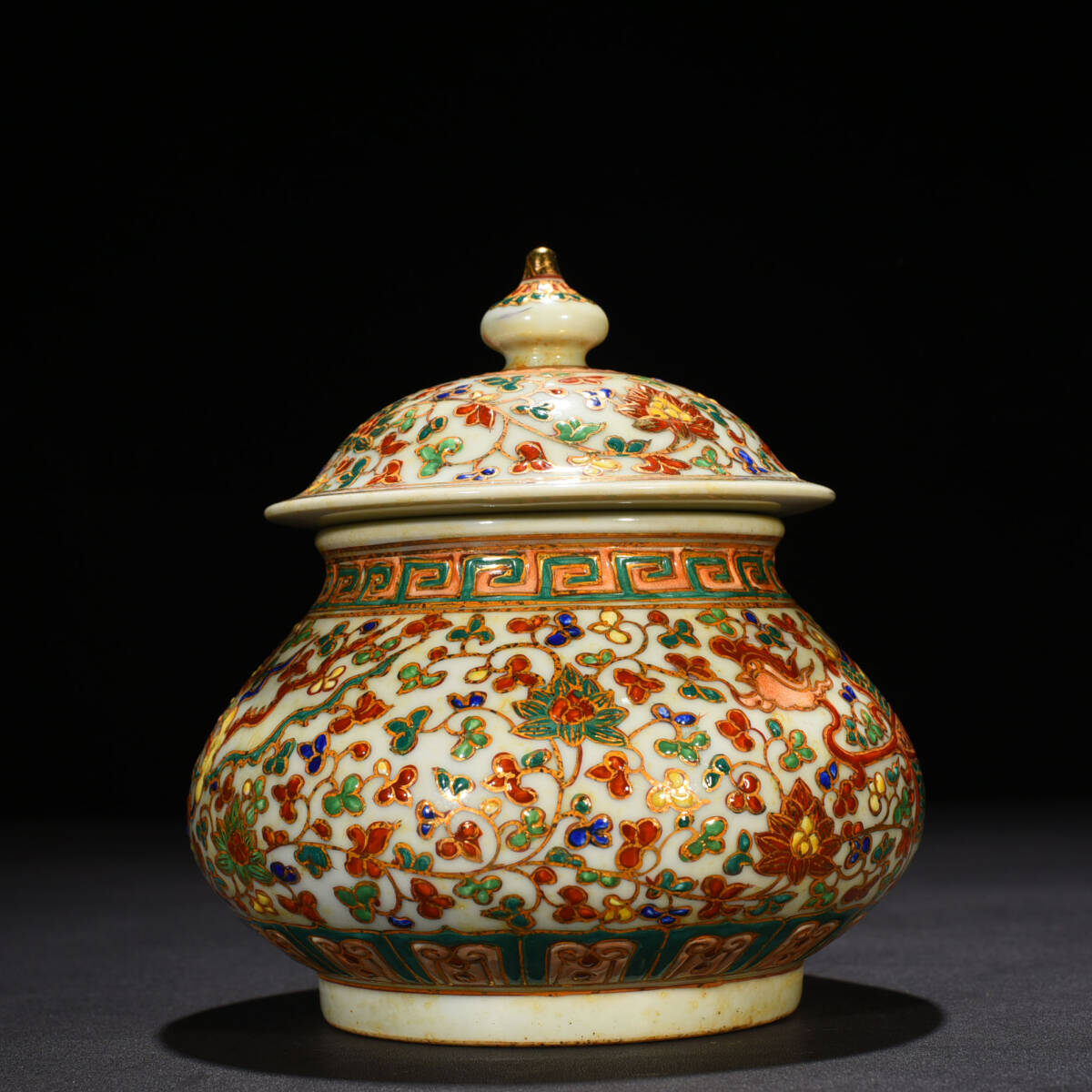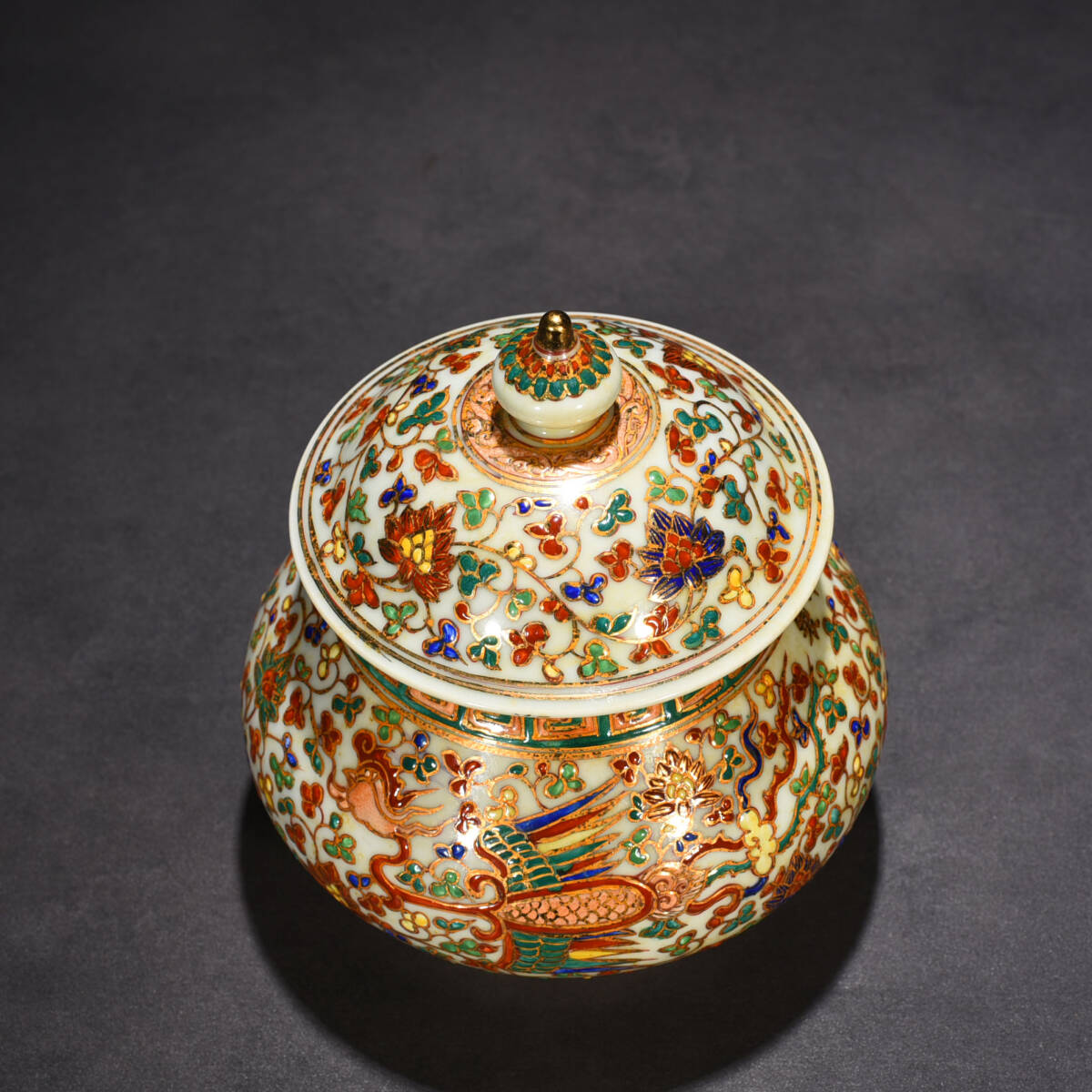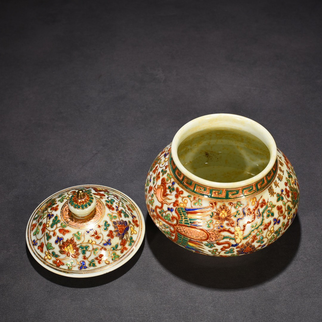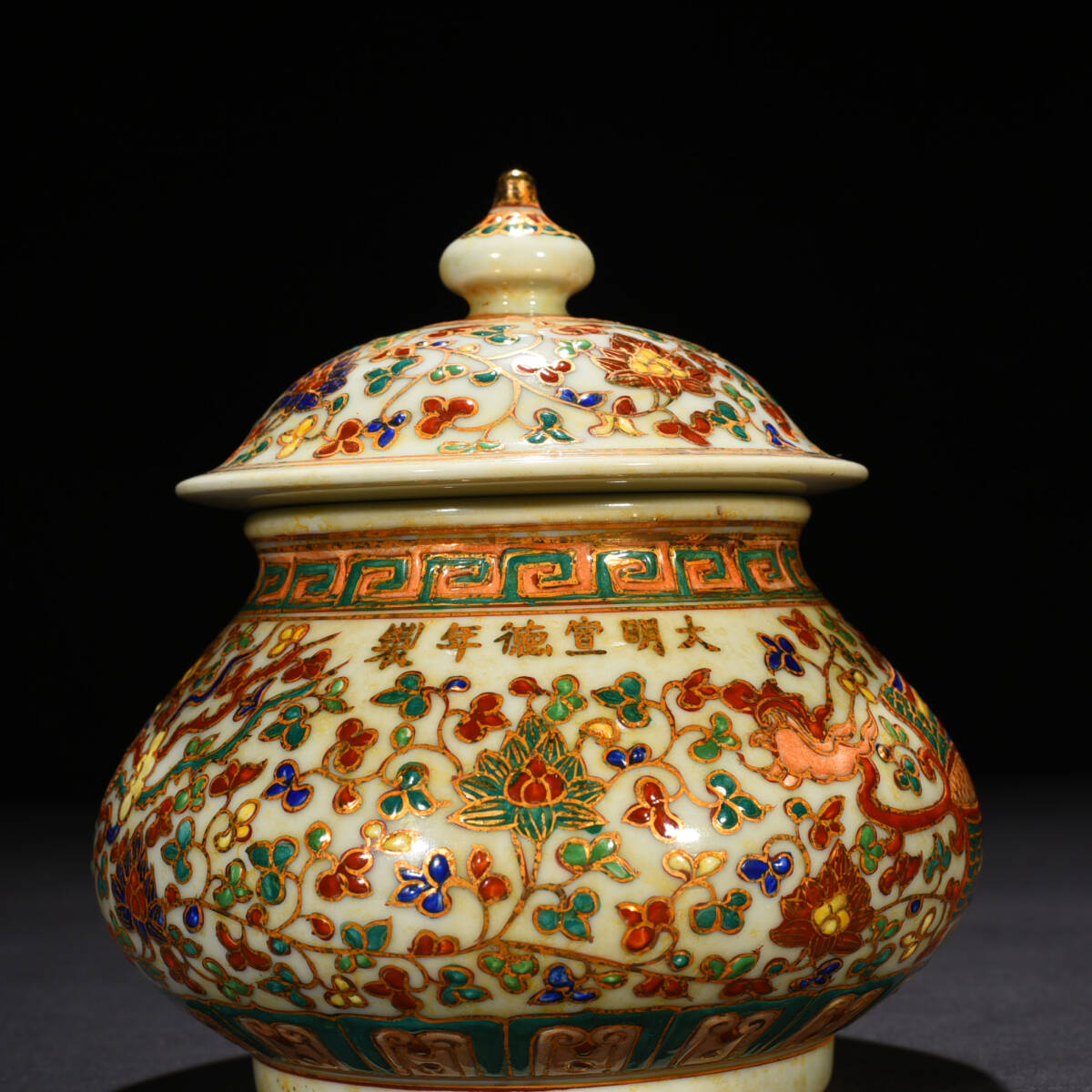 明時代 宣徳年製 五彩蒔絵金 絡枝鳳紋 蓋缶 高さ17 cm 直径16 cm ・中国骨董 ・珍品旧蔵・古賞物・時代物 725