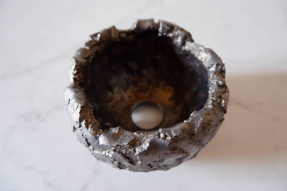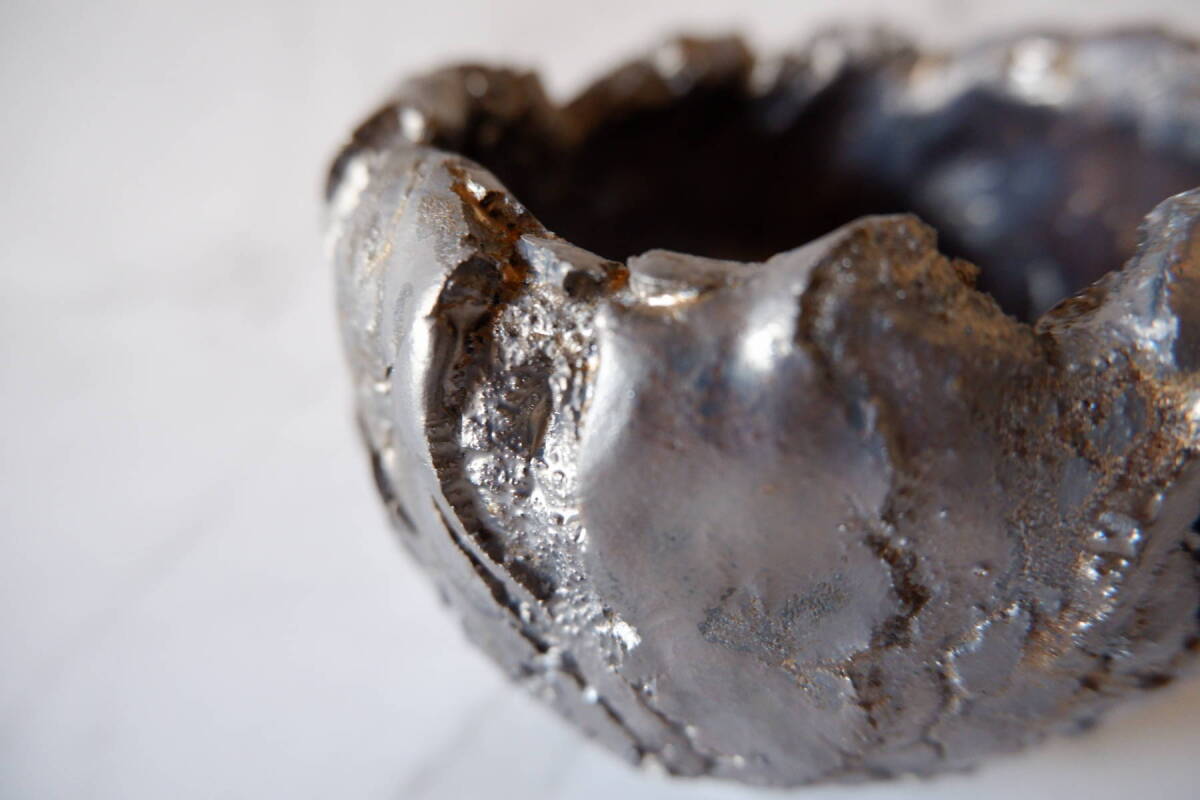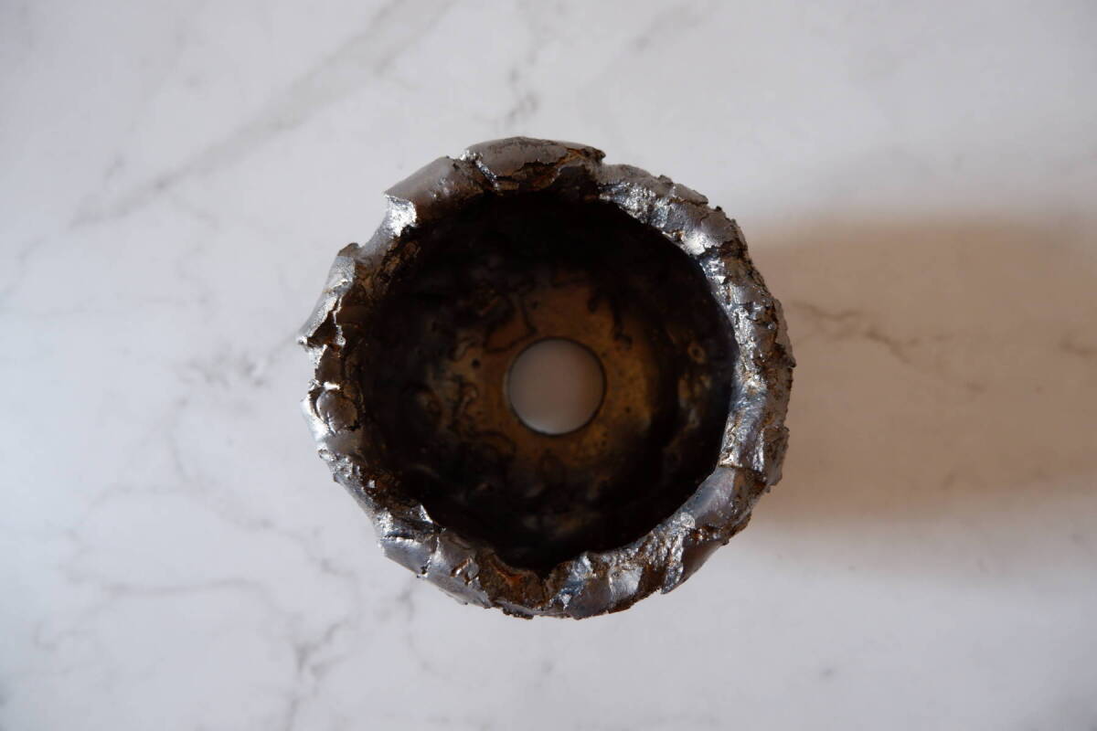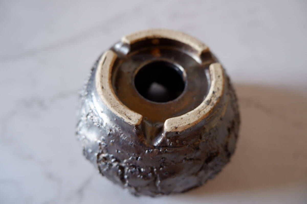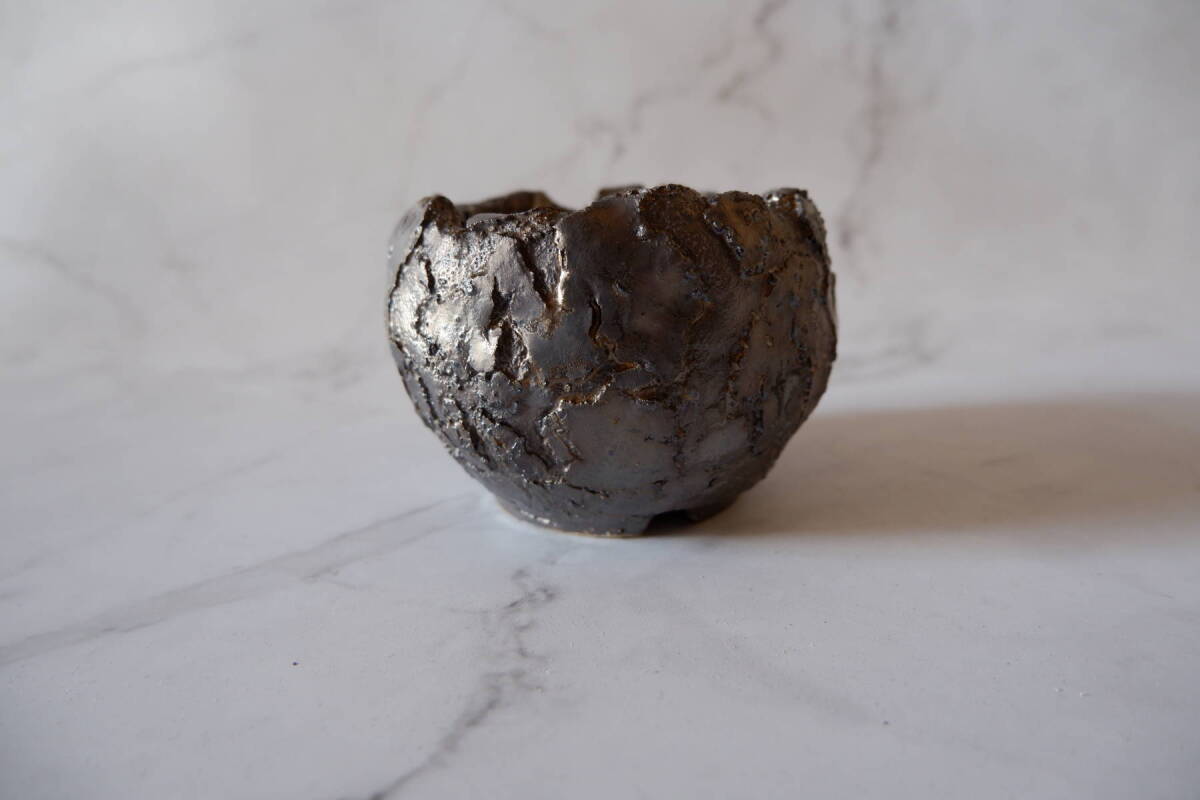 縁や溝など釉薬が溜まって濃く掛かった部分はブロンズ色が明るく発色していますが、全体的には光沢を抑えたメタリックな黒っぽいこげ茶、錆びた金属のような渋い発色です。
