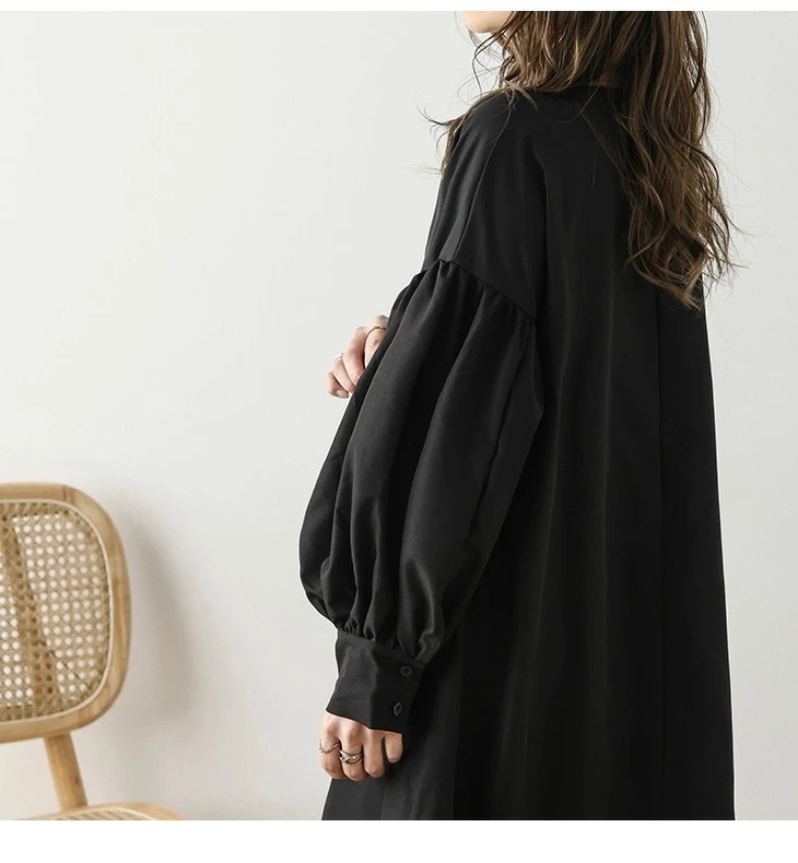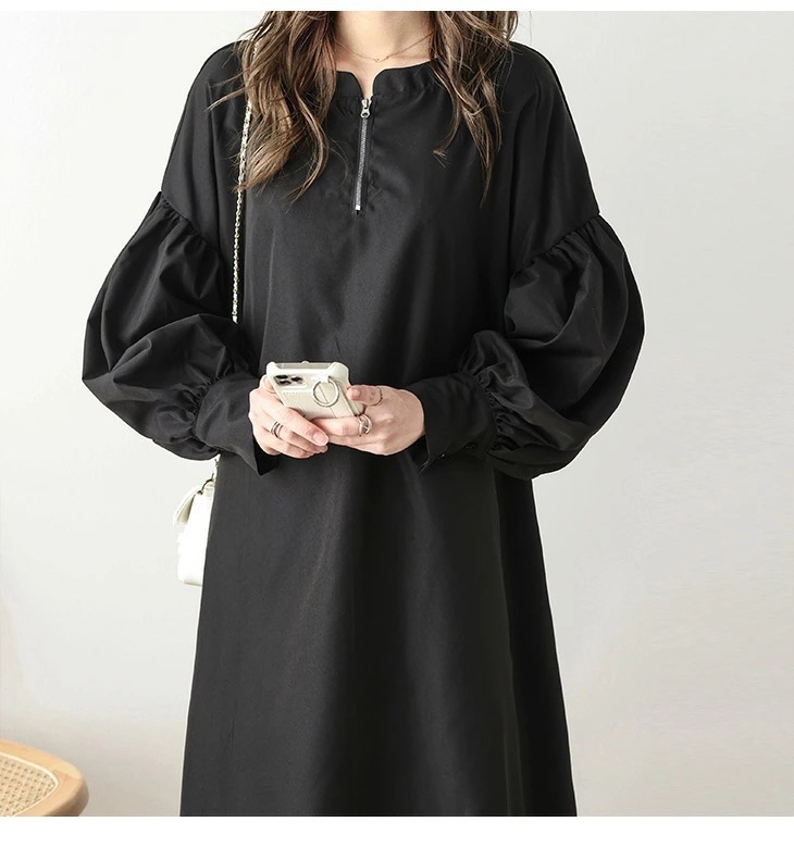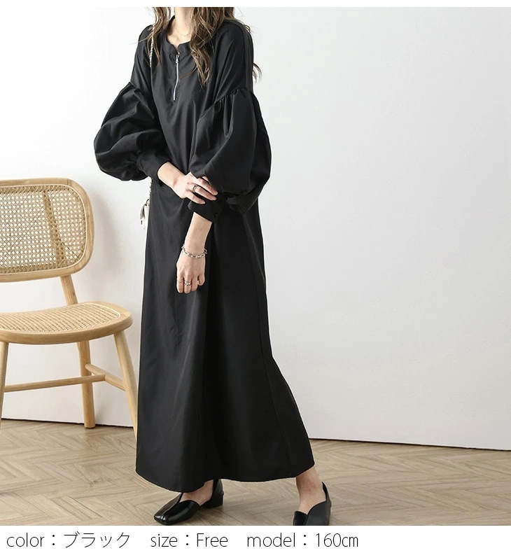 前ファスナーがおしゃれぽわん袖のロング丈ワンピ★新品★大きいサイズ★軽いさらっと素材の定番黒ワンピ