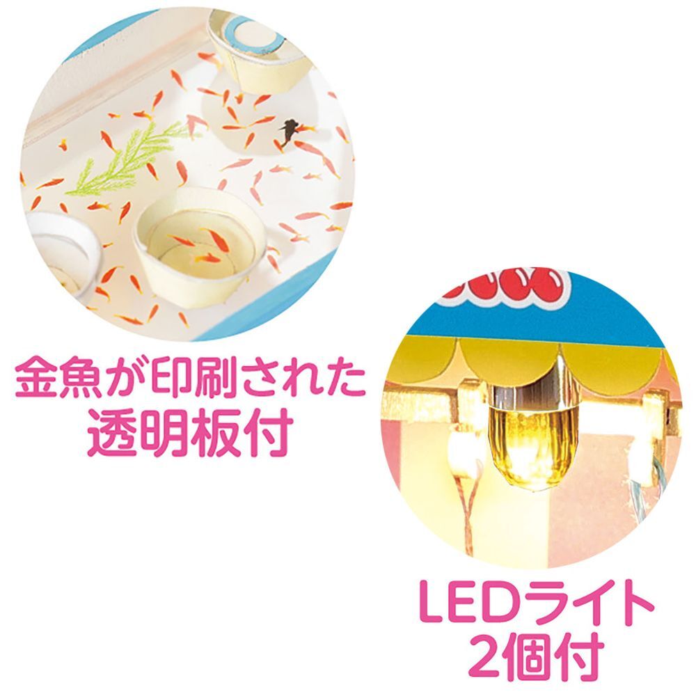 1/12スケールの金魚すくいの屋台のミニチュアがつくれるキットです。透明板に金魚が印刷されており、クオリティの高いジオラマがつくれます。パーツはレーザーカット済、印刷済なので、簡単に制作できます。光るLEDライト付!(ボタン電池LR41内蔵、電池交換可能)。目安制作時間:120分(着色込)。別途用意するもの:アルミホイル、絵の具、はさみ、カッターナイフ、カッターマット、セロハンテープ。QRコードから英語の取り扱い説明書もご覧いただけます。