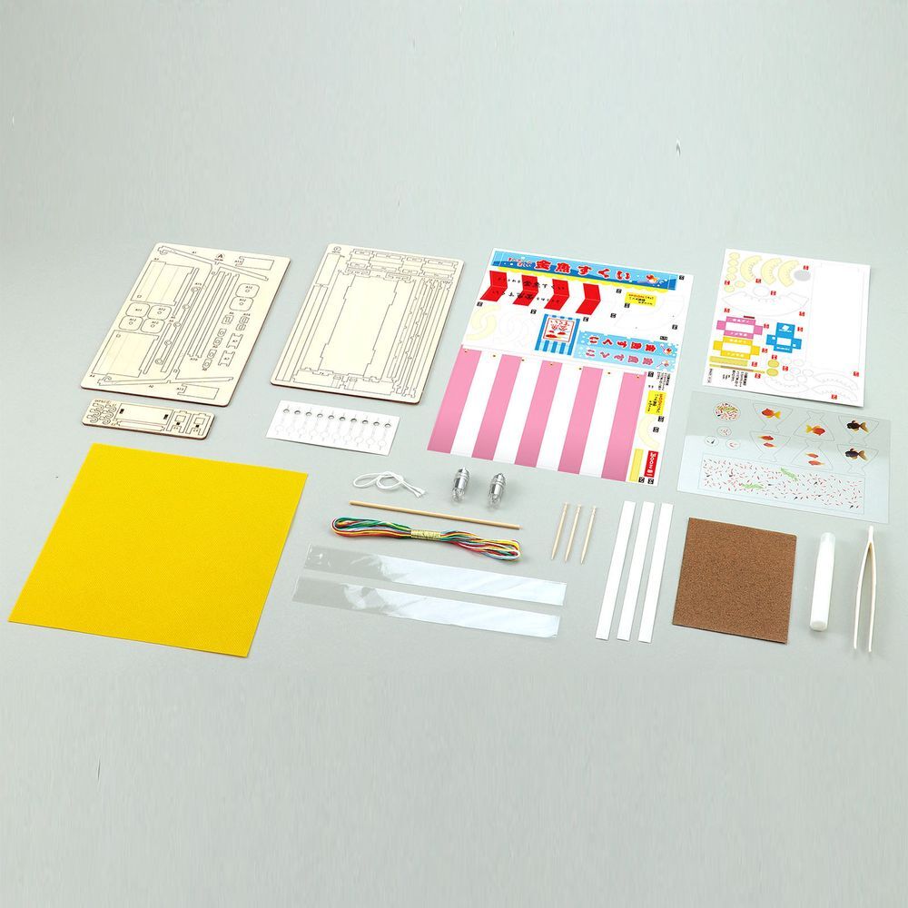 セット内容:レーザーパーツ×4、印刷済台紙×2、不織布(黄)×1、たこ糸×1、竹ひご×1、糸×1、バルーンLEDライト×2、金魚すくい用透明板×1、透明小袋×2、つまようじ×3、両面テープ×3、紙やすり×1、木工用接着剤×1、ピンセット×1