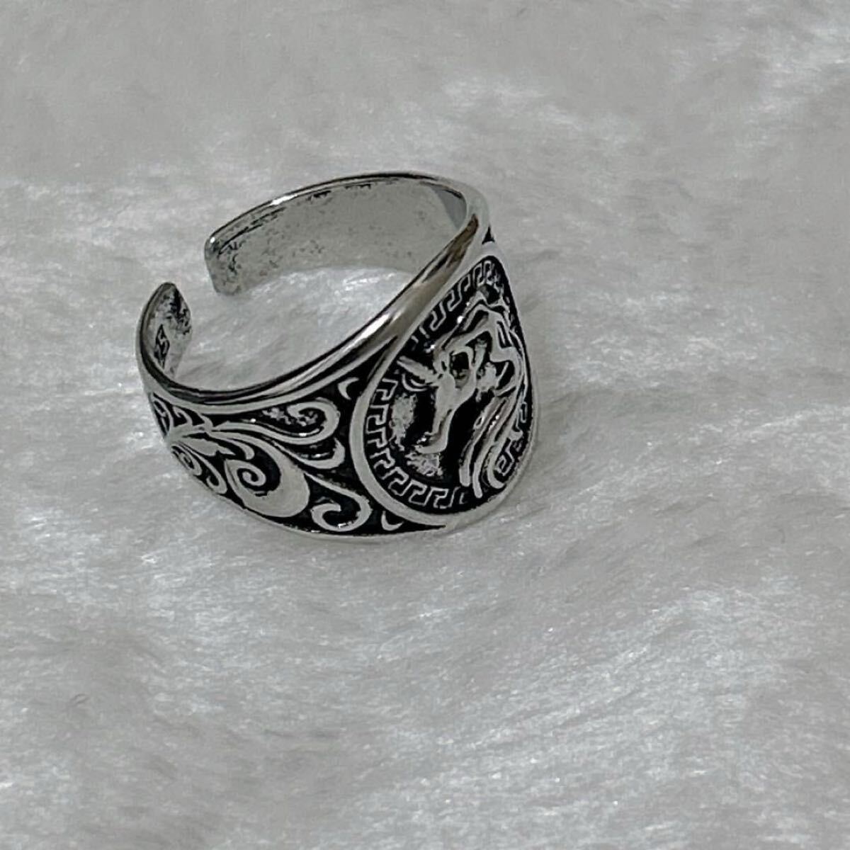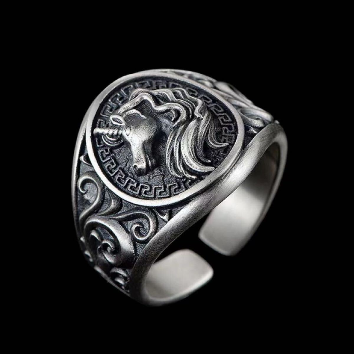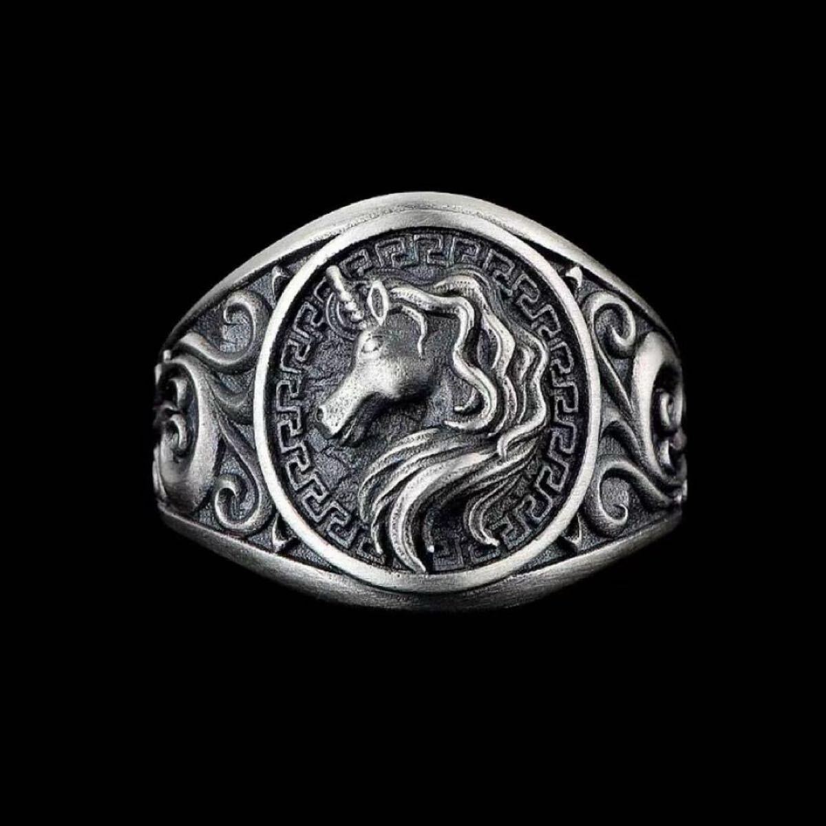【商品説明】:ユニコーンの彫刻が施されたヴィンテージ調のリングです。神秘的なユニコーンの姿をモチーフにした
