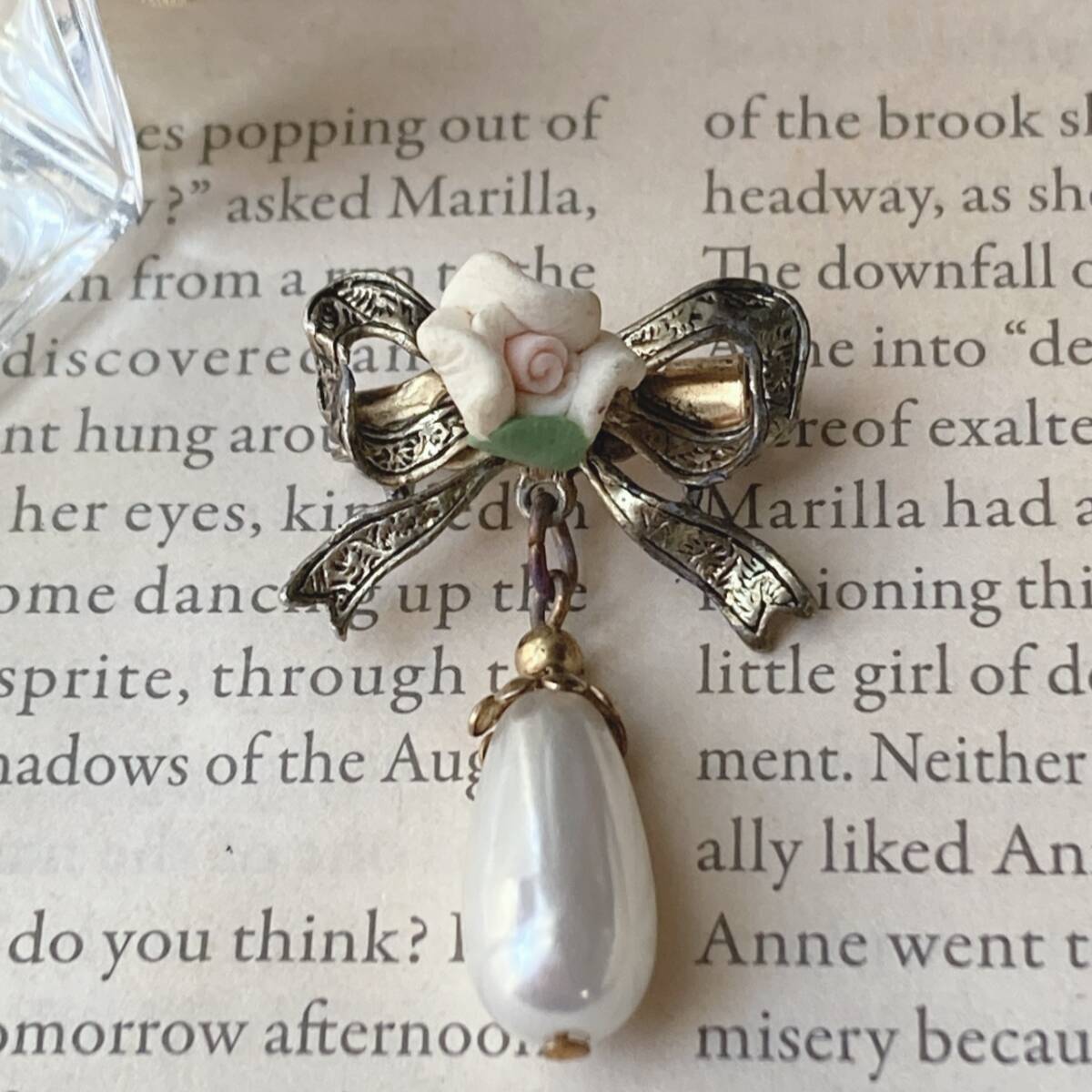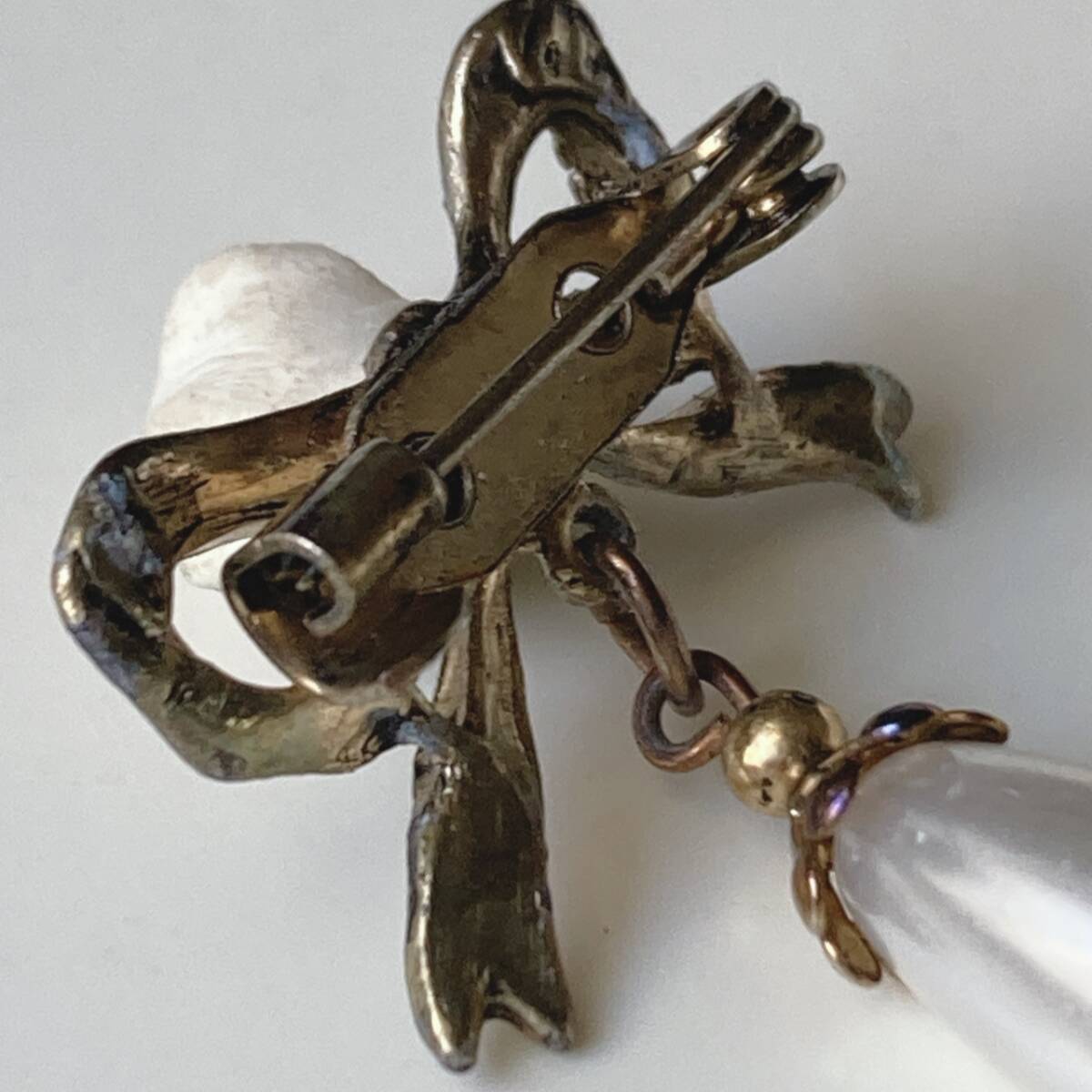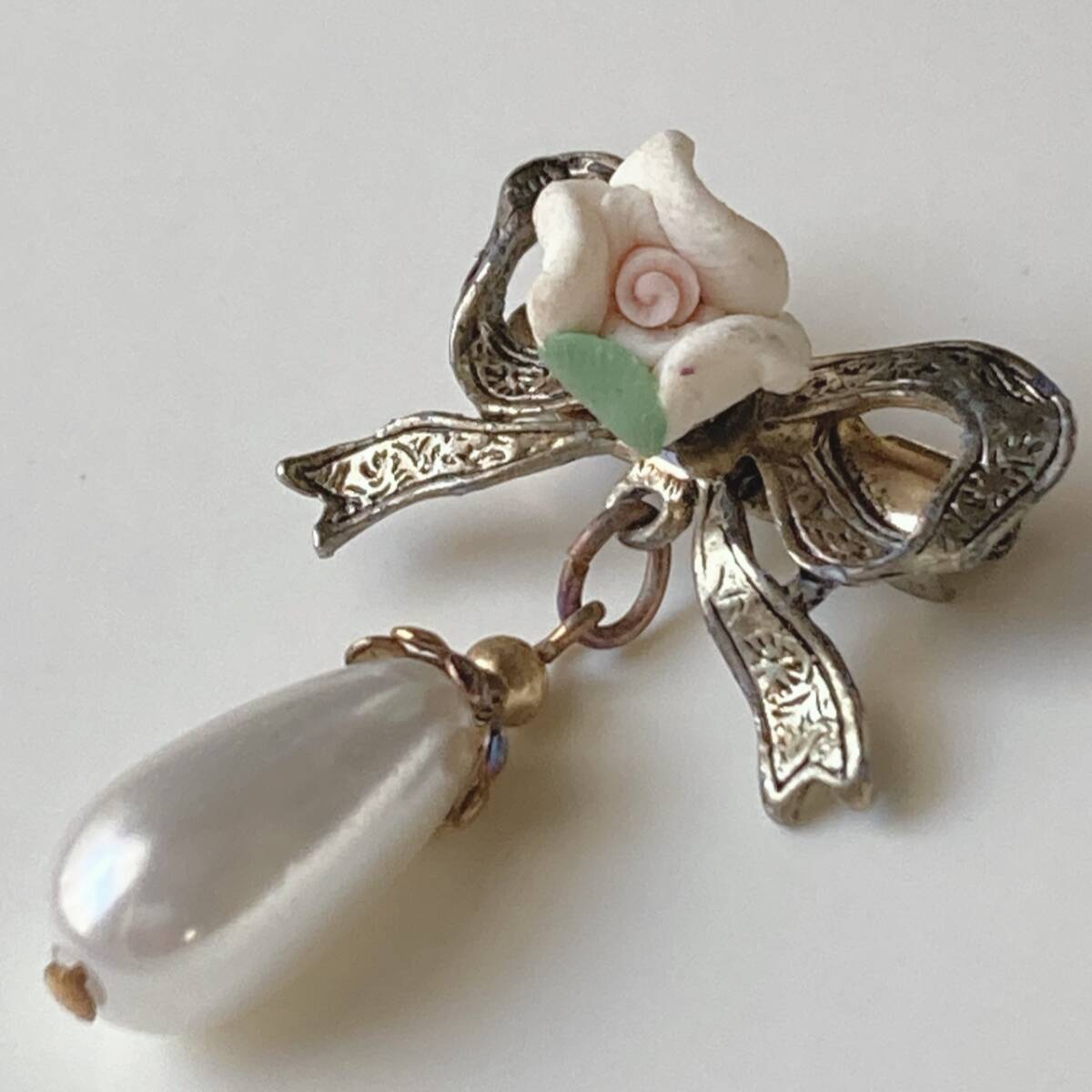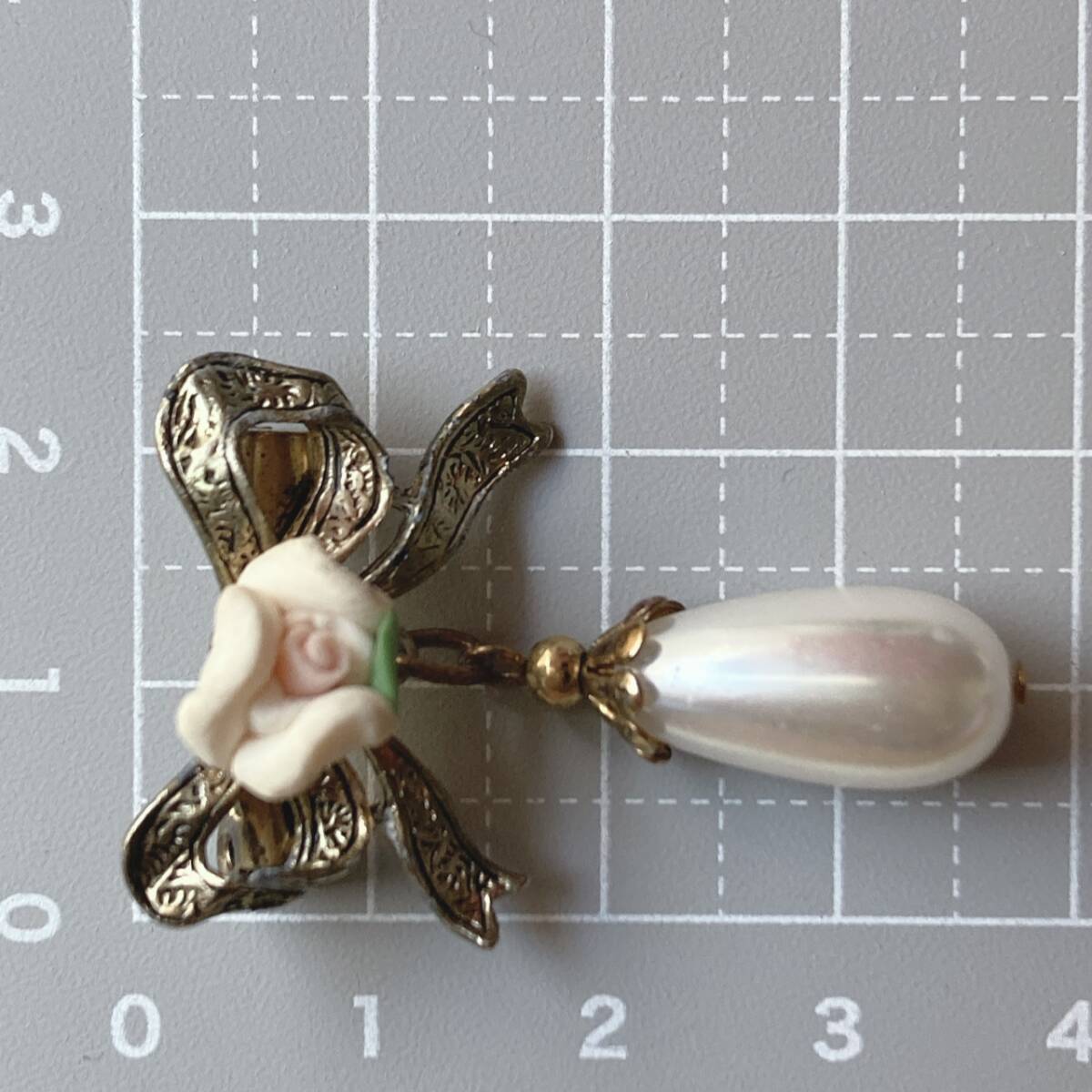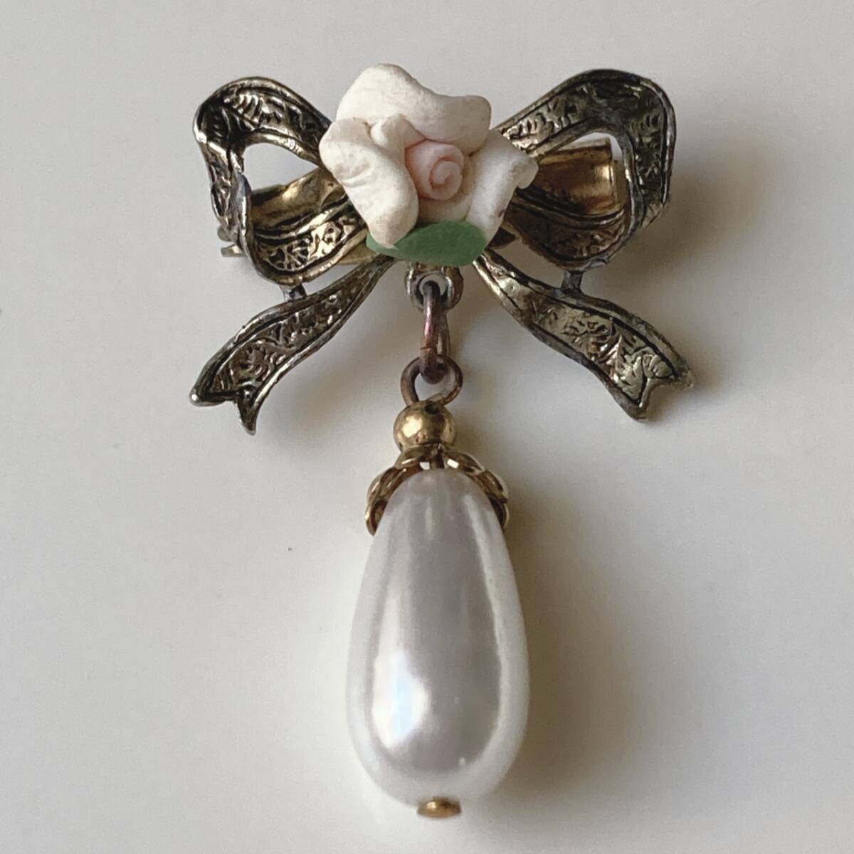 ヴィンテージブローチ ゴールドリボン 薔薇 ローズ パール ゆらゆら USA☆vintage jewelry accessoriesR0868
