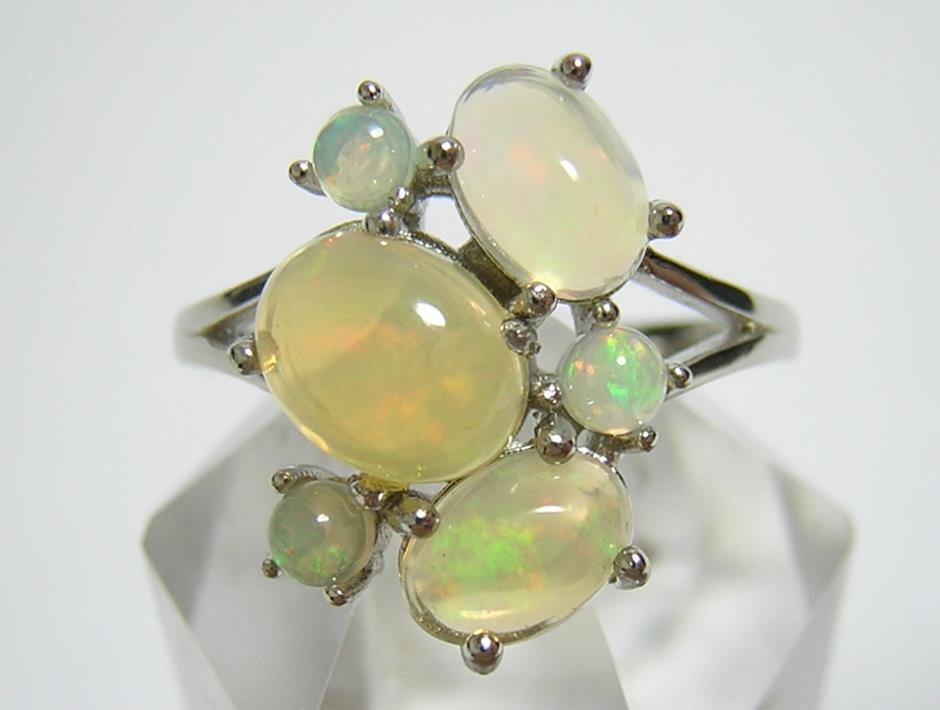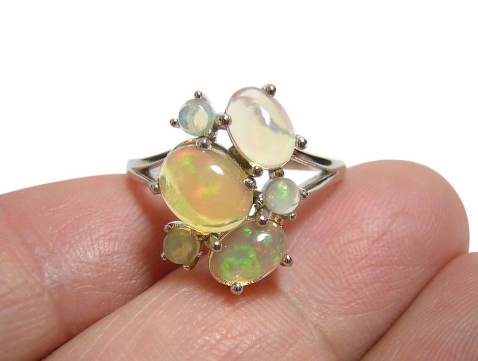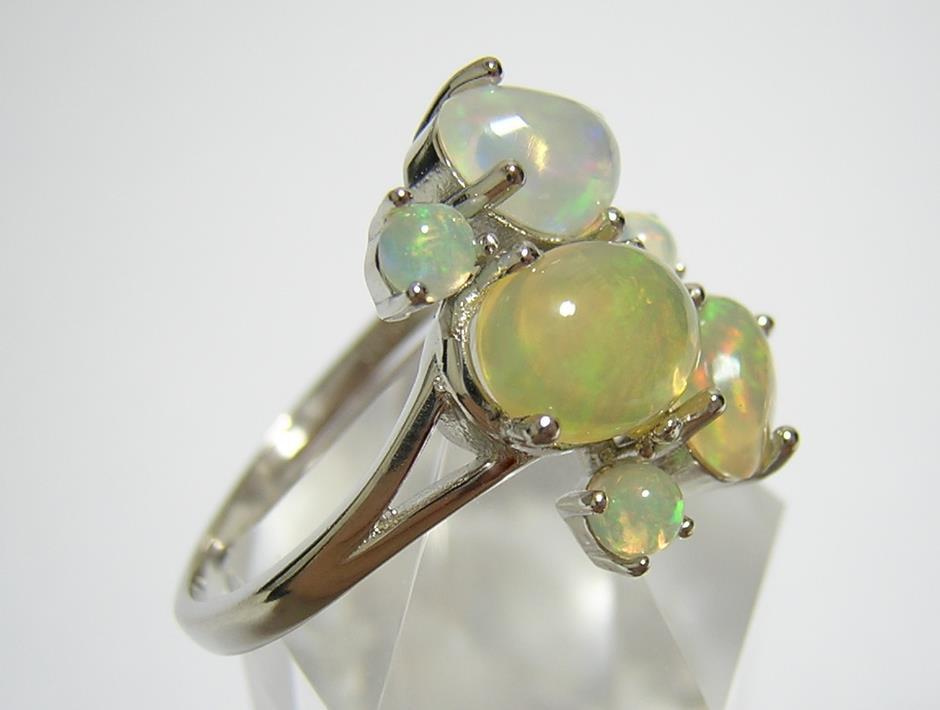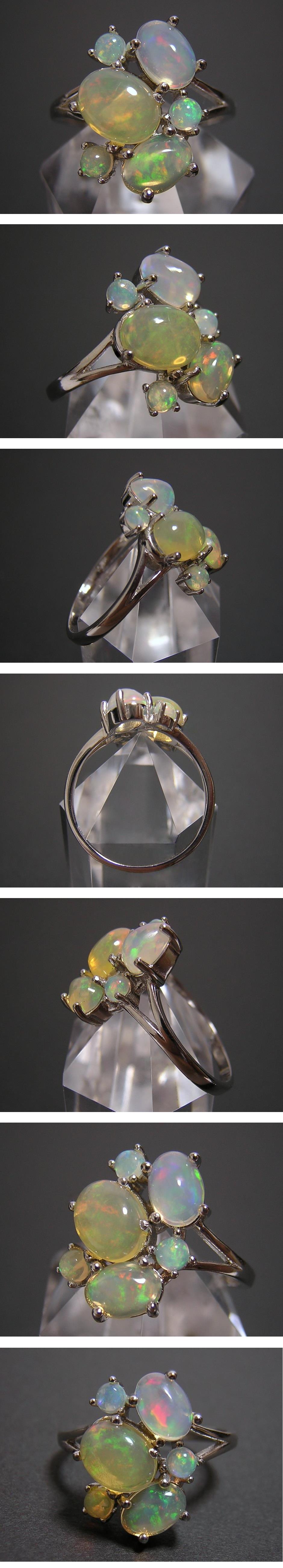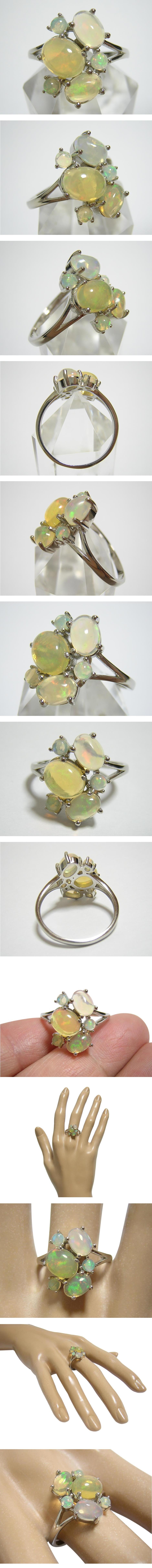 エチオピア産の天然オパールを使用したデザインリングです。 一番大きなオパールの大きさは約8×6mmです。 【石名】天然オパール 【産地】エチオピア産 【処理】非加熱 【カット】オーバルカボションカット、ラウンドカボションカット 【重さ】3.4g 【サイズ】18.75号 (お直しは承れません) デザイン部:縦17mm×横21mm 【素材】シルバー925 (14金ホワイトゴールド仕上げ) 【刻印】S925 【状態】新品 ※地金部分に製作時からの微細な小傷やスレがあります。 |
