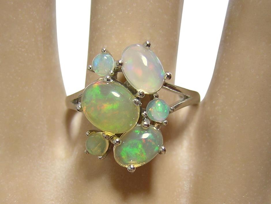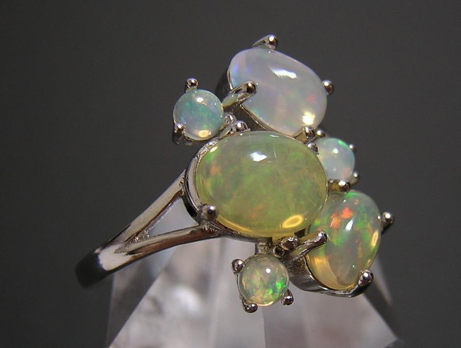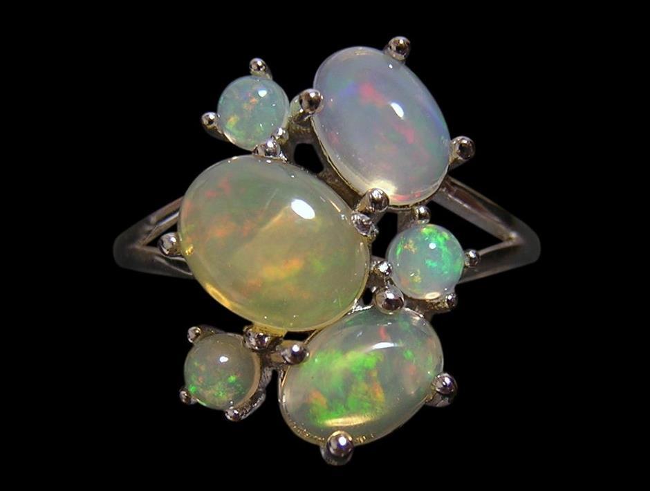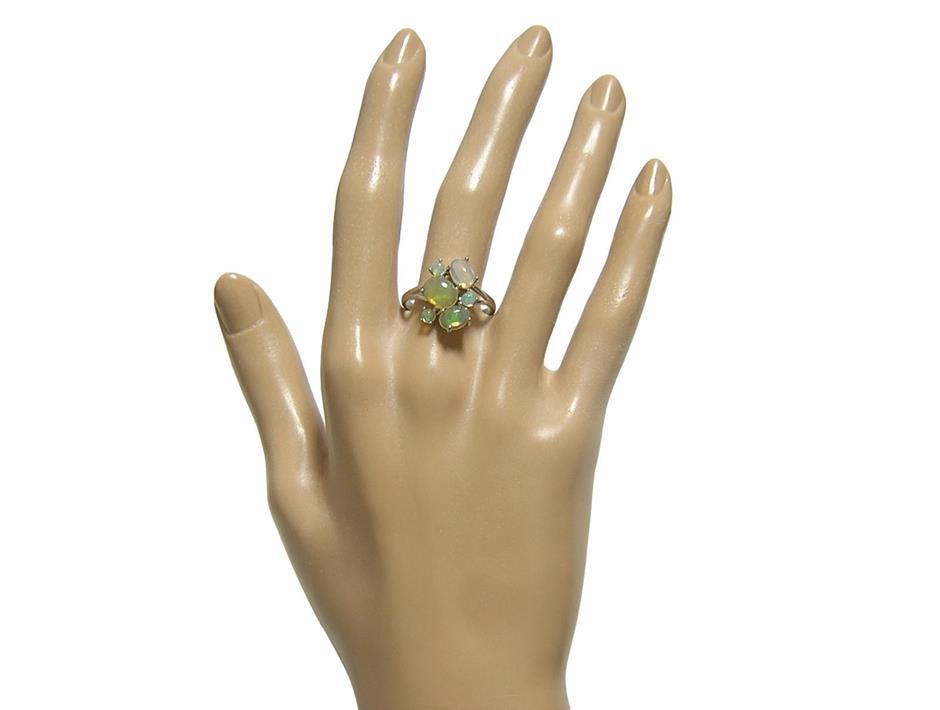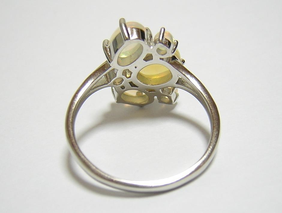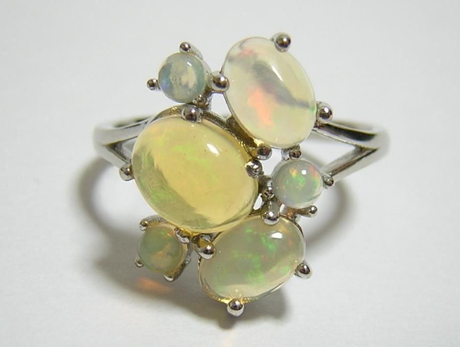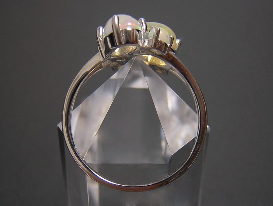 エチオピア産の天然オパールを使用したデザインリングです。 一番大きなオパールの大きさは約8×6mmです。 【石名】天然オパール 【産地】エチオピア産 【処理】非加熱 【カット】オーバルカボションカット、ラウンドカボションカット 【重さ】3.4g 【サイズ】18.75号 (お直しは承れません) デザイン部:縦17mm×横21mm 【素材】シルバー925 (14金ホワイトゴールド仕上げ) 【刻印】S925 【状態】新品 ※地金部分に製作時からの微細な小傷やスレがあります。 |
