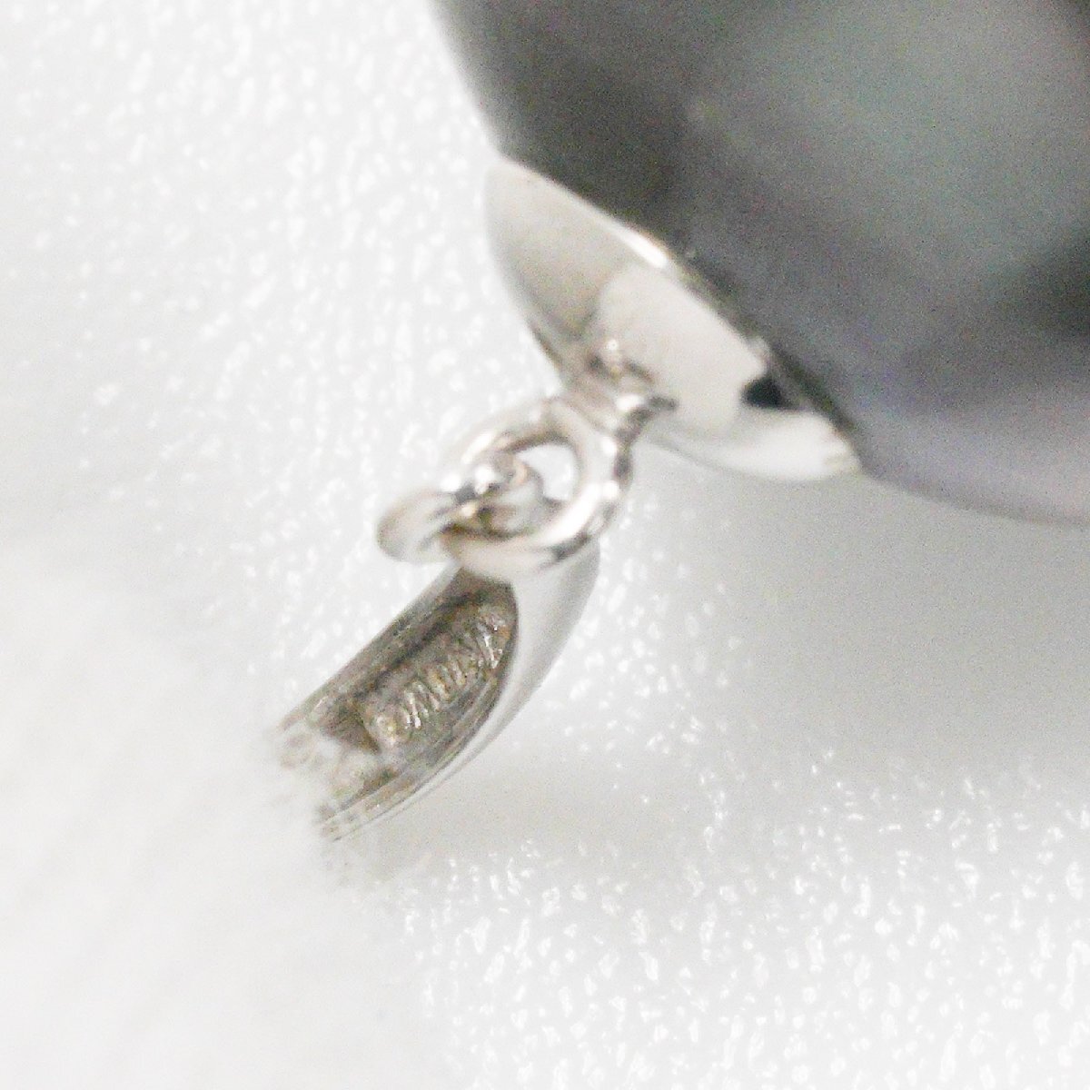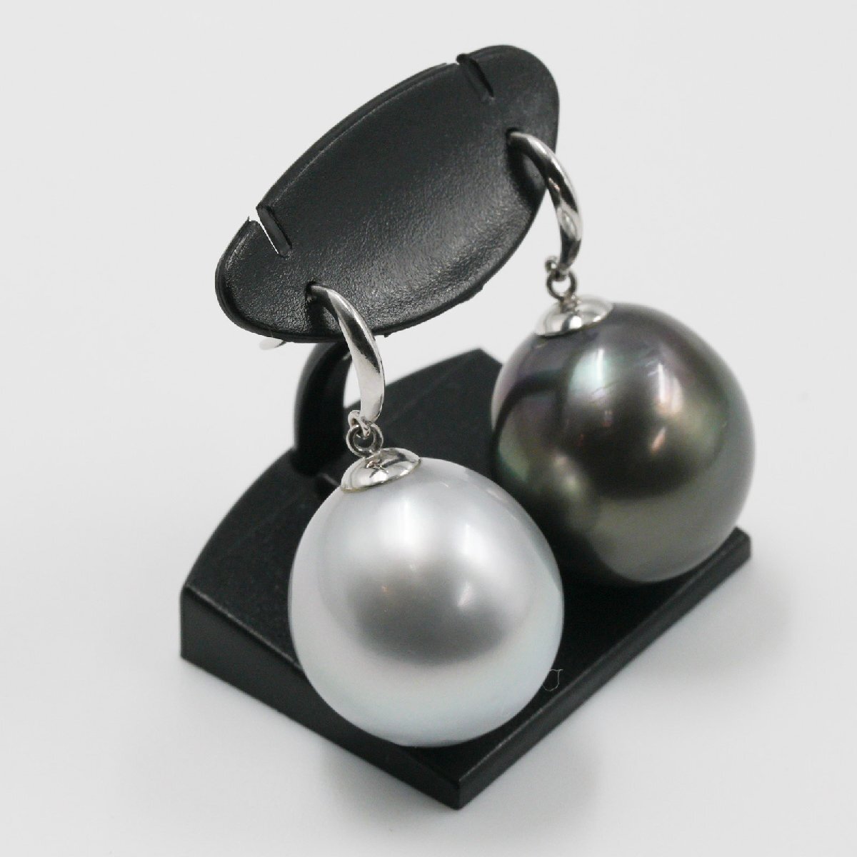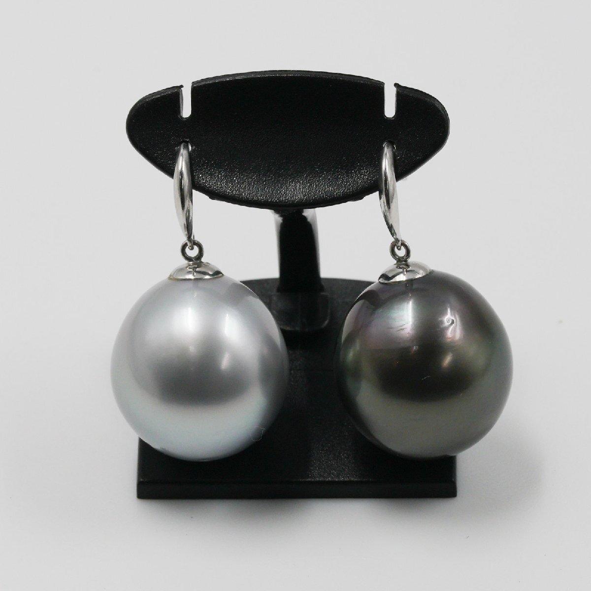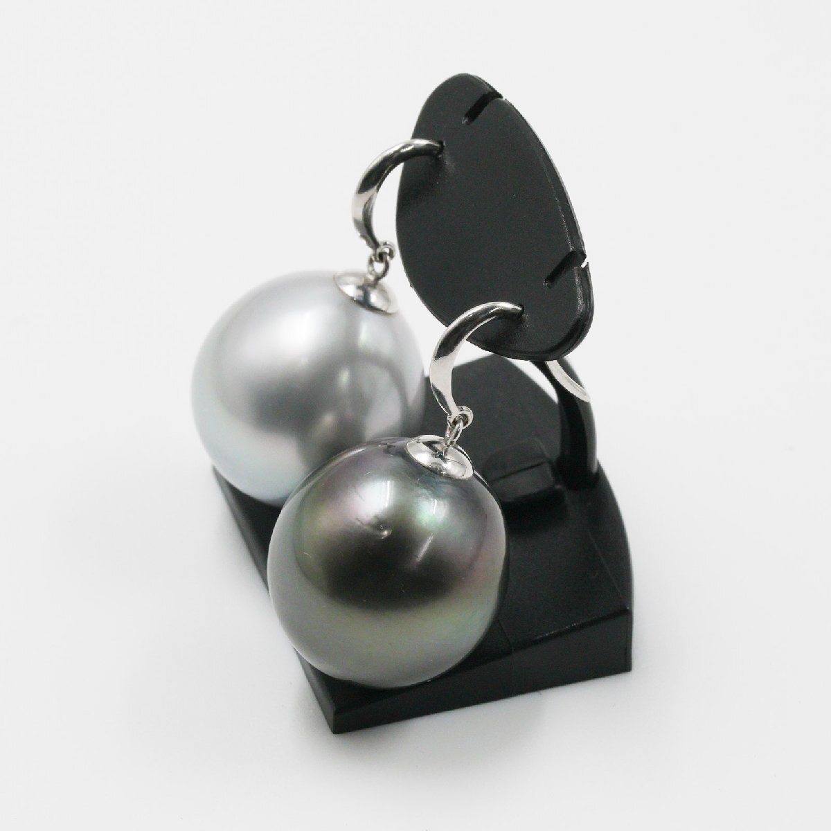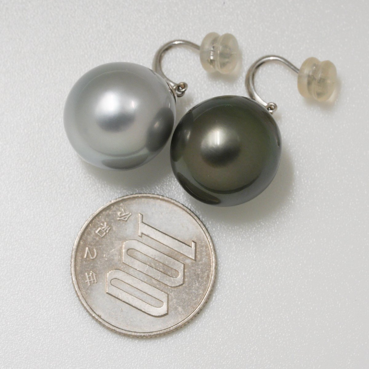 大粒の黒蝶真珠を使ったピアスです。左右で色が異なります(シルバーとブラック)。パール表面にエクボがありますが、テリの良い珠が使われています。