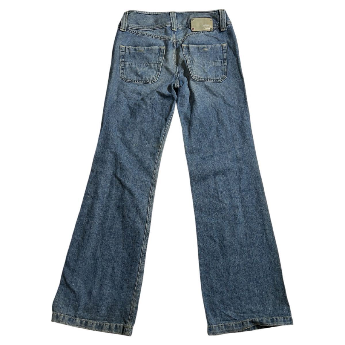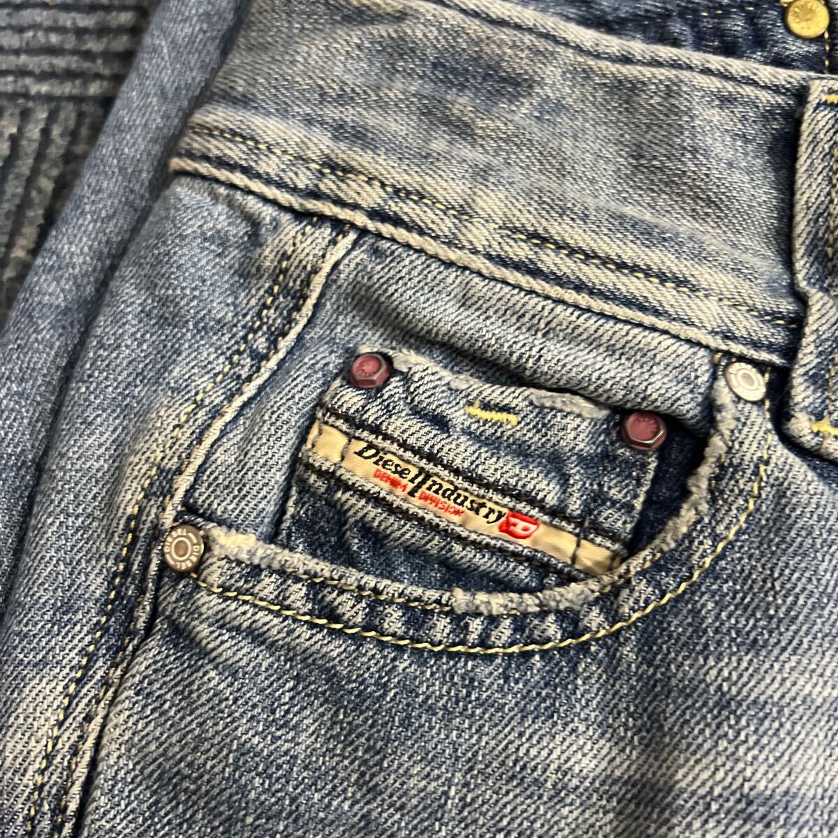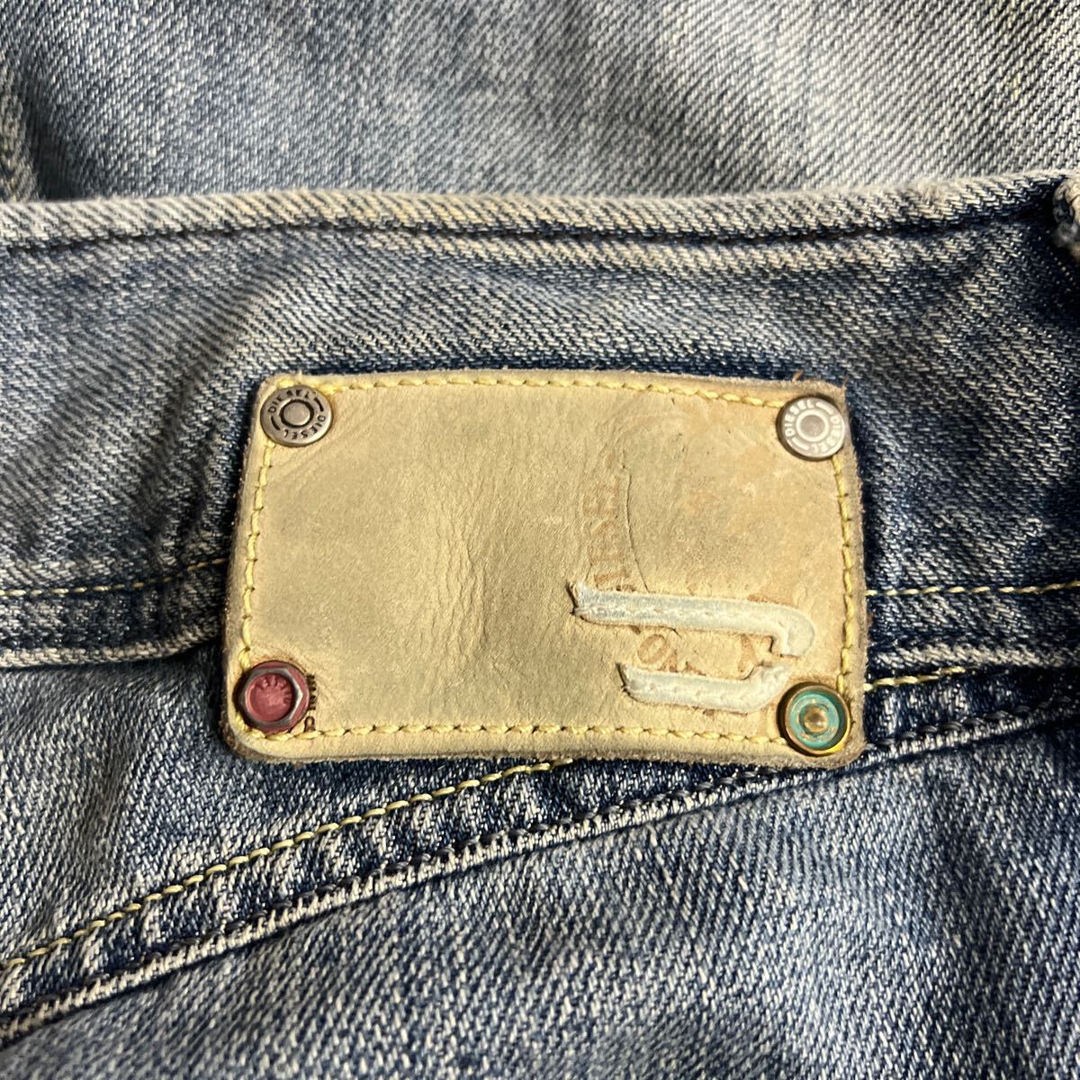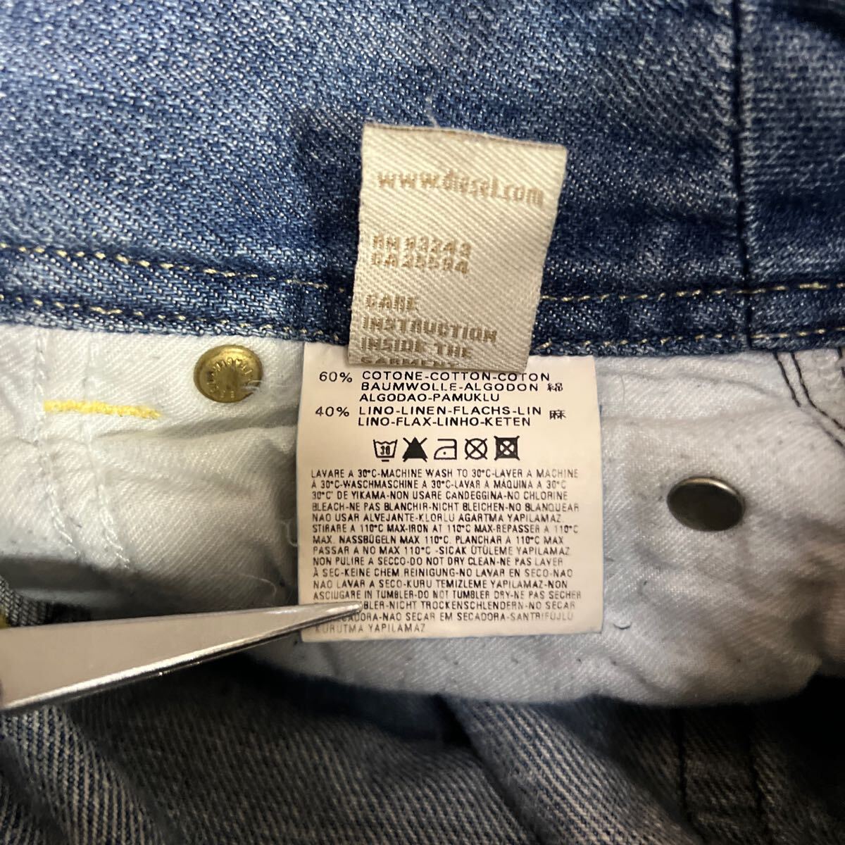LAMBRY ロゴ パッチ ユーズド 色落ち ダメージ加工 リネン混 ブーツカット デニムになり大変格好良くお洒落で格好いいです