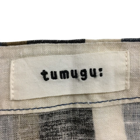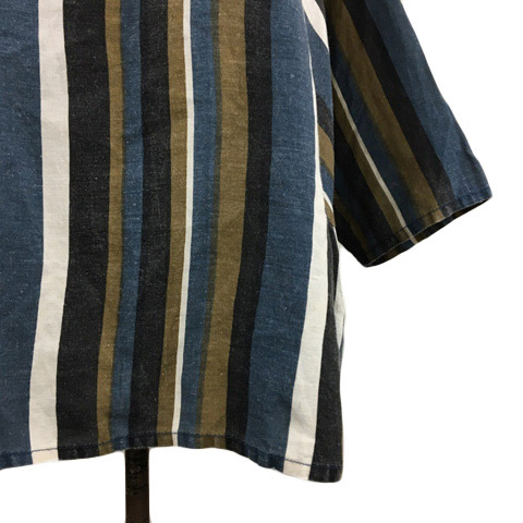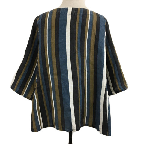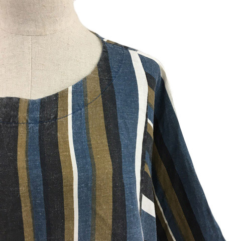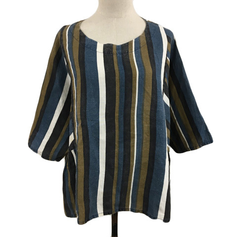 ツムグ TUMUGU カットソー ラウンドネック プルオーバー ストライプ リネン 七分袖 F 青 黒 ブルー ブラック レディース