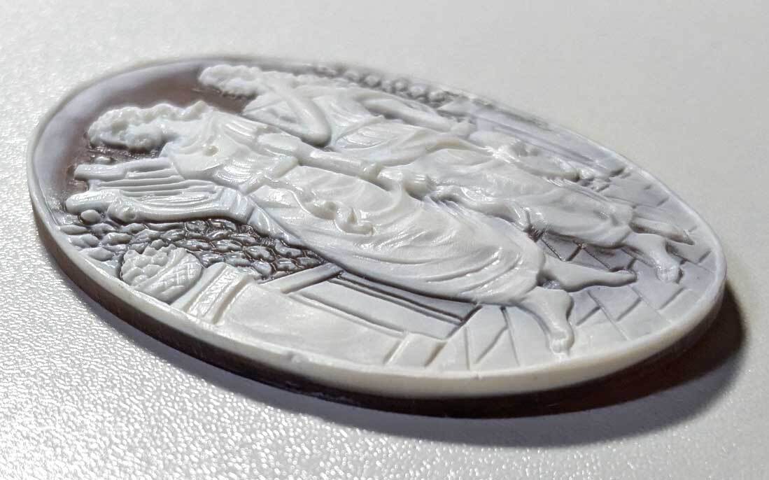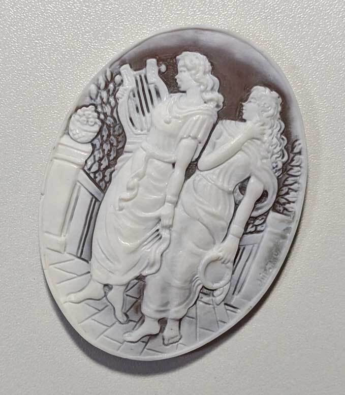 gen_024 カメオ シェル 天然 貝細工 ルース 美品 オーバル ★ ブローチ ペンダント ネックレスに! 全身 ハープ 楽器 籠 サイン 刻印