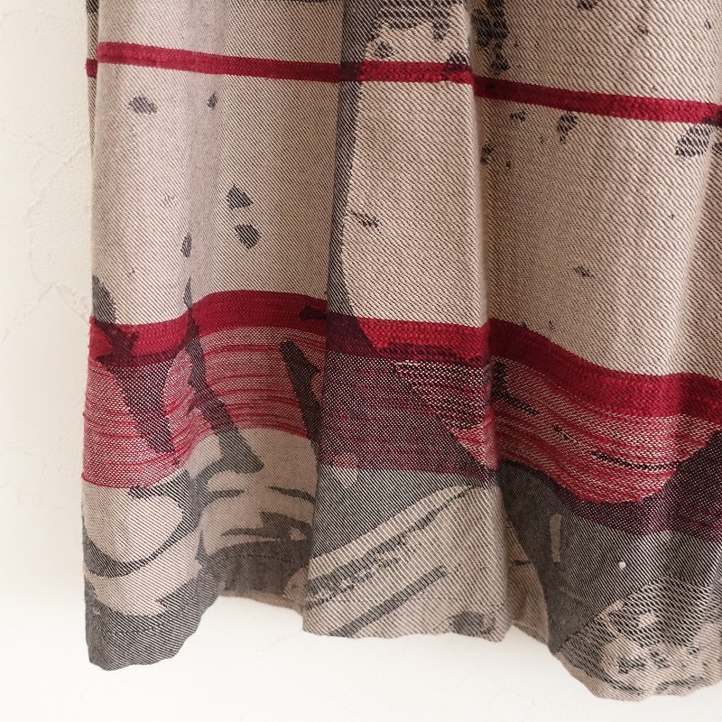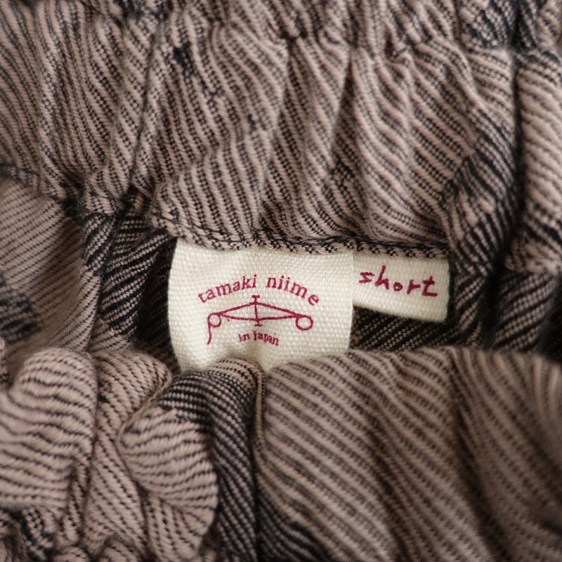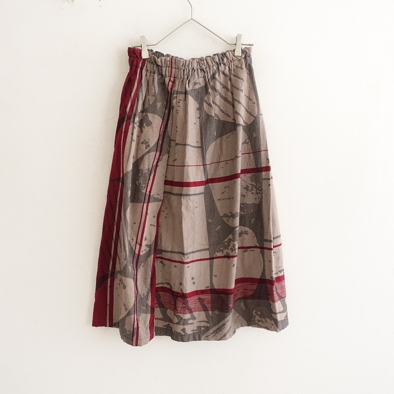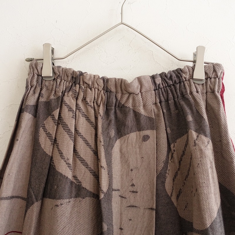 tamaki niimeのPOWAN SKIRT SHORTです。カラーはベージュ・フレー・ダークレッドなどの配色使い(graffiti)です。立体感のある織り柄の綿生地を楽しむ、シンプルなスカートです。透け感はなく、程い厚みがございます。ウエストは通し穴が施されたゴム入り。腰周りにタックが3つ施されております。ポケットはございません。 |