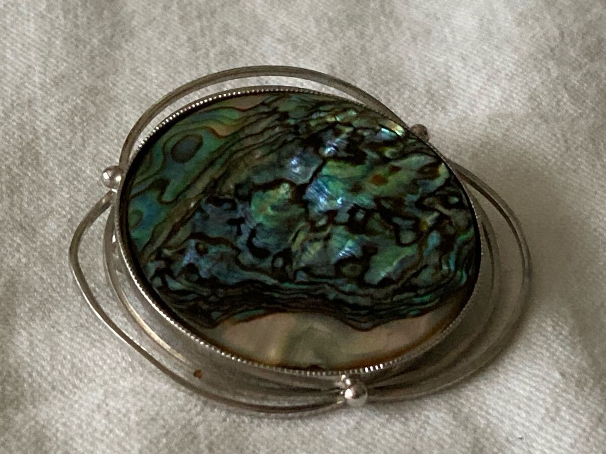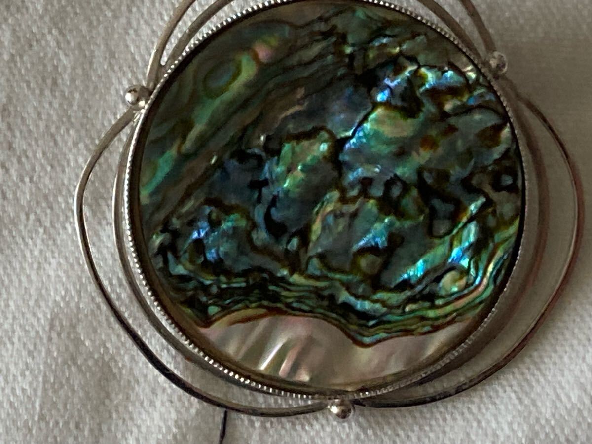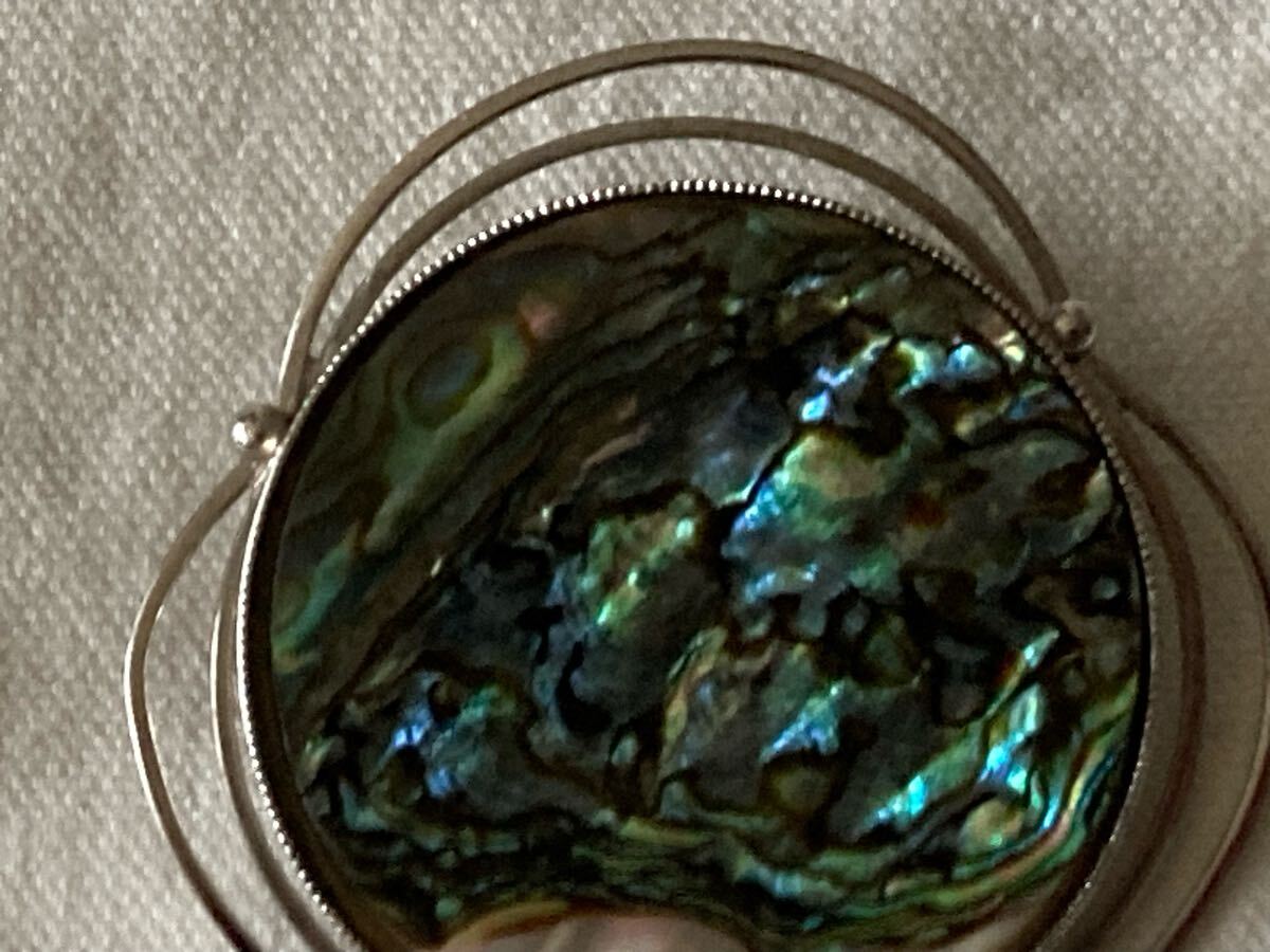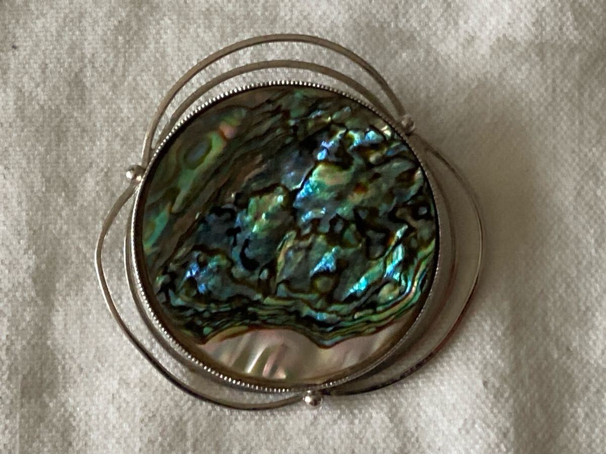 アバロンシェルの美しい色合いを持つ円形ブローチ。