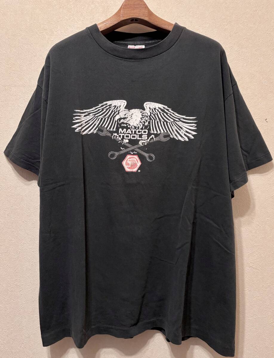 黒フェードUSA製90sビンテージMATOO TOOLSロゴ企業TシャツXL丸胴ヘビーウェイト墨黒コットン袖裾シングル米製US製アメリカ製90年代オールド