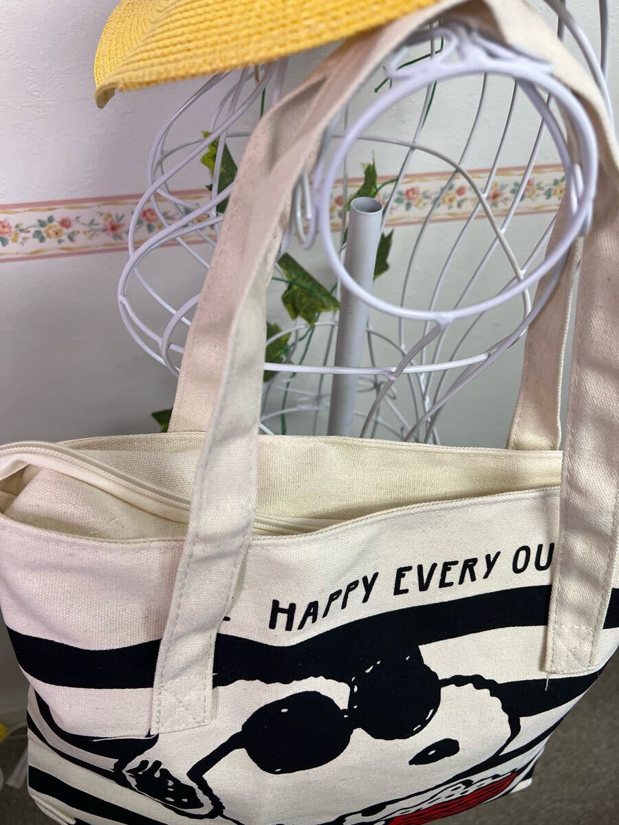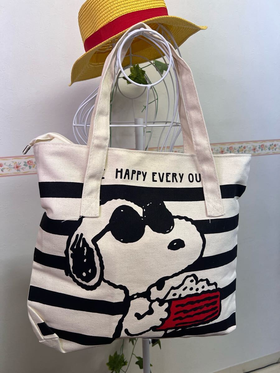 トートバッグはボーダー柄にサングラスをかけたスヌーピーがプリントされたデザインです。