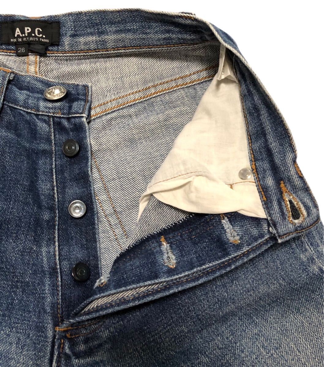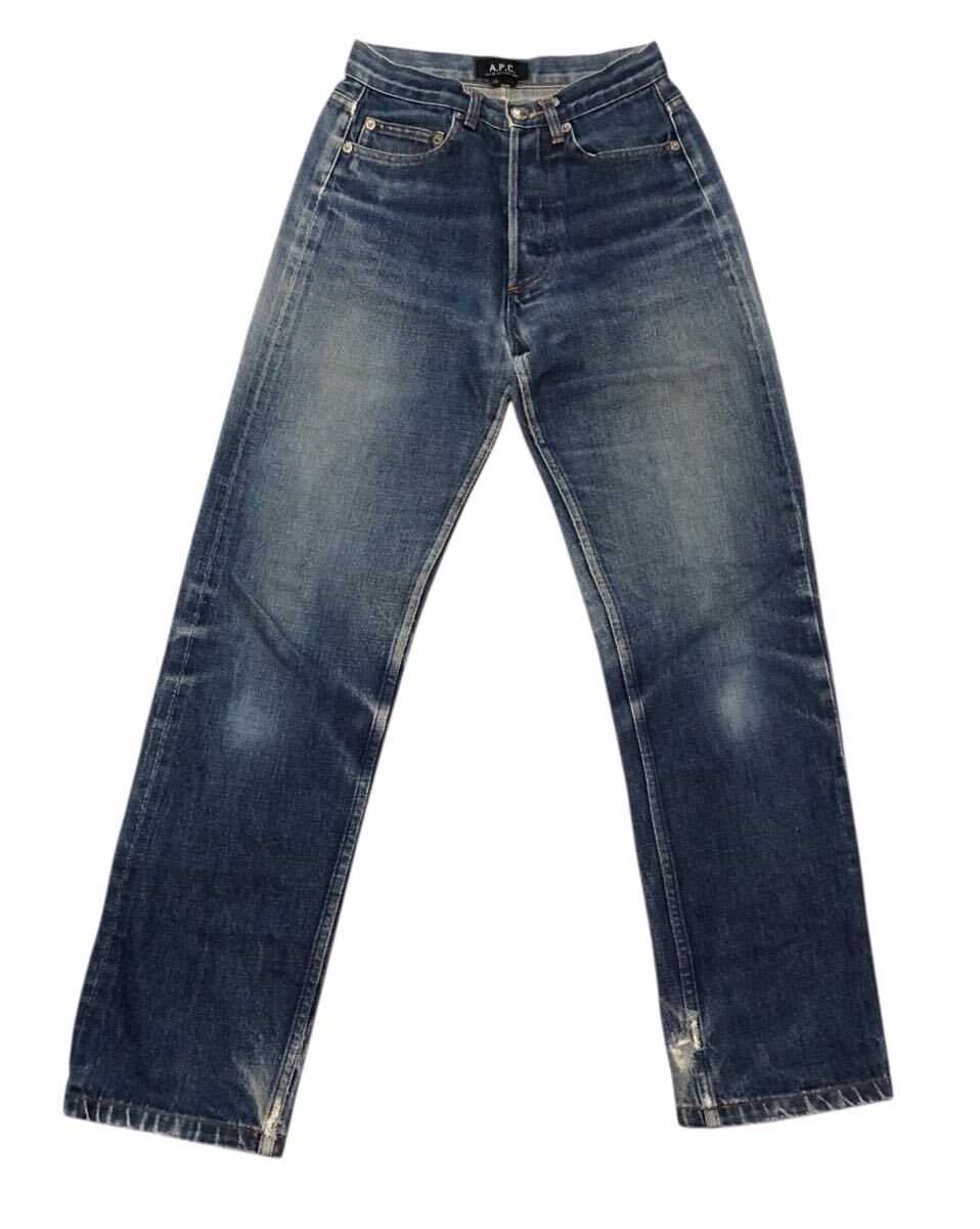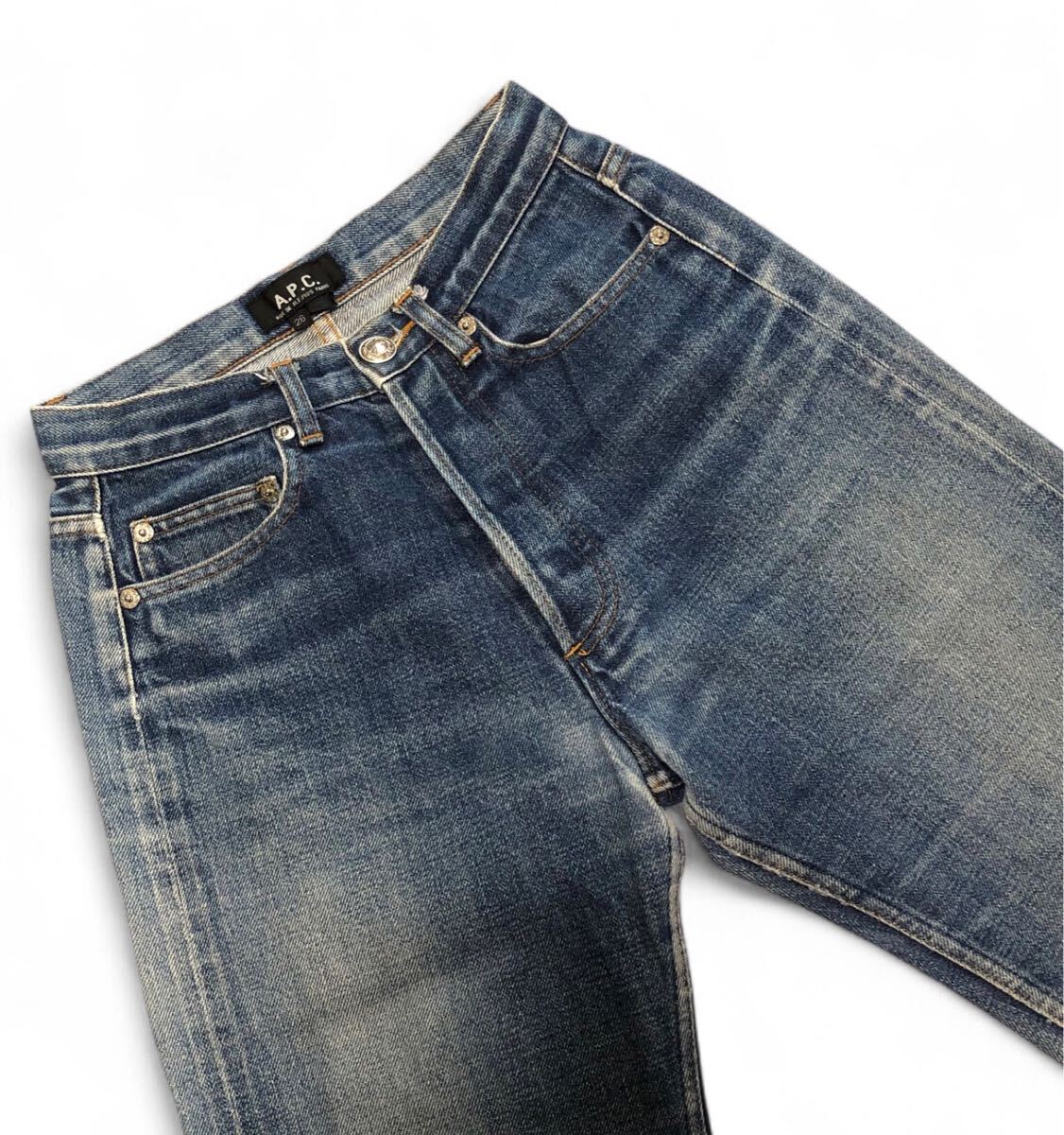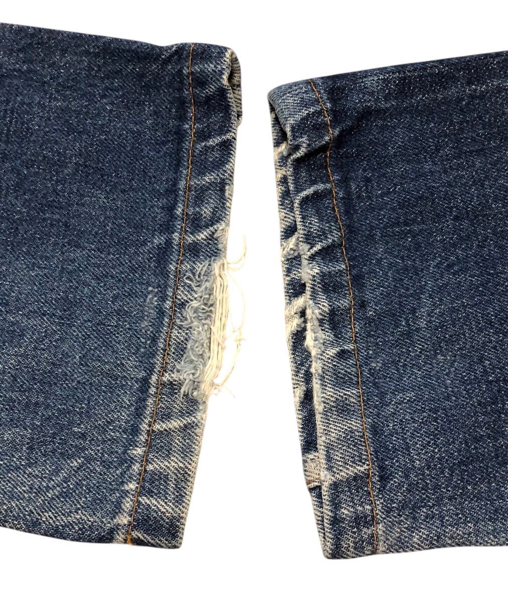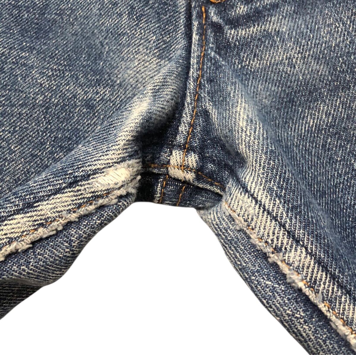 少し色落ちがあります。裾にダメージ、股下にスレがあります。