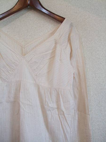 | 商品紹介 | クリームのようなベージュにゴールドのストライプが入った 長袖ブラウスです。 肩、胸元、胸下にギャザーが入った適度なふんわり感のあるデザインです。 袖口には紐が通っていて、写真では伸ばしていますが、 縮めてギャザーを寄せて着ることもできます。 《素材》 綿95% ポリエステル5% |