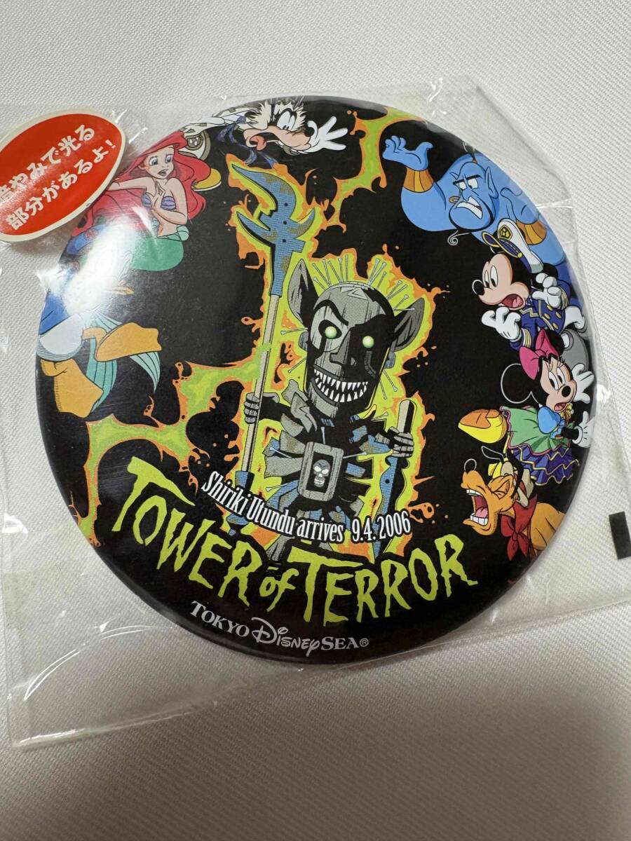 東京ディズニーシーで購入した「タワー・オブ・テラー」の缶バッチ