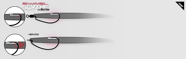 ワームを刺す際に生じた穴と同形状の直線的なベンドデザインは、ベンドカーブがワームを圧迫してズレる現象を抑える効果があります。