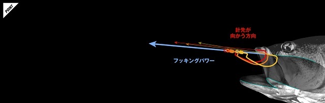 ワームに針先が刺さり込まない範囲でアプローチアングルを小さい角度で設計し、フッキングパワーのロスが少ない刺さり込みを実現します。