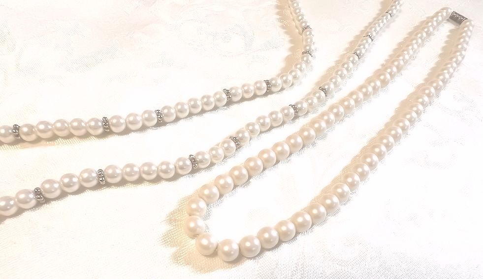 ◎7mm玉のやや重みのある正統派パール・ネックレスと、ゴールドのチップが入ってアクセントになったロングタイプのネックレスです。どちらも上品で、セレモニーから、普段のお出かけにも着けやすいと思います。いかがでしょう★