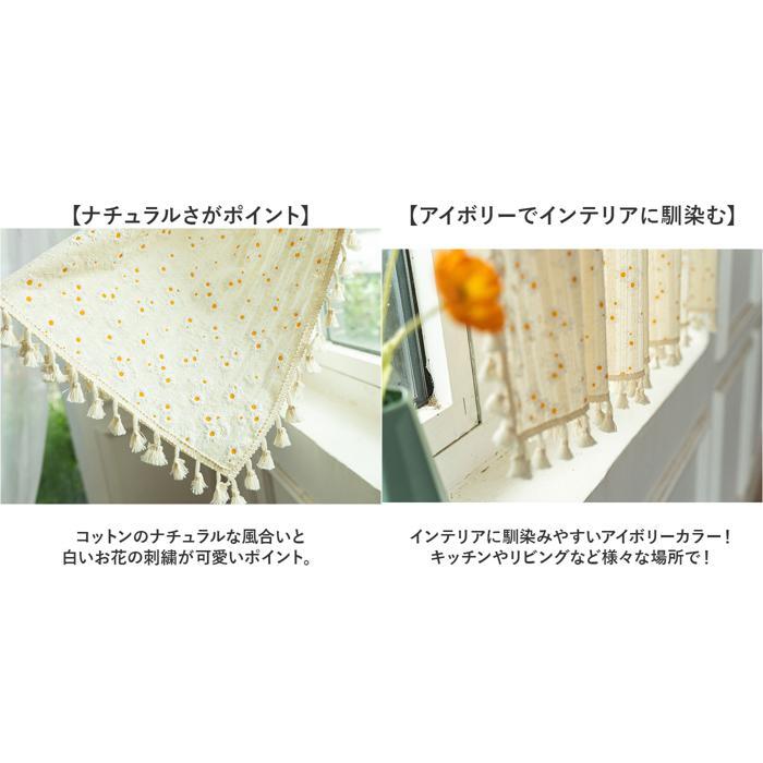 商品説明 | ・・ナチュラルさが可愛いフラワーカフェカーテンが発売。 ・【ナチュラルさがポイント】 ・コットンのナチュラルな風合いと白いお花の刺繍が可愛いポイント。 ・【アイボリーでインテリアに馴染む】 ・インテリアに馴染みやすいアイボリーカラー!キッチンやリビングなど様々な場所で! ・【一人でもお手軽にイメチェン♪】 ・突っ張り棒使用で設置カンタン。賃貸や傷を付けたくない場所でも安心して気軽にイメチェン♪ ・【圧迫感のないさり気ない目隠し】 ・リビングや小窓、キッチンの目隠しやインテリアに大活躍。さり気ない目隠しが嬉しい。 ・【立体感が出るフリンジ】 ・オーバーサイズでもステッチ部分にフリンジがあり立体感が◎自分好みの部屋にカスタマイズ! |