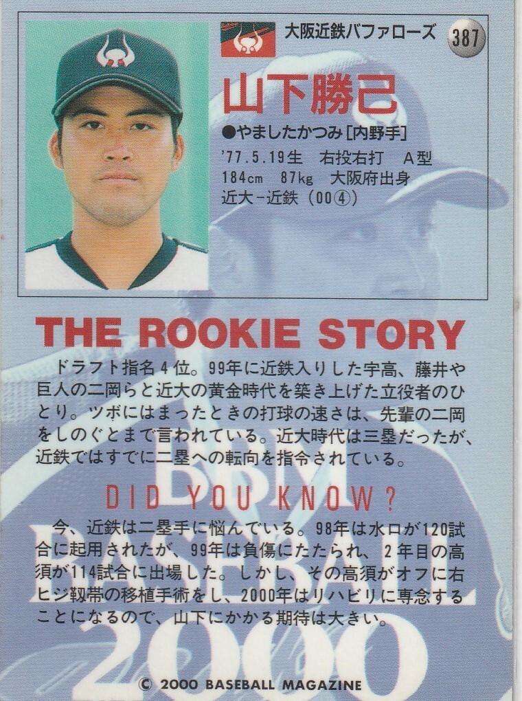●2000BBM【山下 勝己】 ルーキーカード No.387:近鉄 R