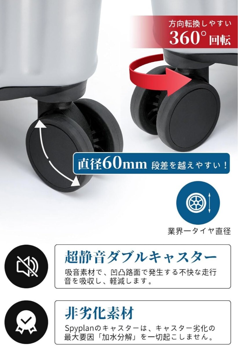 超静音キャスター搭載 従来比70%静音化キャスターを採用。ホテルや深夜空港でも周囲を気にせずスムーズに移動可能。ゴム製ベアリングと防振設計で、凹凸道でも音を立てません。