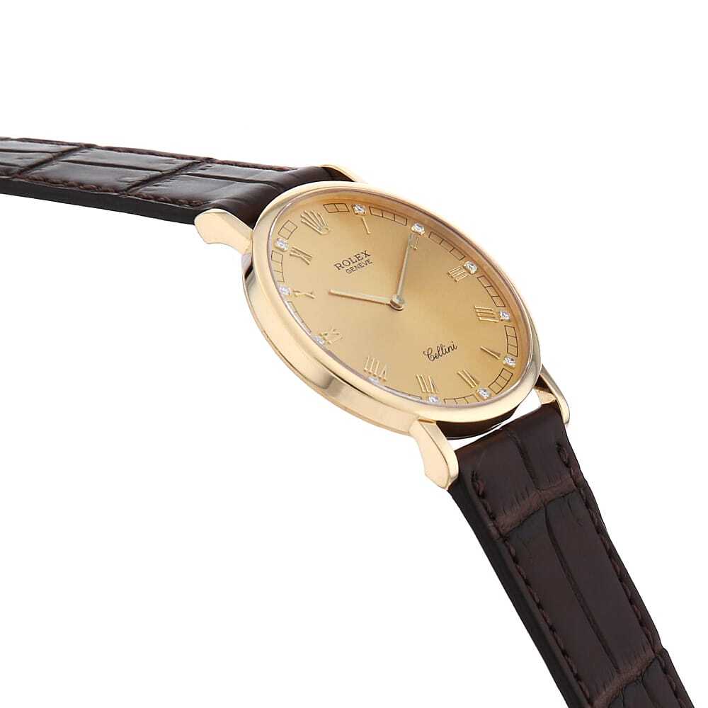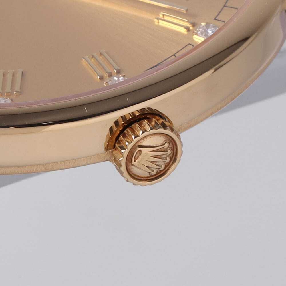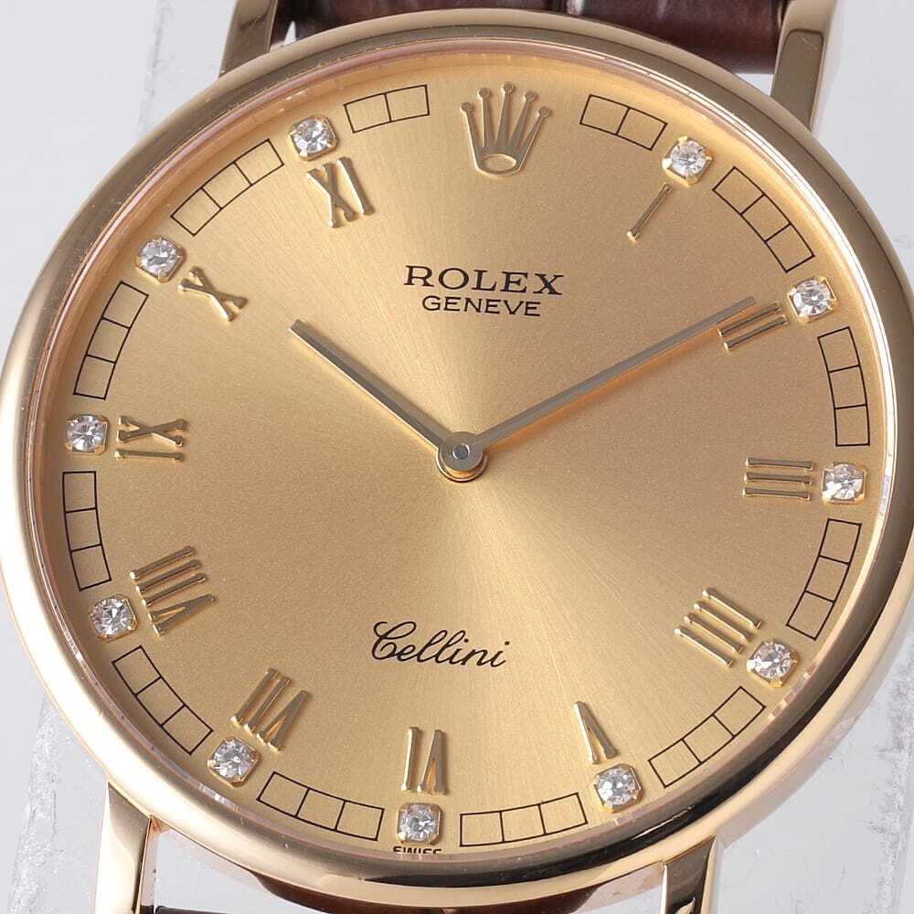 モデル情報 | イタリア・ルネッサンス期の有名な金細工士「ベンヴェヌート・チェッリーニ」の華麗な作風にインスピレーションを得て作られたチェリーニコレクション。タフな機械式時計のイメージが強いロレックスの中で、完全なるドレスウォッチとして製作された珍しいモデルです。こちらはインデックスに11Pのダイヤモンドが控えめにセッティングされており、シーンを選ばずに上品な雰囲気を演出してくれるタイムピースです。 |