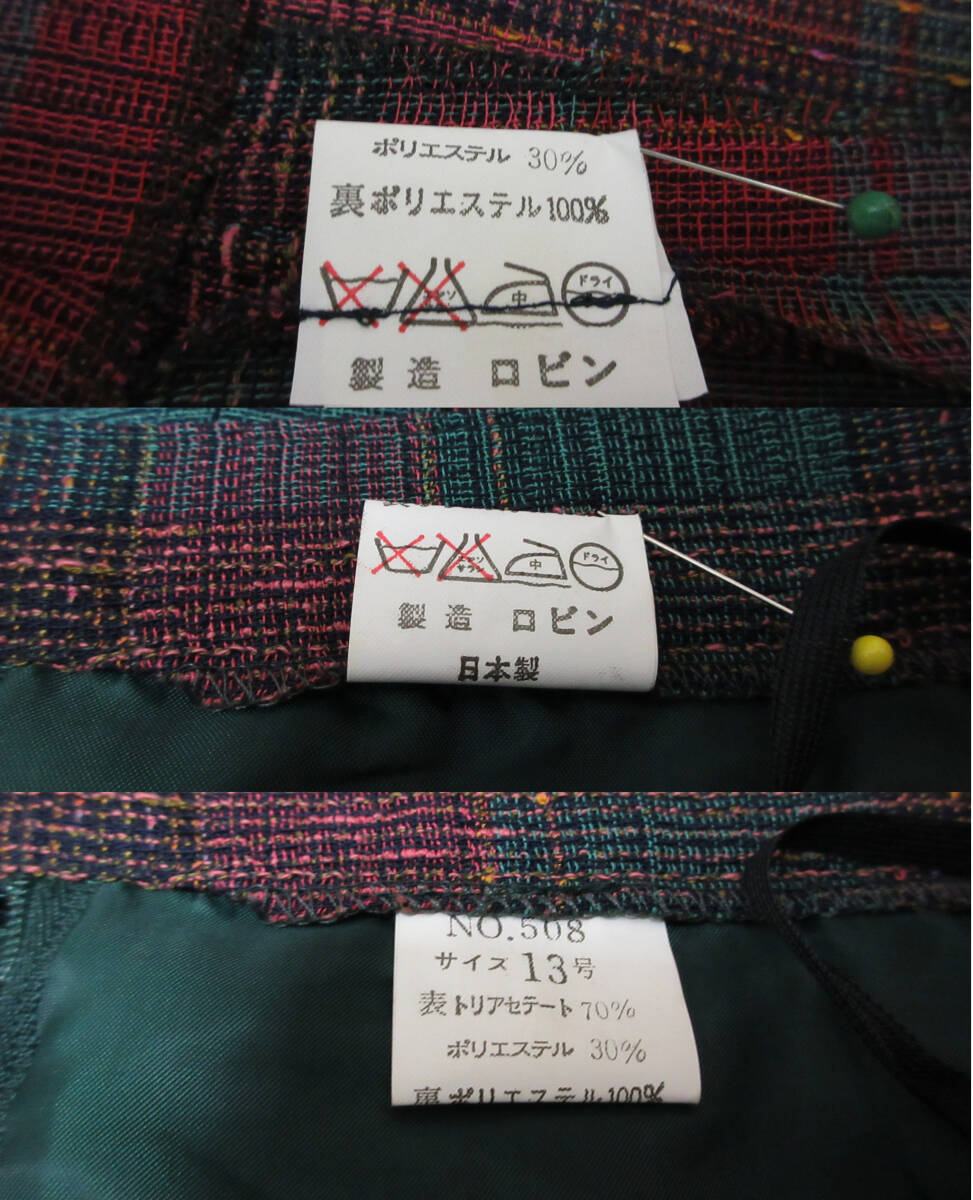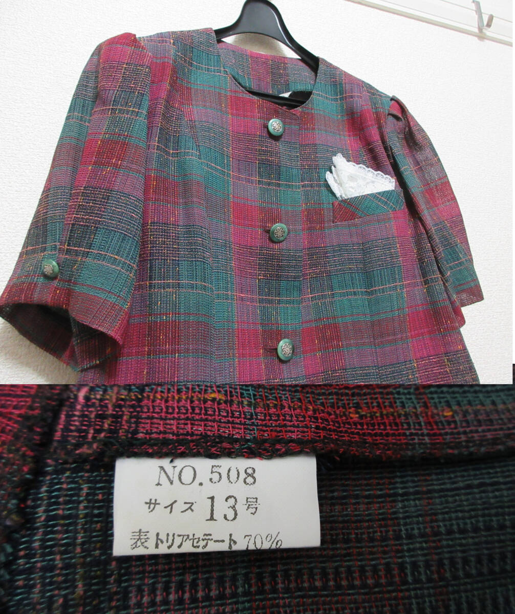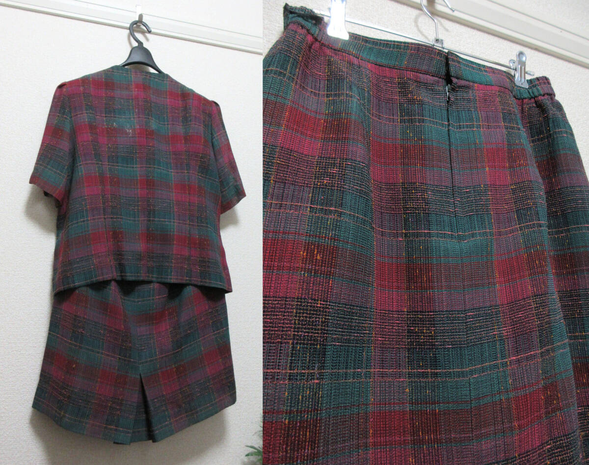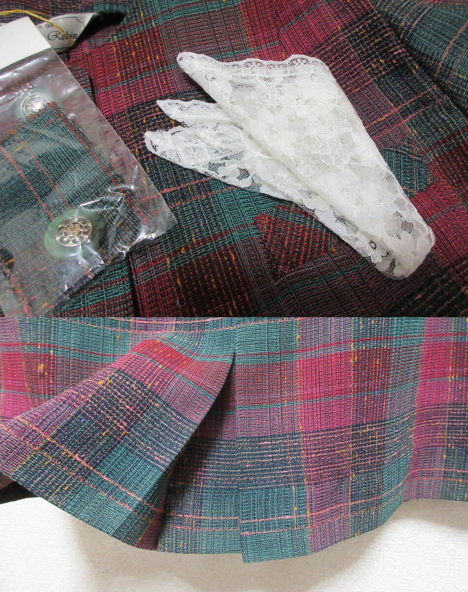 | ■商品説明■ | 【ノーカラーフォーマルセットアップスーツ】の出品です。 メーカー:【Madam Robin】マダムロビン【日本製】 カラー:赤レッド、緑グリーン、黒ブラック、黄色イエロー(チェック柄) 品質:表地:トリアセテート70%、ポリエステル30%(裏地:ポリエステル100%) サイズ:13号(Lサイズ) 重さ:410g 【ジャケット】 ●肩幅:38cm ●身幅:51cm ●着丈:52.5cm 【スカート】 ●スカート丈:62cm ●ヒップ:51cm ●ウエスト:76cm 【ポケットチーフ付き、替えのボタンと生地付き】 【特徴】 Madam Robin(マダムロビン)の未使用のフォーマルセットアップスーツになります。 フォーマルな席にも着て頂けるノーカラーのアウター。 丸襟ネック(ノーカラー)は、結婚式や、お子様の入学式、卒業式、記念式典、謝恩会、パーティー等の フォーマルな席、 授業参観などのちょっとした席にも1枚あると大変便利なアイテムです。 生地にトリアセテートが使われているため吸湿性がありシルクのような光沢と滑らかさがあります。 夏場の時期も、比較的サラリと着て頂けると思います。 ポリエステルも使わせているため、丈夫でシワになりにくく学生服にも使われるほど耐久性があります。 初夏から秋口にかけて、冷房の利いた室内と外気温の差が激しい季節となりますが ブラウスやキャミソール等の上に羽織って頂けると体温調節がうまくできるのではないでしょうか。 色見はワインレッド(ボルドー色)えんじ色、深緑(ダークグリーン)のチェック模様で、 黒や黄色の糸も織り込まれています。 近くで見ると様々なカラーが織り込まれていますが全体的に見ると落ち着いた色身になっています。 胸元にポケットチーフ(小さなレースのハンカチ)が折りたたんで入っています。 スカート背面にはタック(ひだ)が入っているため動きやすいデザインになっています。 また、深緑の裏地がついていて透け防止になっています。 替えのボタンと生地も付いています。 白色や同系色の赤系、緑系のブラウスやキャミソールなどと組合わせて頂くとしっくりくるかと思います。 比較的 落ち着いた色味になりますので、 フォーマルな席だけでなく オフィスワーク等にも着て頂けると思います。 日本製ですので縫製など仕立ては丁寧に作られています。 肩パットがついています。必要がなければ取り外して調整してください。 80年代ファッションを着こなしたい方にもよいかと思います。 未使品(新品・自宅保管品)になります。衣類品整理の為に出品します。ご活用頂ける方に。 商品の状態は画像をご参考にしてください。 自宅保管にて、神経質な方や細かい点を気になさる方は入札をお控えください。 商品説明に関して、あくまでも主観であり、詳細な状態に気付かない場合があります。 以上をふまえた上、ノークレーム、ノーリターンでお願い致します。 |