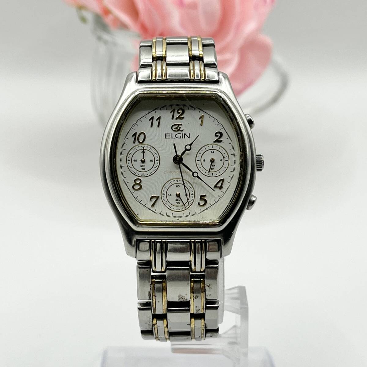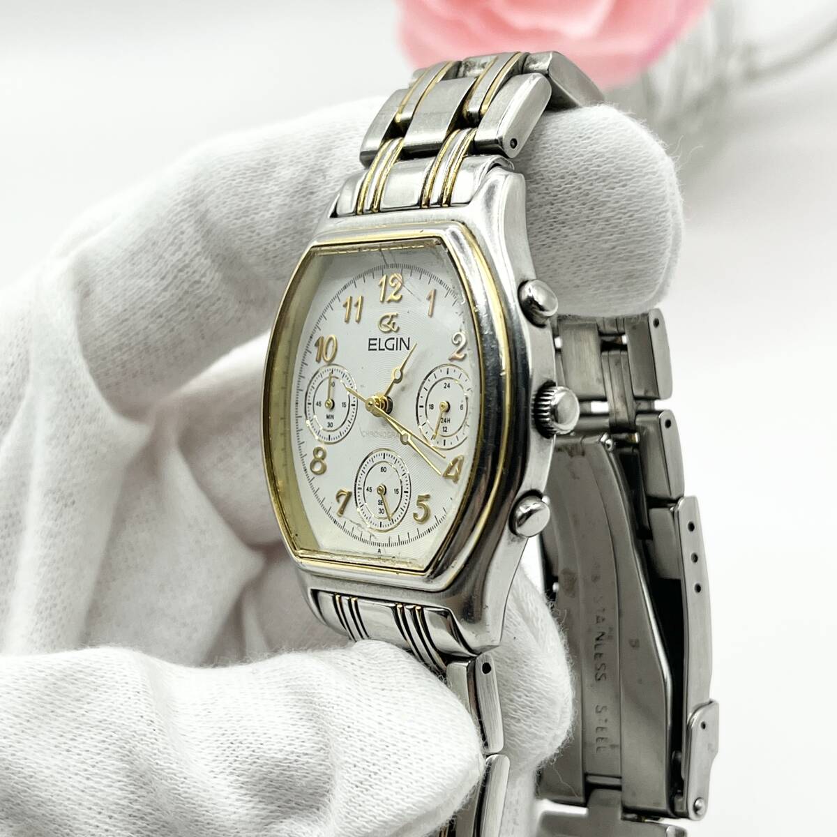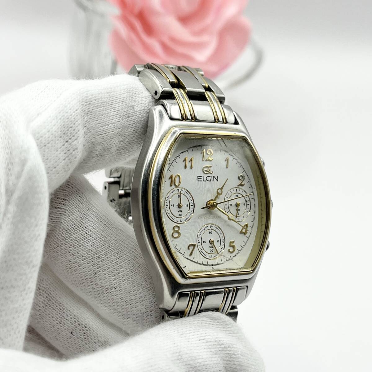《稼働品》ELGIN★エルジン★クォーツ 腕時計★クロノグラフ★トノー型★メンズ★シルバー×ゴールド★管理616a