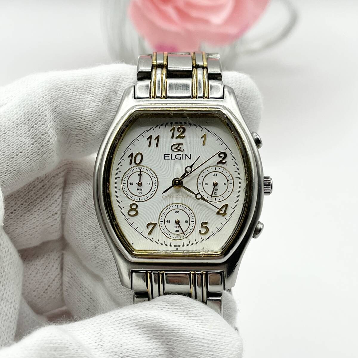 《稼働品》ELGIN★エルジン★クォーツ 腕時計★クロノグラフ★トノー型★メンズ★シルバー×ゴールドの紹介です!