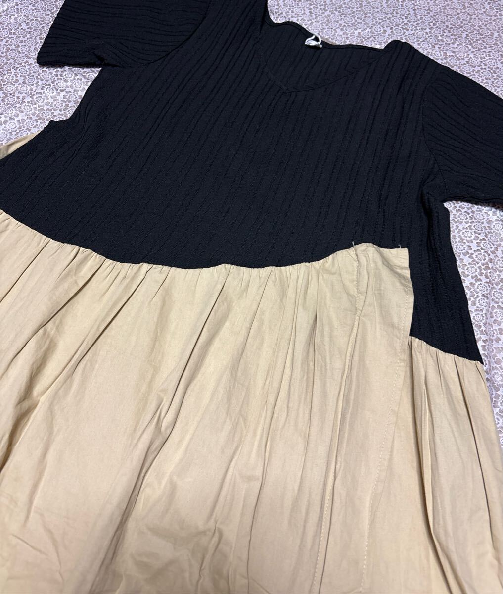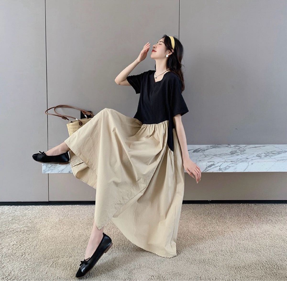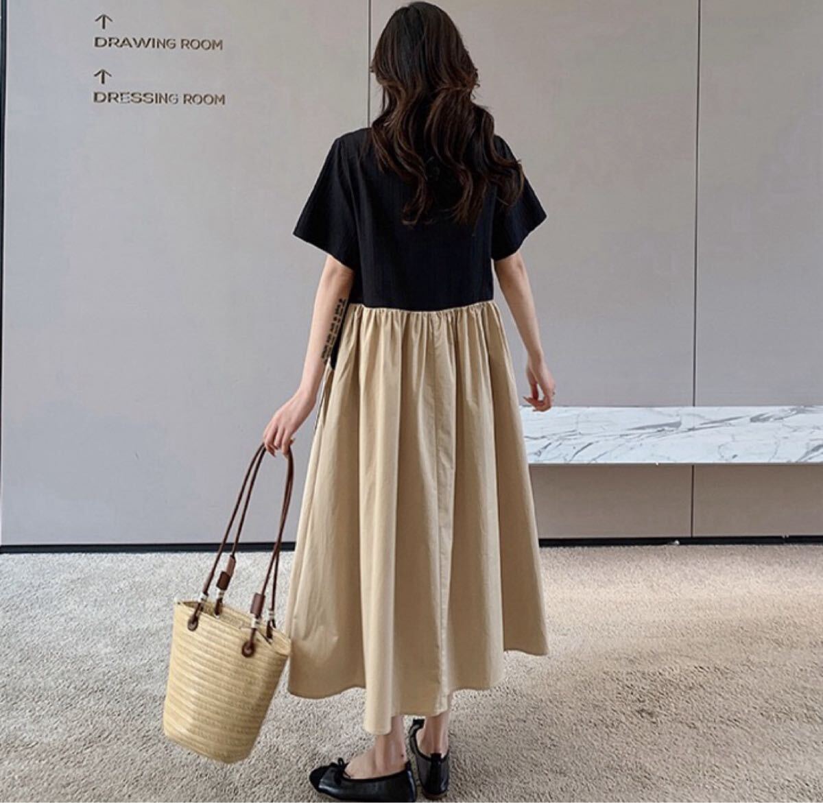 配色フレアロング丈ワンピース
