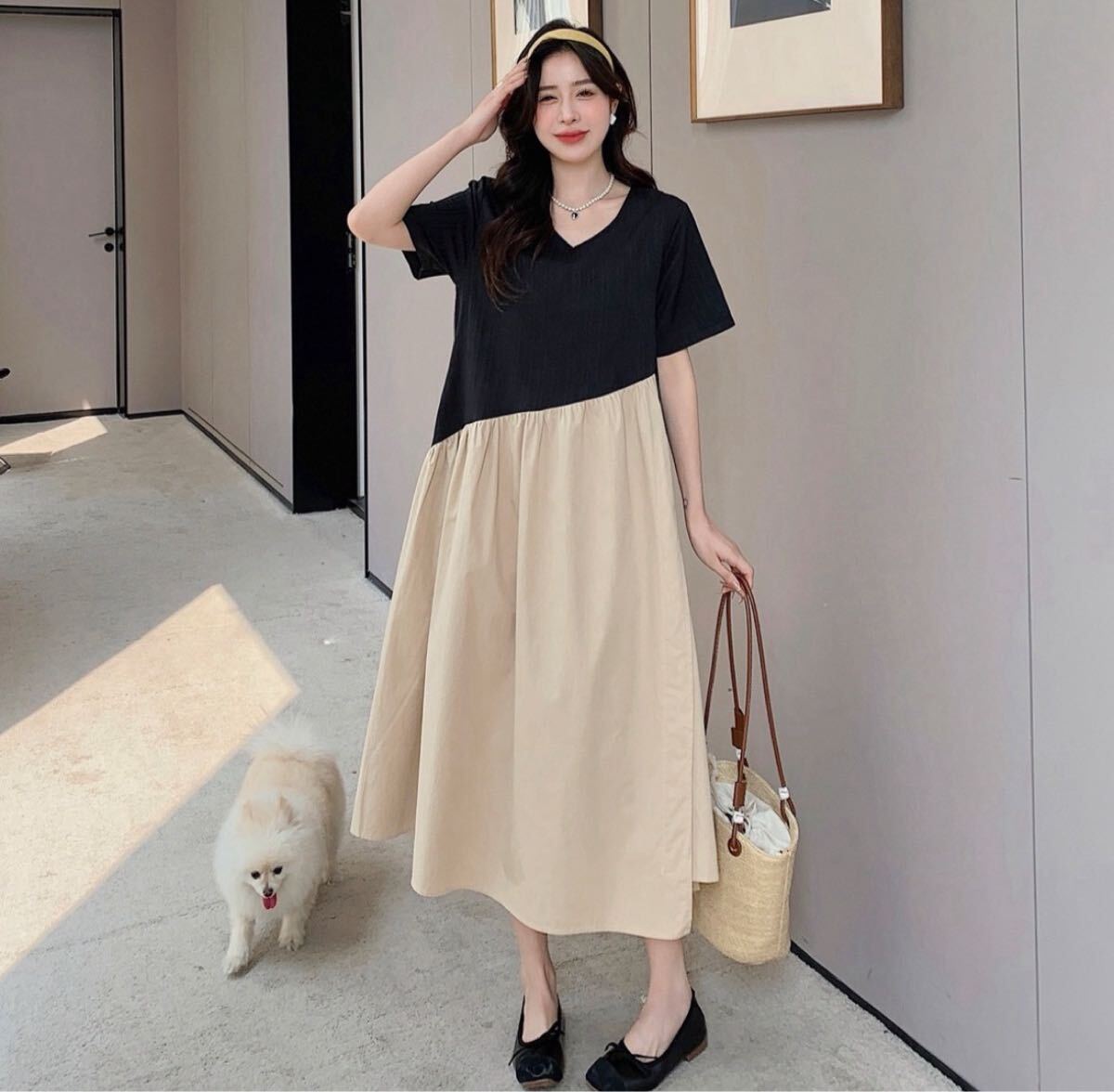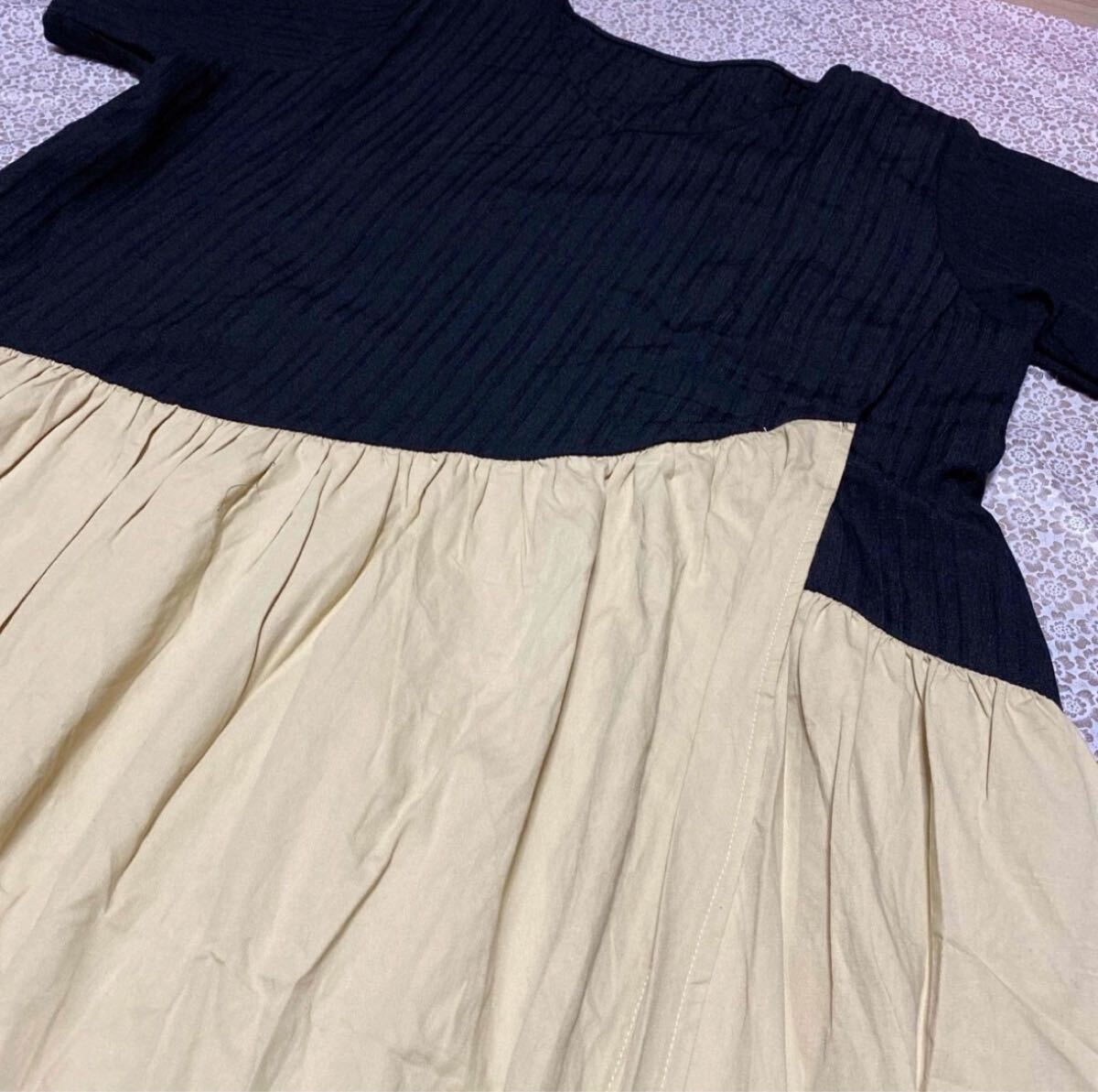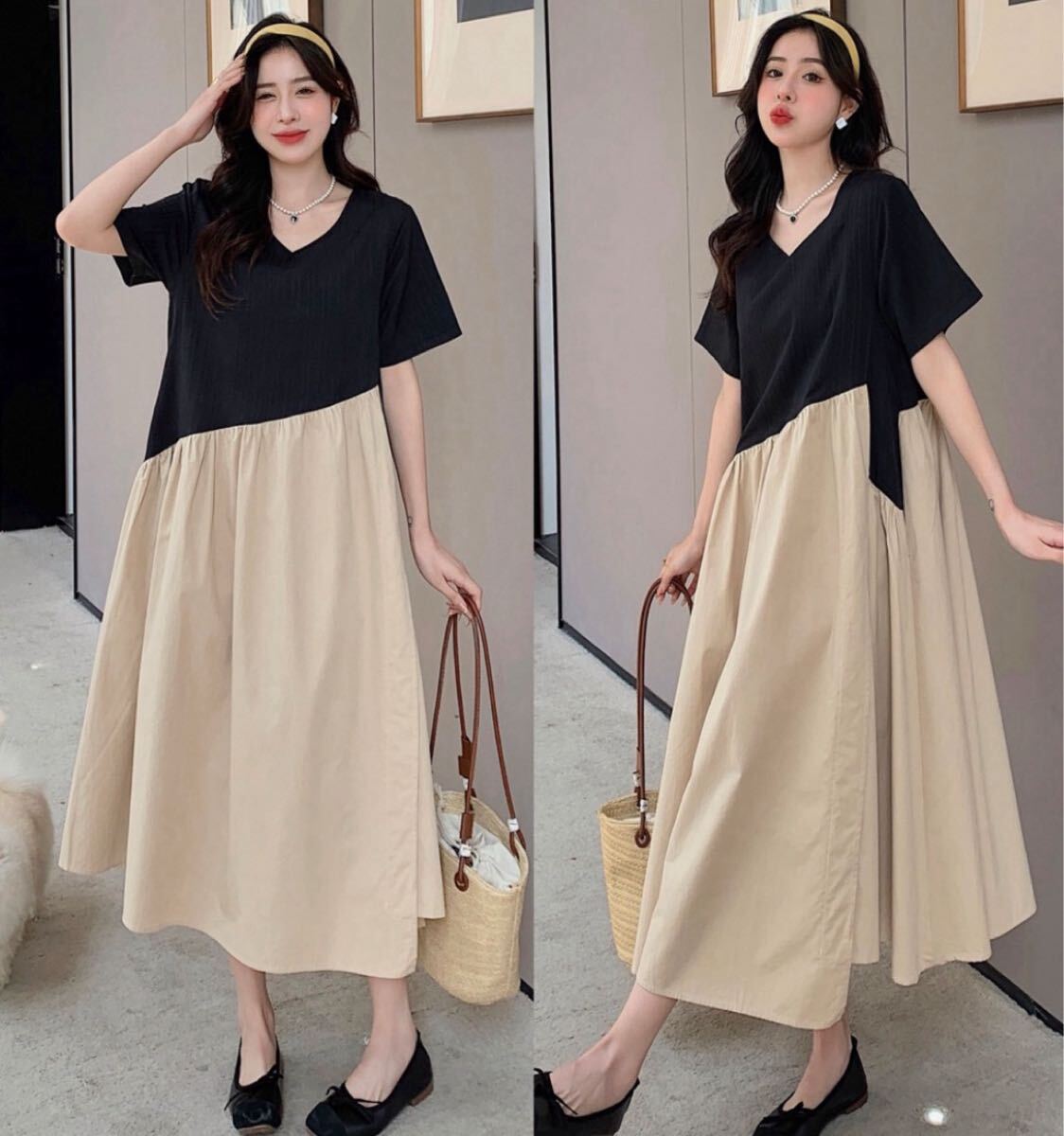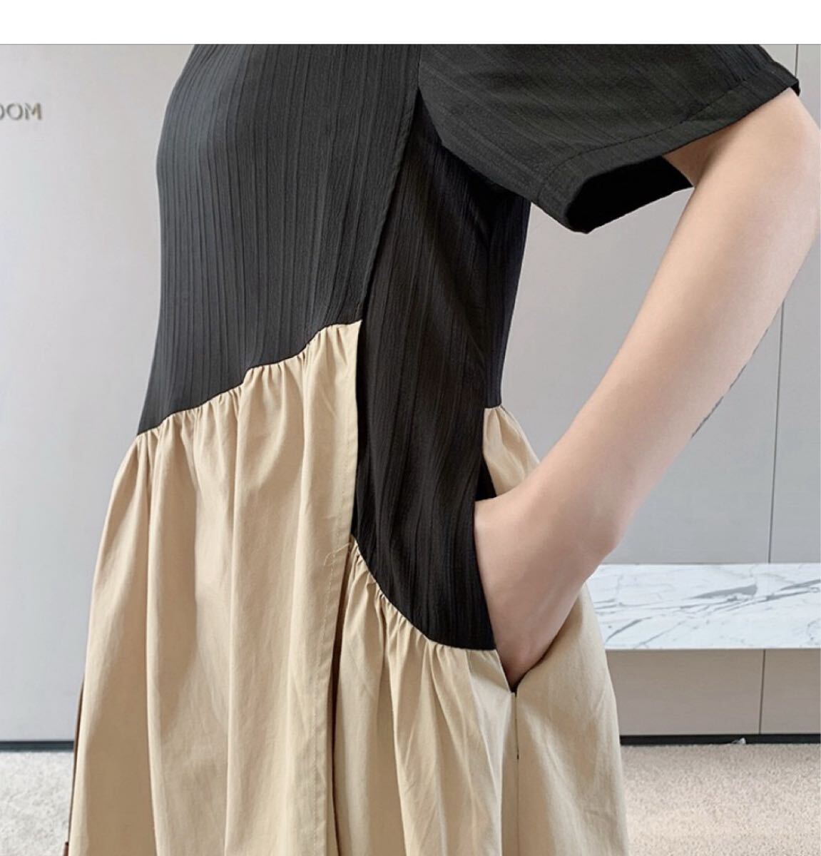 配色フレアロング丈ワンピース