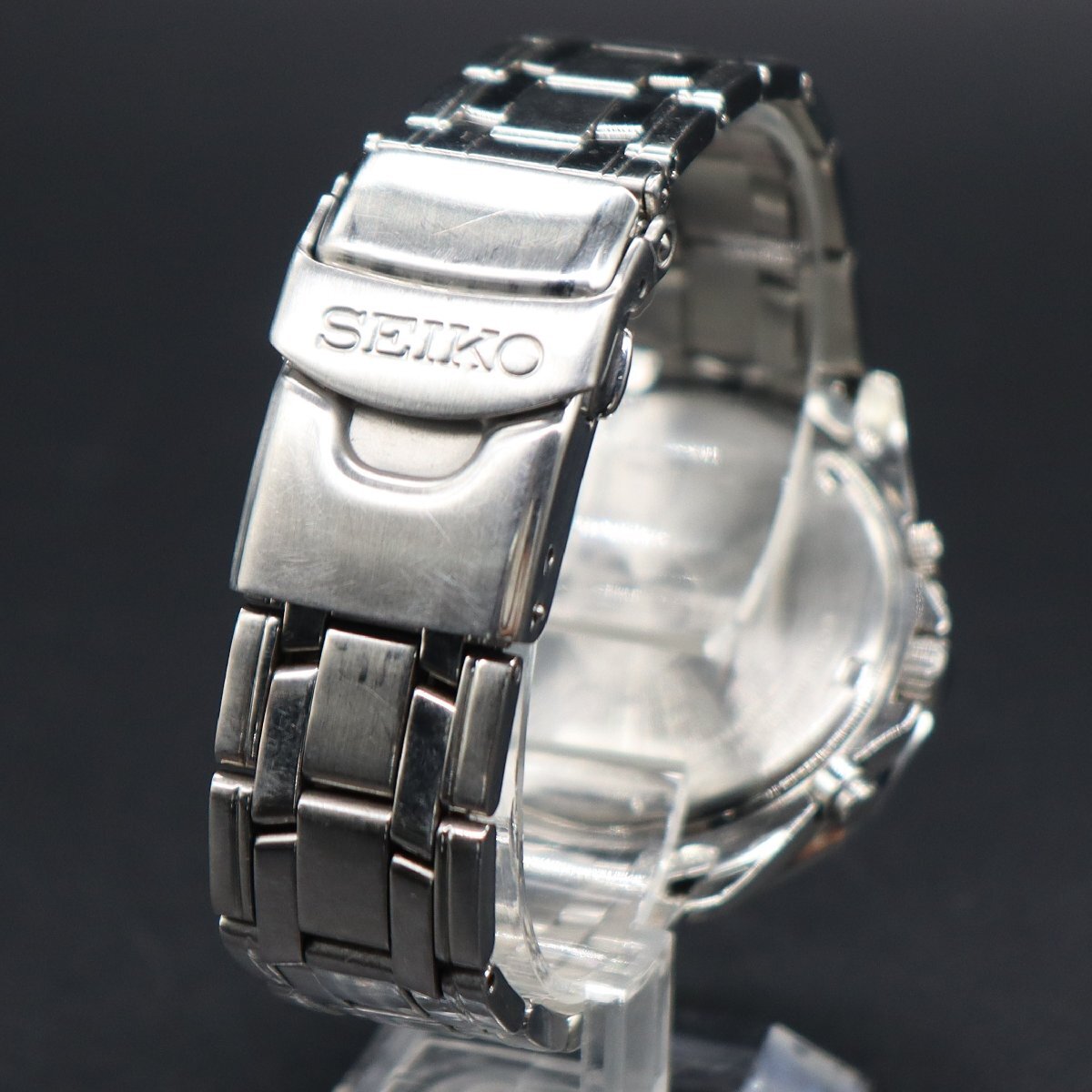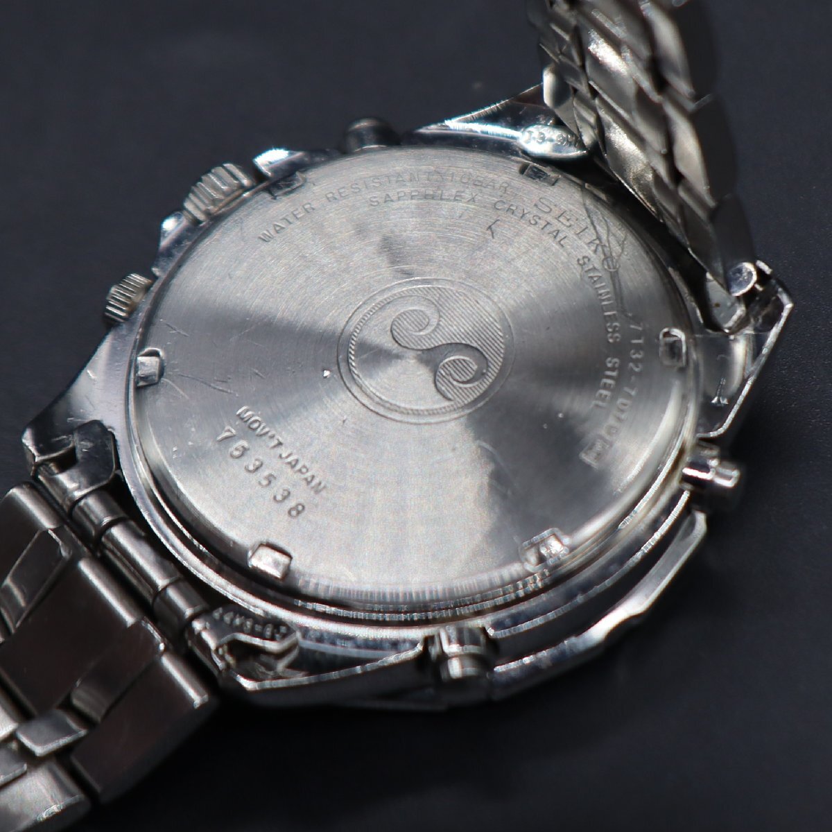 平置きで24時間動作確認済み、遅れなく稼働中です。 電池残量は不明です。 3時位置リューズ一段引きでデイト早送り、 二段引きで時刻調整が可能です。 ※詳しい操作方法は、「SEIKO取扱説明書」→「7T32」 で検索いただき、ご確認ください。 クロノグラフ、通常動作と帰針位置を確認済みです。 ・2時位置ボタン:スタート&ストップ ・10時位置ボタン:リセット アラーム、動作確認済みです。 4時位置リューズ一段引きでアラームON、戻すとOFF ベゼル含む全体に、使用に伴う小キズは見受けられますが、 風防フチに僅かな小カケ程度で、他、キズなくキレイです。 文字盤は目視で目立たない小汚れ程度で、 針・インデックス・植字ロゴキレイです。 プリントロゴや印字も鮮明です。 夜光、全て光ります。 ベゼル回転軽快です。 裏蓋、線キズ・スレございますが、刻印良好です。 ブレス、小タレ・スレございますが、 バックル、SEIKOロゴ付きで開閉良好です。 状態について、詳しくは画像にてご判断願います。 |