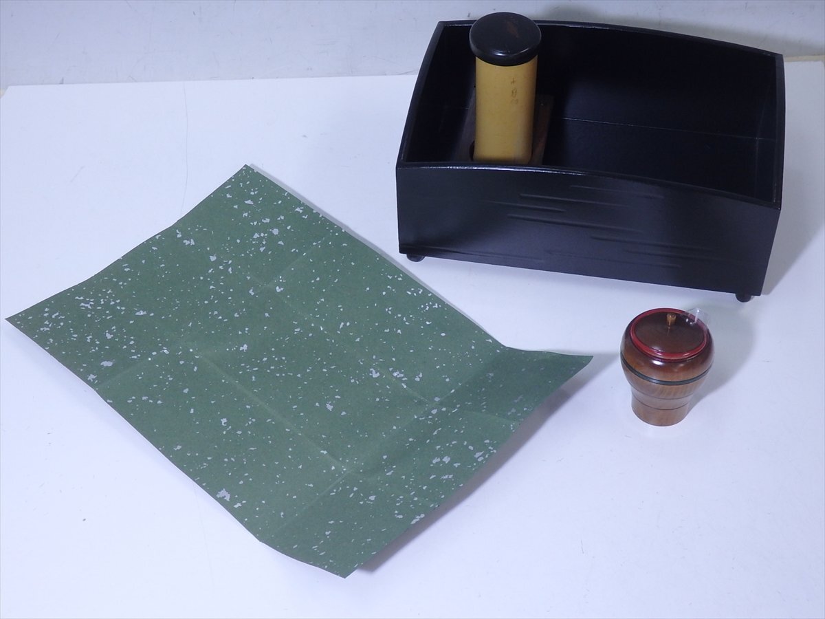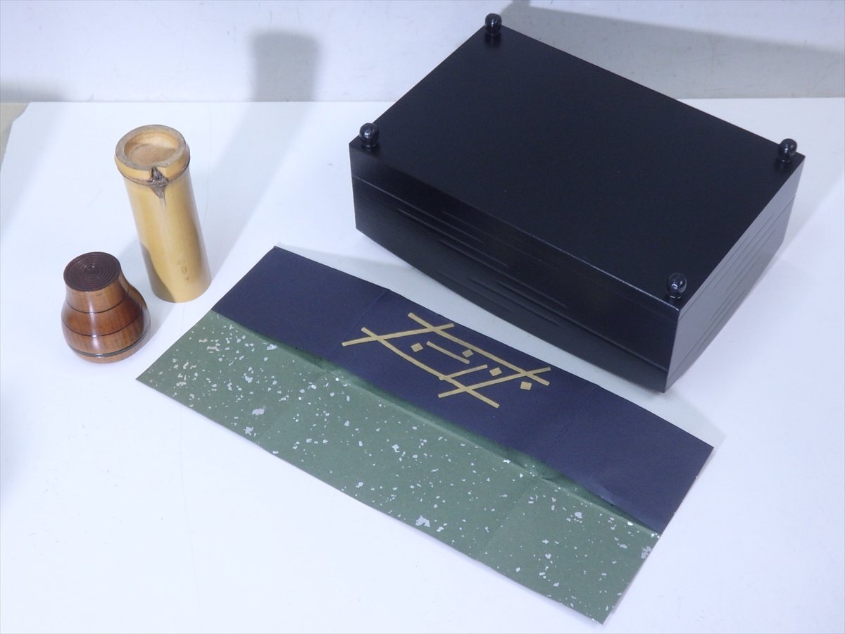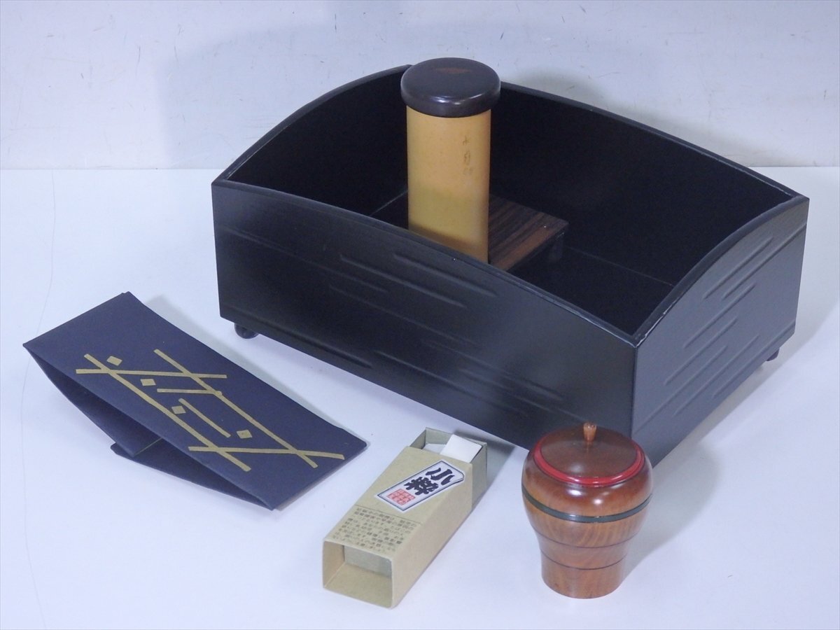 ★松永三喜三作【櫛形煙草盆 小物付き】粒足 一閑塗 如心斎好写 (独楽莨入・莨タトウ・灰吹・きざみたばこ付) 茶器 茶道具