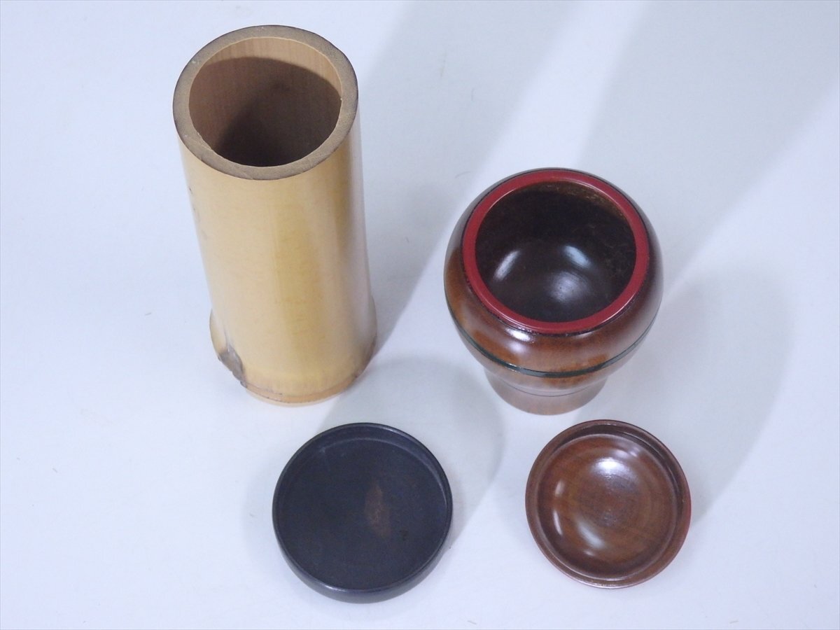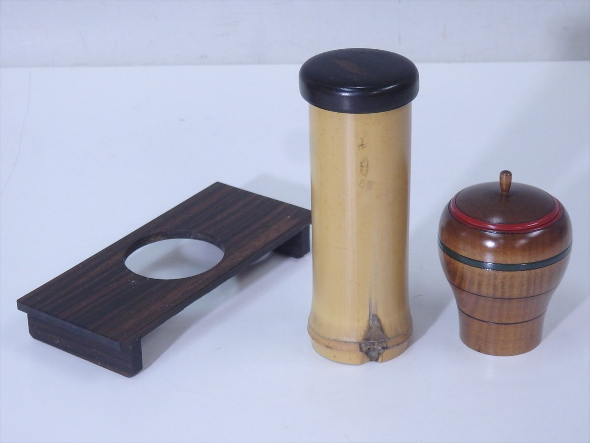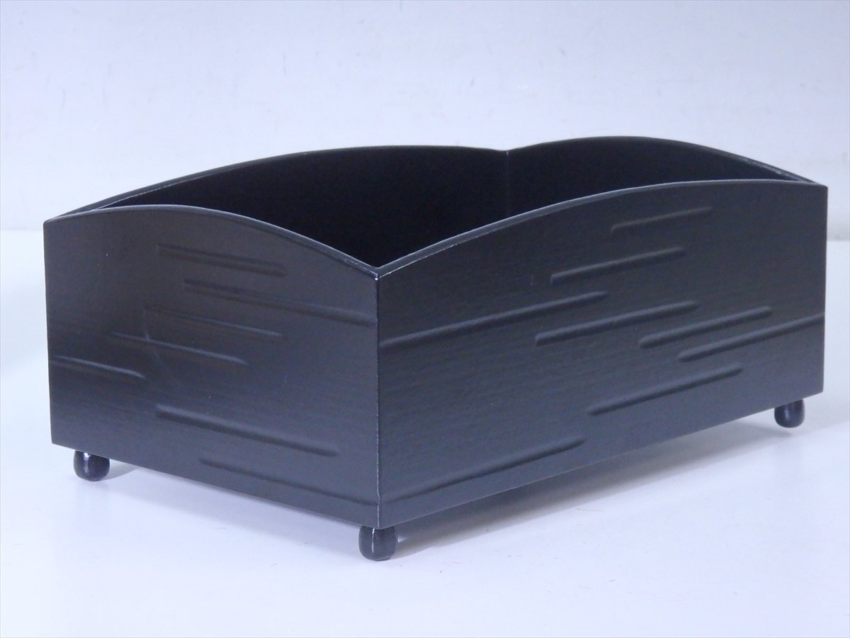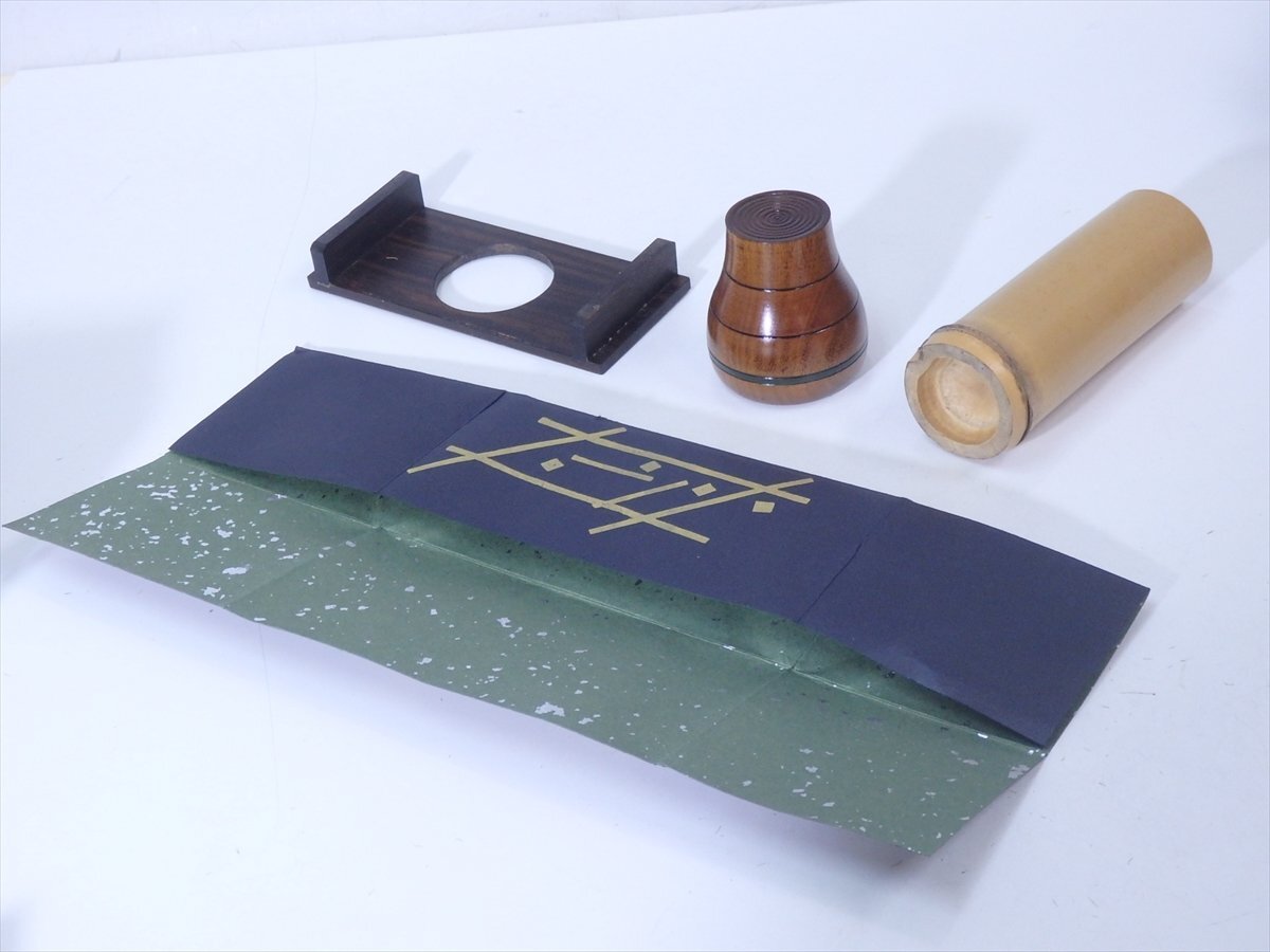 ★松永三喜三作【櫛形煙草盆 小物付き】粒足 一閑塗 如心斎好写 (独楽莨入・莨タトウ・灰吹・きざみたばこ付) 茶器 茶道具
