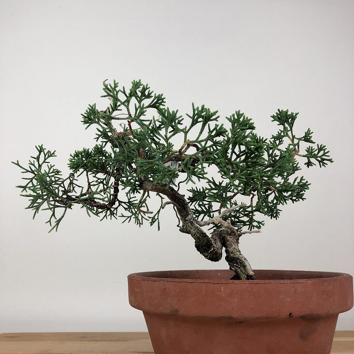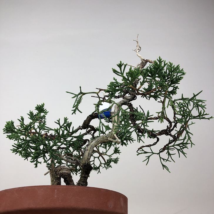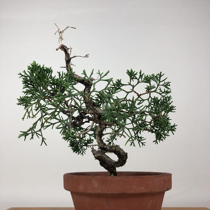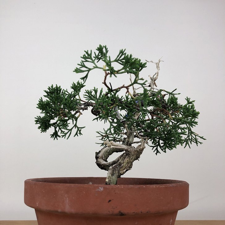 | ■植物ですので撮影時期や季節によって剪定などの手入れにより写真から変化がございます。撮影日をご確認のうえ、ご注文ください。 ■年に一度、冬頃にジン・シャリのお手入れをおこなっています。薬品の関係で黄色く変色しているようにみえる場合がありますが徐々に薄れていくので問題はありません。 【真柏盆栽】 シンパクの1番の特徴と言えば、短く締った紐状の葉と、わずかな水吸いでも生き抜くことができる強靱な幹枝です。自然界では積雪や強風などで押しつぶされ木部が露出し、朽ちて白骨化したものが見られます。枝の一部が白骨化したものを神(ジン)、幹の場合は舎利(シャリ)といいます。 |